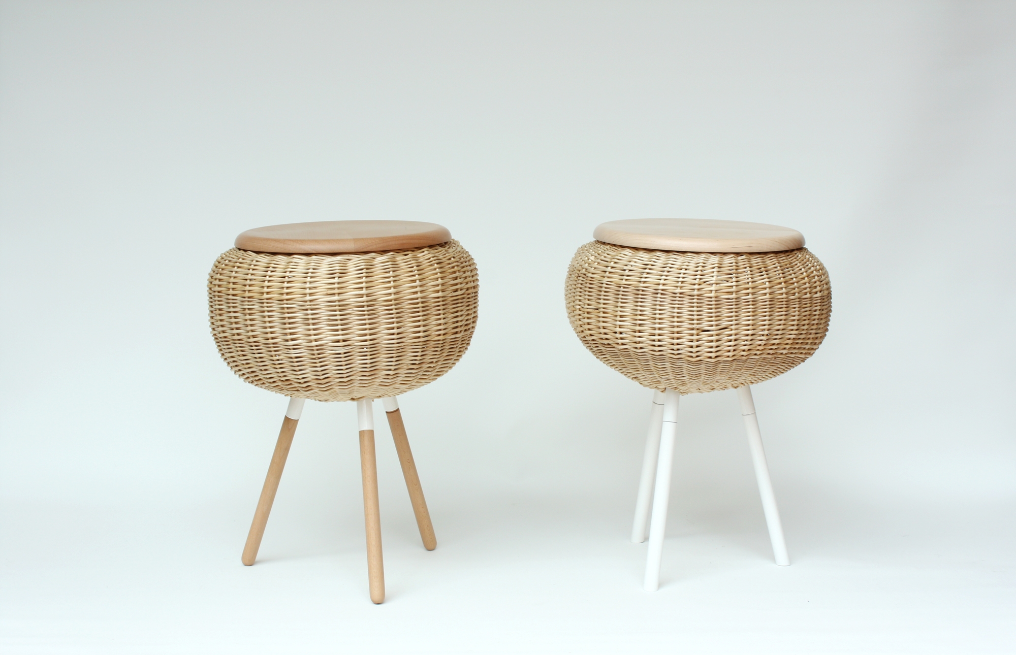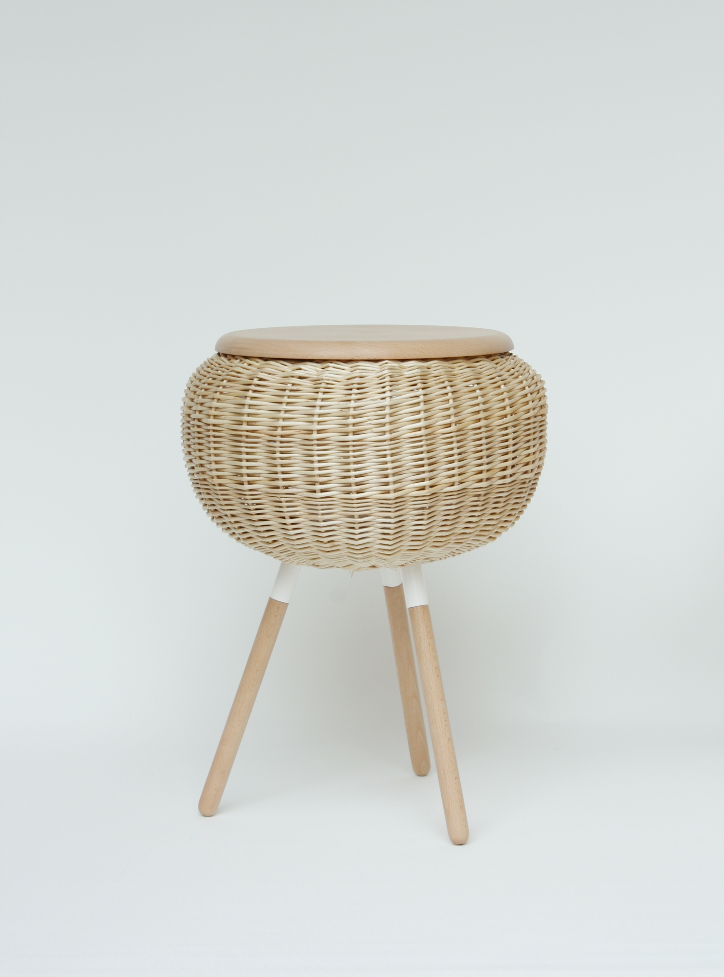 With this piece, we study how to give a new condition to the traditional mimbre basket. In every spanish house there is a mimbre basket to keep the sewing tools, toys, towels or any other object that can be stored in a basket. They are very useful, and very often, we lay them on the floor or on a table while using their content. But, for obvious reasons we never sit on them. Until now. Just by adding a wooden lid and an internal structure to which three legs are fixed, we get a basket-stool that can achieve different heights by changing its legs’ length. So with Thumi, not only no surface is needed to lay the basket on, but also it can be used as a seat.