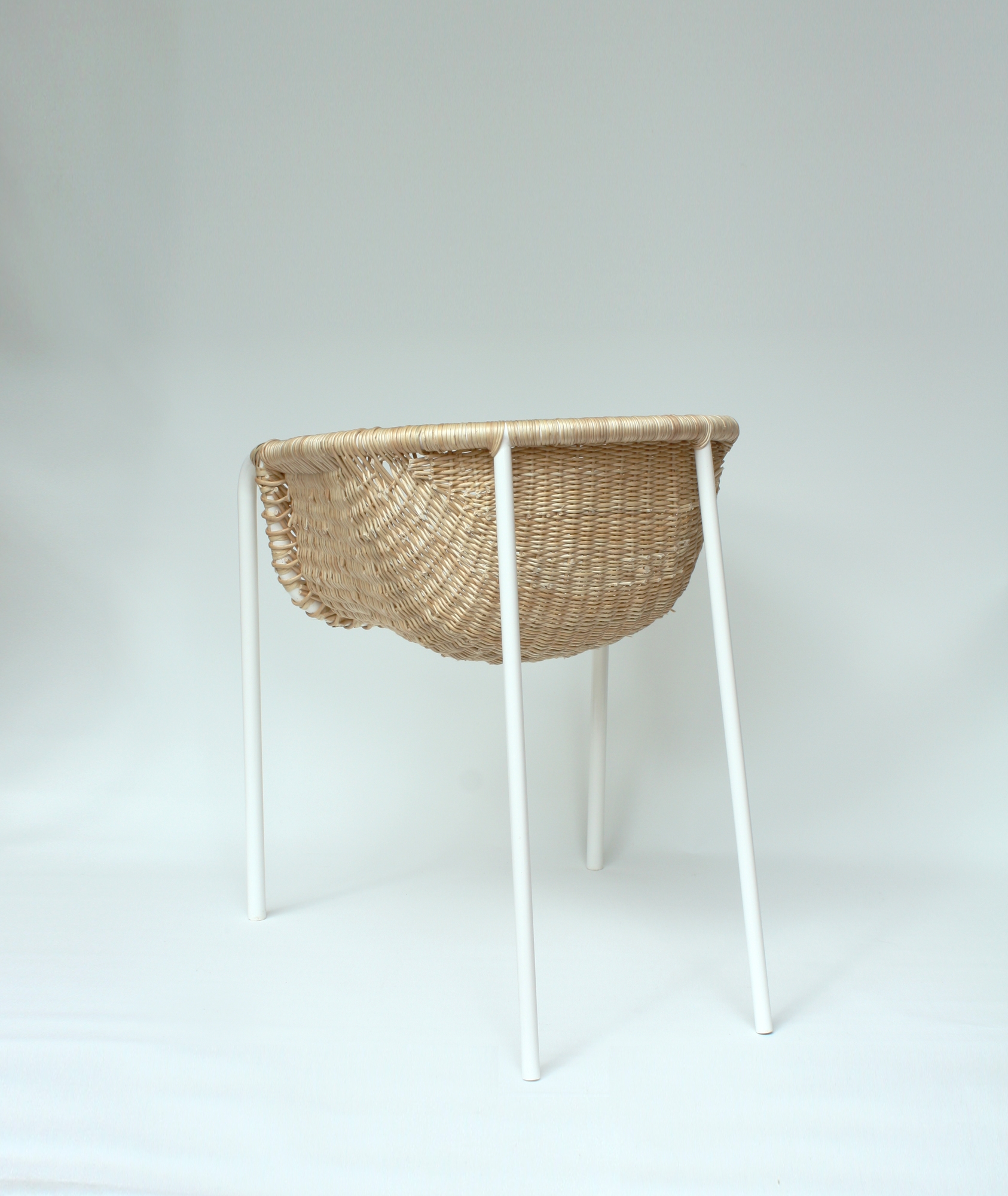 Duler is a chair with a very simple continuous metallic structure, that forms the legs and the back, from where the seat is hanging. The idea was to create a single shell of mimbre, woven in a way that allows the seat and the back to be a continuous structure as well. The most special issue about this chair, and the most beautiful at the same time, is the complexity of the weave, and how it meets the structure.