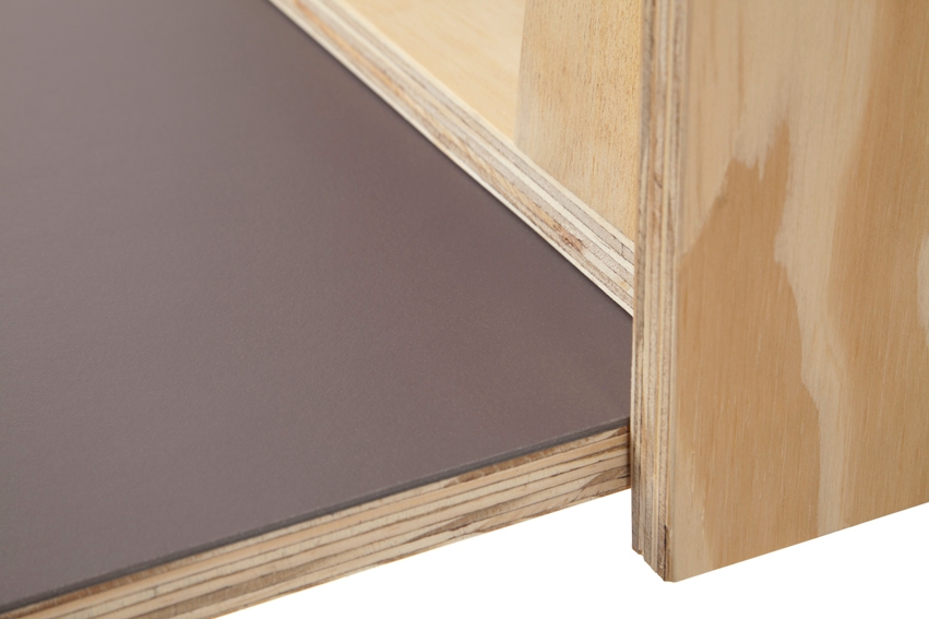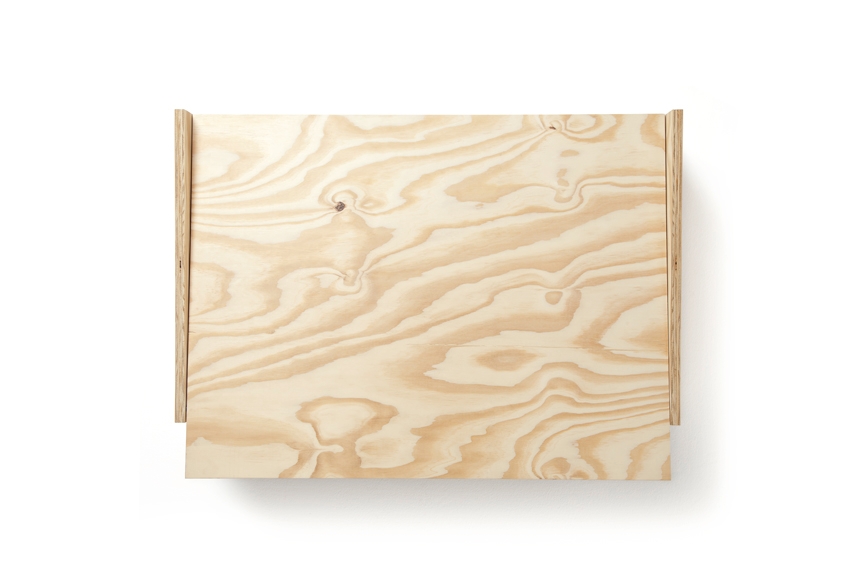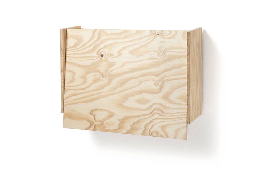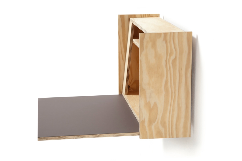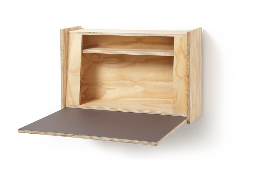 Aus dem Holz von Transportkisten gefertigt: Jede Gehäuseplatte dieses Wandsekretärs fällt unterschiedlich aus, die Maserung wirkt wild und die Kanten sind rau. Die grob strukturierte Holzoberfläche steht in einem spannungsreichen Kontrast zu der Arbeitsplatte aus feinem Linoleum. Ideal für Räume mit wenig Platz, da REDAKTEUR beispielsweise im Schlafraum oder Flur einen kleinen Arbeitsplatz ermöglicht. Und schneller als durch Hochklappen lässt sich ein Schreibtisch kaum verstauen. Der verbleibende Korpus ist ausreichend tief, um Aktenordner und einen mittelgroßen Laptop unterzubringen.