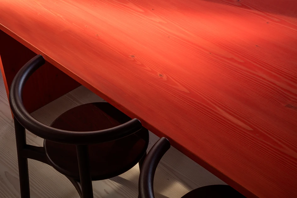 To temper the impact of the historical features Thulstrup chose furniture in contemporary shapes and finishes. Custom pieces include a minimalist 18-seater table made of Dinesen Douglas planks stained tomato red, a metal daybed and a coffee table in folded metal steel with a yellow-zinc opalescent coating.