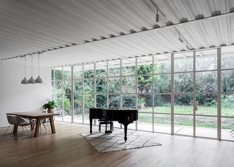 With its traditional A-frame elevation the house borrows the language of mock-Tudor ubiquitous in the suburbs, and turns it on its head by expressing it in a steel frame – the materiality of modernity. The inherent strength of the steel exoskeleton permitted a thinning of the structural steel, which helps to express the pitched form diagrammatically as if it were drawn by a child. In the garden elevation, Crittall-style glazing offers a contemporary twist on the leaded windows synonymous with the mock-Tudor genre. These materials are combined with slurried brick infill panels, another nod to mock-Tudor building techniques.