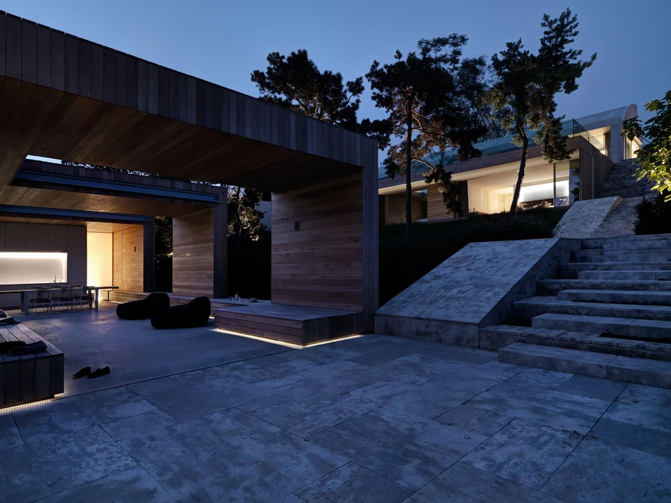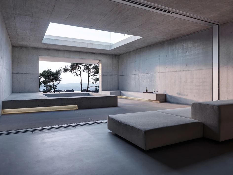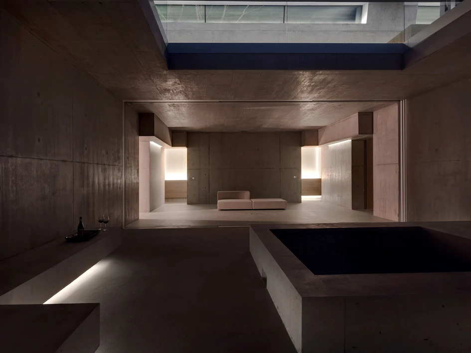 The house " dos verandas " is a volume of concrete which forms a large living area. A patio is connecting the subsoil with the dormitories. Indoor and outdoor is fluently. The elements from raw materials such as concrete, travertine stone and wood are accented with indirect light. The light draws the room and makes the atmosphere.