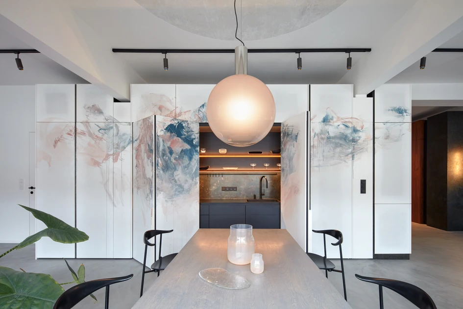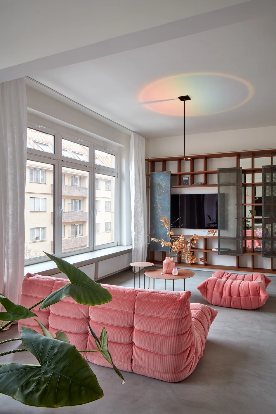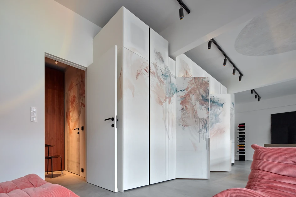 The architect designed a large, atypical furniture block permeating the entire apartment and containing everything needed - at the entrance, two utility rooms, and a wardrobe; the mass continues further through the space, hiding storage spaces, concealing the kitchen behind bifold doors, and accommodating two smaller bathrooms. The rest of the apartment was left simple, complemented only by a few artistic solitaires. The envelope of the atypically designed block became a large-format canvas, perfectly envisioned by the artist Klára Spišková. Her strong painting contrasts with the backdrop of raw MDF boards, giving the whole a unique energy. The apartment shell reflects the original spirit – it remains sober white, almost gallery-like. Only a subtle rosy touch flows through the space, gradually transforming and peaking at both ends of the apartment: in the living room with raspberry-coloured sofas and in the bedroom, mingling with shades of apricot and vibrant crimson, appearing on the curtains by Linda Kaplanová. Linen textiles of two roughnesses flow around the soft arc of the bed, separating the sleeping area and subtly tinting the penetrating light. The gentle expression of the bedroom is contrasted by the edges of the lighting fixture by Ingo Maurer and the photographs by Bet Orten. The bedroom can be separated from the rest of the space and closed off by a mobile partition.