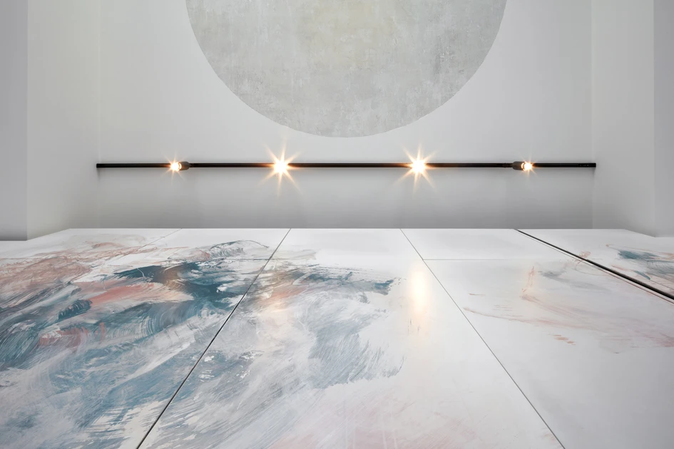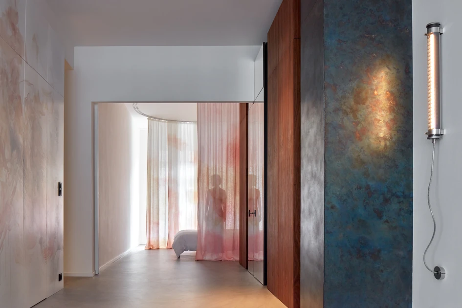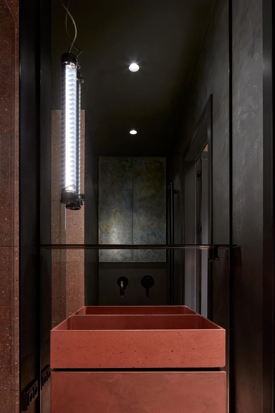 The delicate rosy tones are juxtaposed with metals used on large-scale elements. This concept of "softness and roughness" is reflected both in the whole and in the detail of the interior. The colour concept is further complemented by the theme of inside and outside - the interior of the block is darker and more grounded. The reddish tone transforms into a dark brick to terracotta colour in the bathrooms, with the ambient light enhancing their warm impression. The design accentuates connectivity (spatial, material, colour) and works with long vistas through the space, further deepened through reflections. Views and the large, interconnected space are the most generous moments of the apartment.