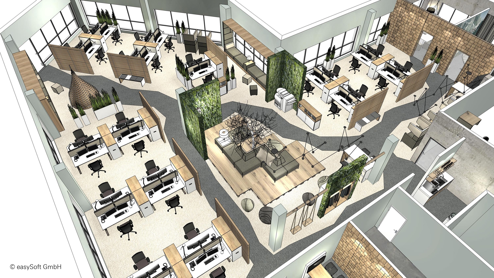 easySoft belongs to the most attractive mid-sized employers in Germany, as the award "Top-Employer 2014" shows. So it was no wonder that the management wanted the staff to feel well in architecture, structure and ambience of the new environment. The interior architecture concept from Febrü is based on openness, communication, team areas and rest areas. Various activities for the staff to relax, depending on workflow and technical equipment are provided. Already the entry area offers interesting perspectives: A remarkable climbing wall welcomes the staff members, customers and visitors.