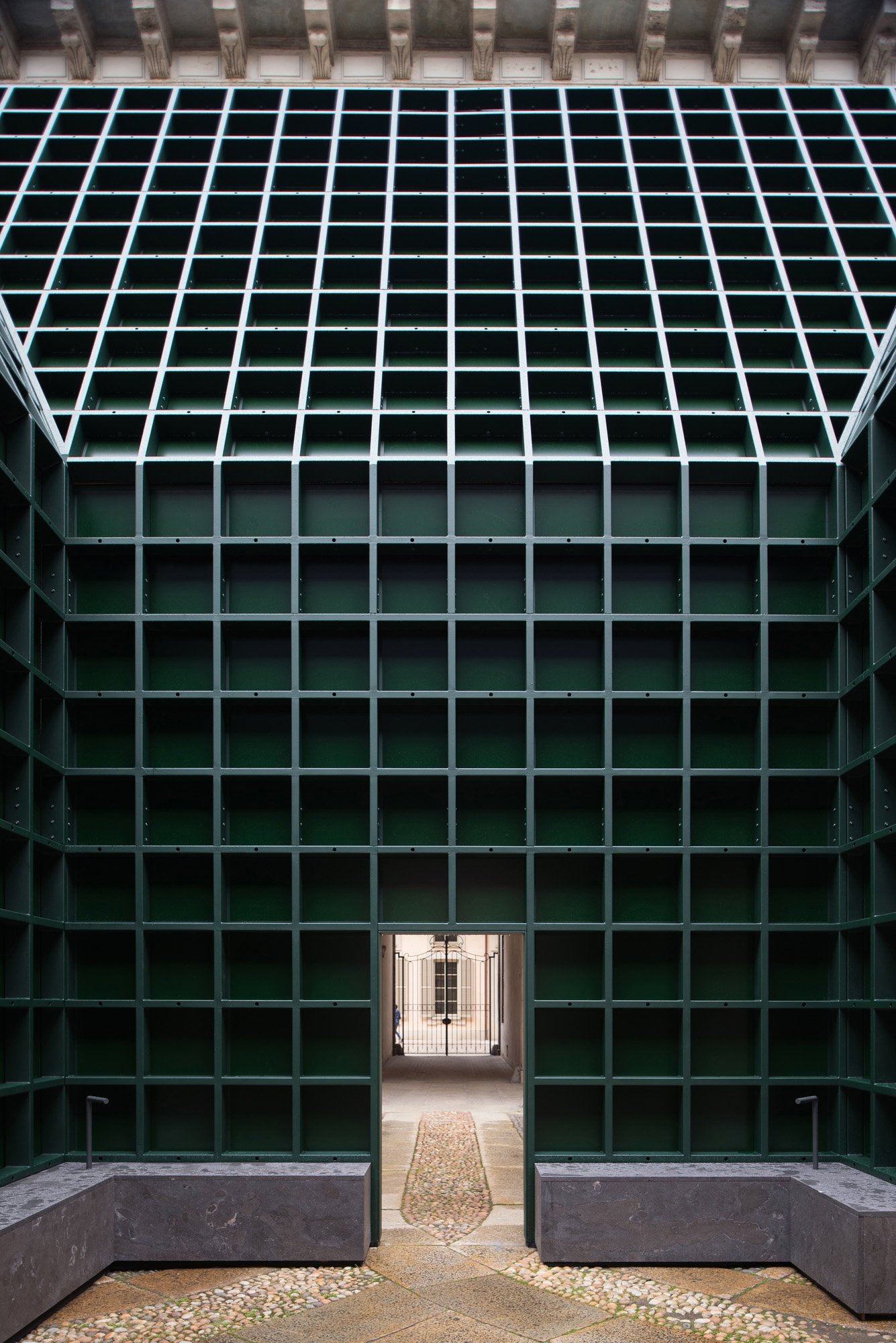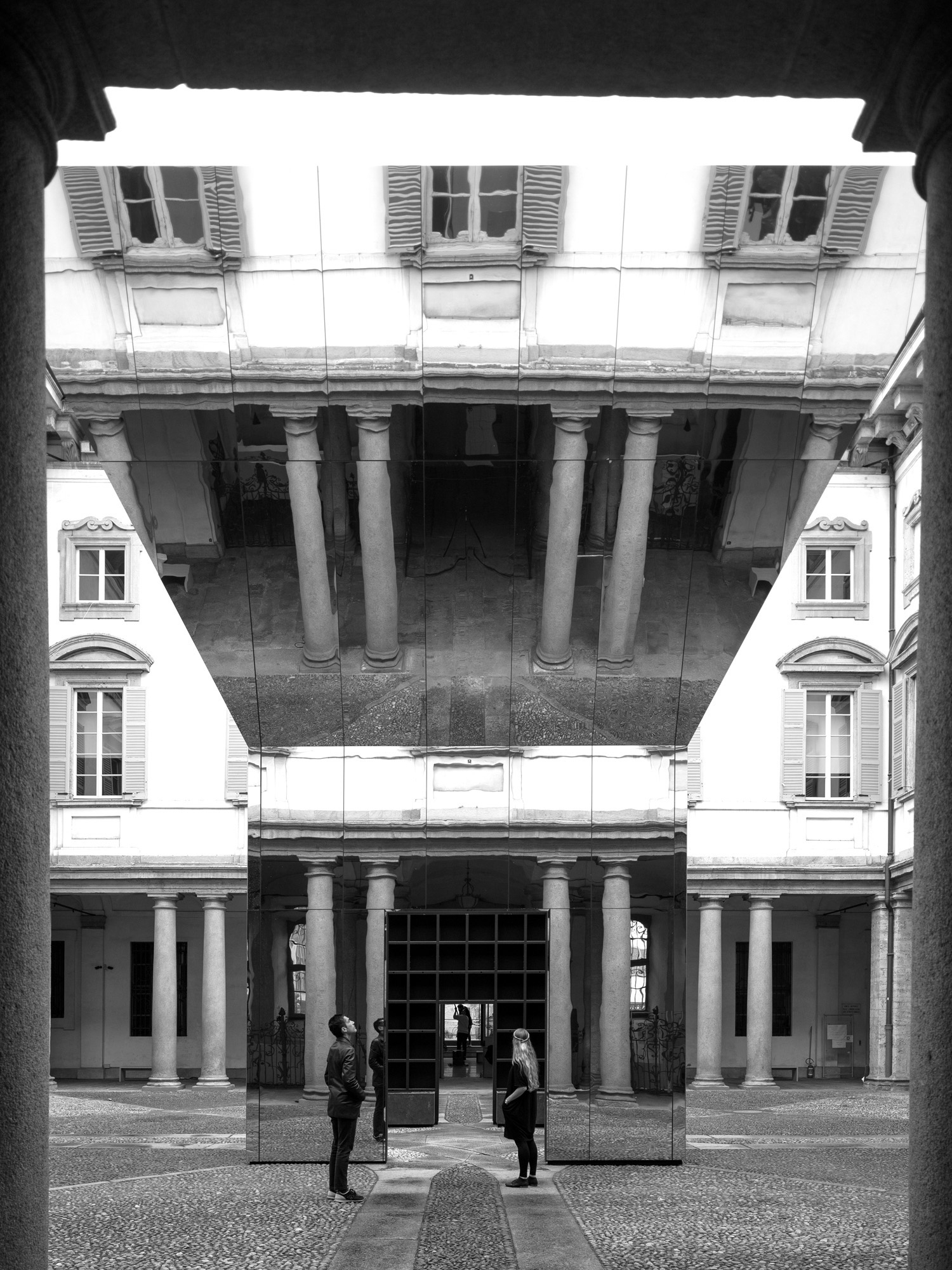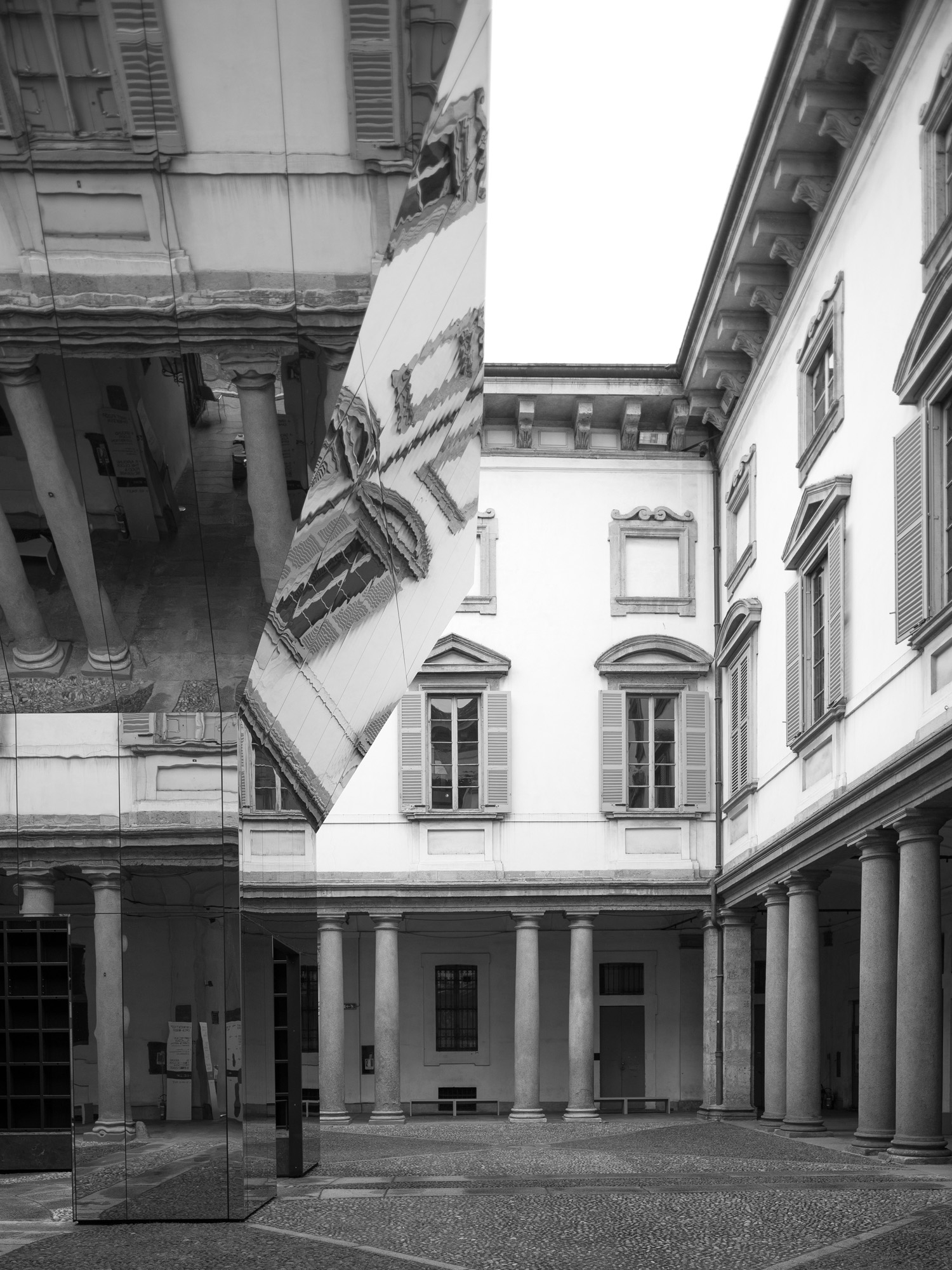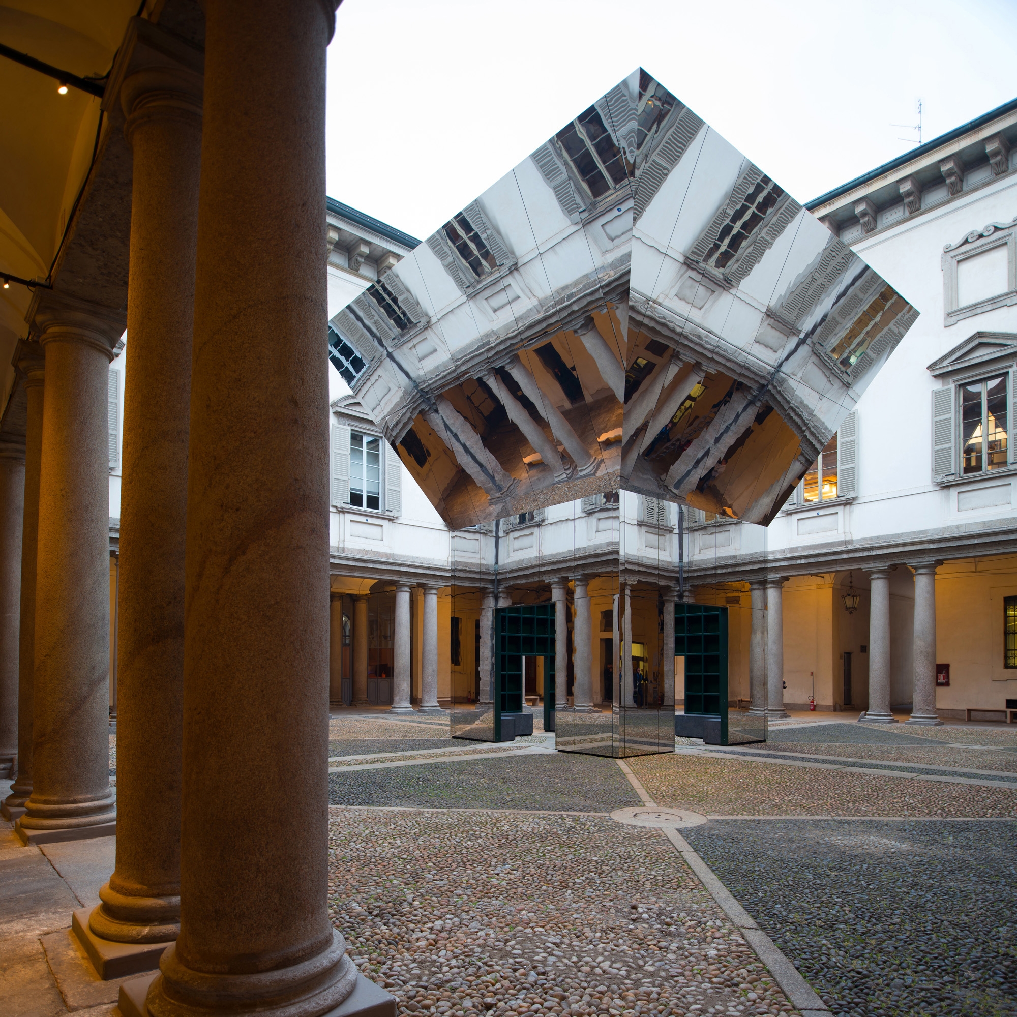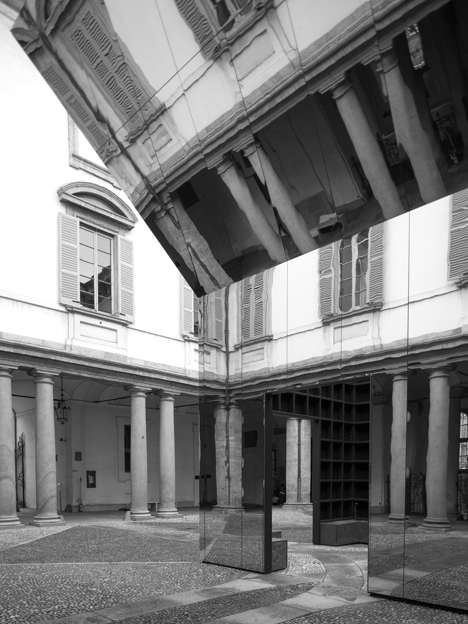 Faintly resembling the solitary nymph who could only repeat the last words spoken by someone else, the proposed pavilion is a direct echo of its historical surroundings. The building is both receded and expanded, visible and invisible, solid and ethereal. It is a deceiving object, a figure that resonates with the dimensions and proportions of the existing baroque palazzo. This object is a magic open box (perhaps Pandora`s one) that repeats the square (1:1 ratio) of the courtyard, with a silhouette defining two levels: following the existing axis, the lower one is a compact central room (5m in plan) with four accesses and the higher one is an inverted pyramid extended symmetrically in every cardinal direction (10m in plan). The inclination of the higher stratum (1:2 ratio) is directed towards the perimeter of the courtyard. Since the material of the pavilion is polished stainless steel, both the vertical and the inclined planes become a mirror of the stone pavement, the colonnades and the corridor beyond. In its radical simplicity, the pavilion turns into an immaterial presence that, almost as in a fleeting mirage, captures the discreet beauty of the three hundred and seventy-year-old palazzo on its flat surfaces. If at ground level visitors encounter an unprecedented version of the monument, by looking up they see themselves reflected on an impressive tilted ceiling. Upon entering into the central room, into a massive steel grid frame, the weight of the historical architecture vanishes by an uninterrupted view to the ever-changing sky.