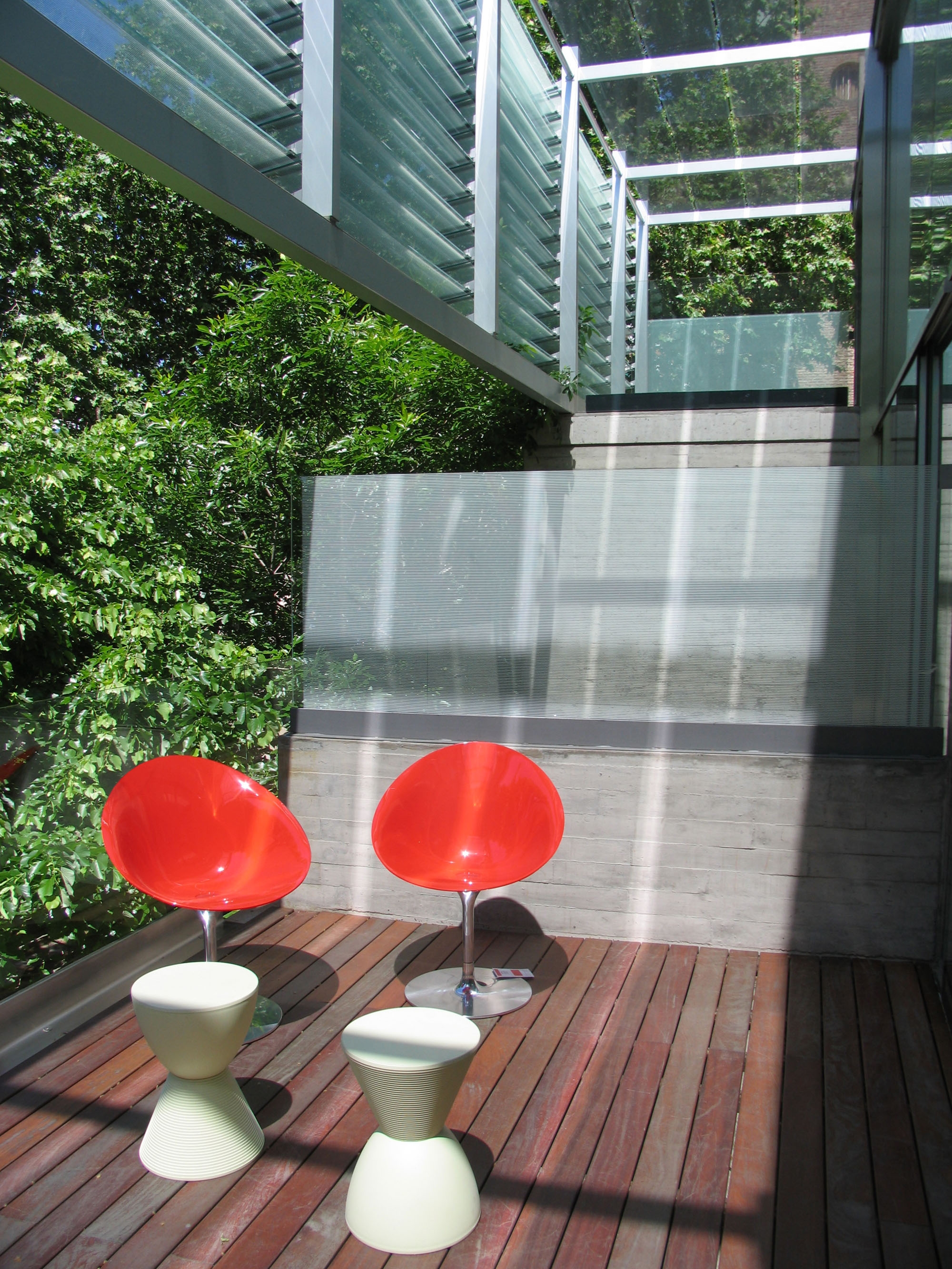The interior frosted glass divisions allow the light to pass from one room to the other and generate a reflections and shadows play that’s usually more frequent in commercial shops. These are also in composition with the solar shadings and the exterior and patio glass facades, which all constitute a series of veils that allow different types of light during the day.