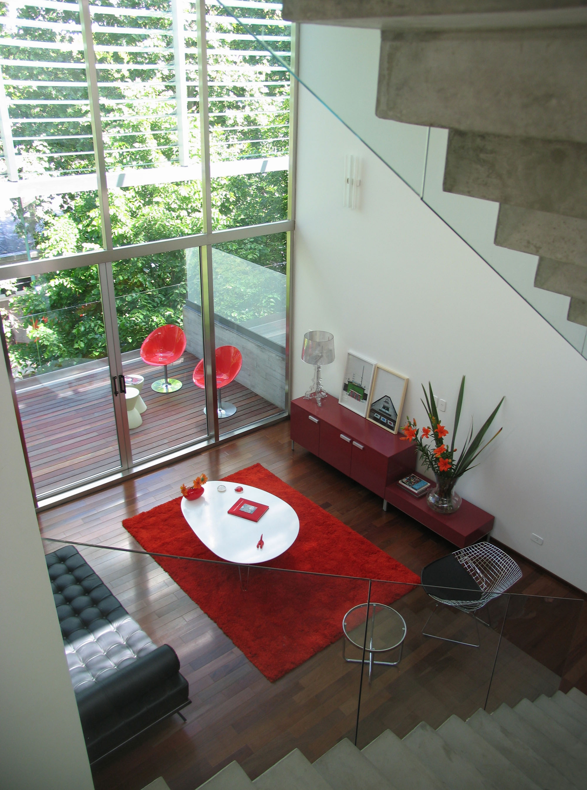 The eight units are organized in two levels, with the living room as a double-height space that connects them. Both the main bedroom and the living room have wide terraces in front of them, one overlooking the other, closed by glass sunshades that reduce solar gain and transform the façade into an intermediate space between the interior and the exterior: an outdoor space protected from the wind, the rain and the views from the sidewalk.