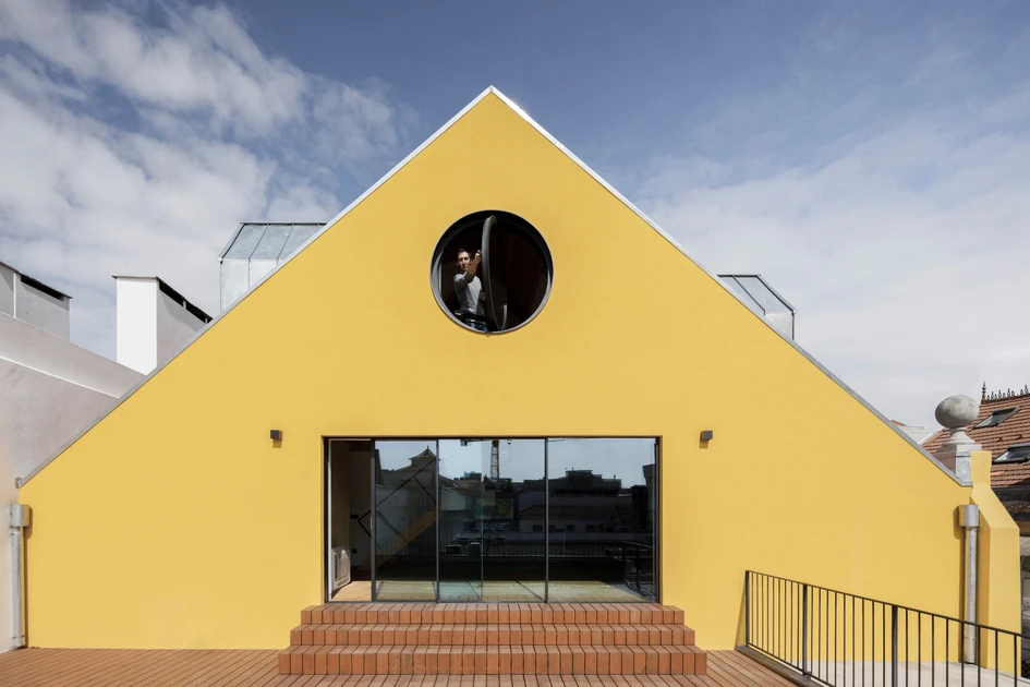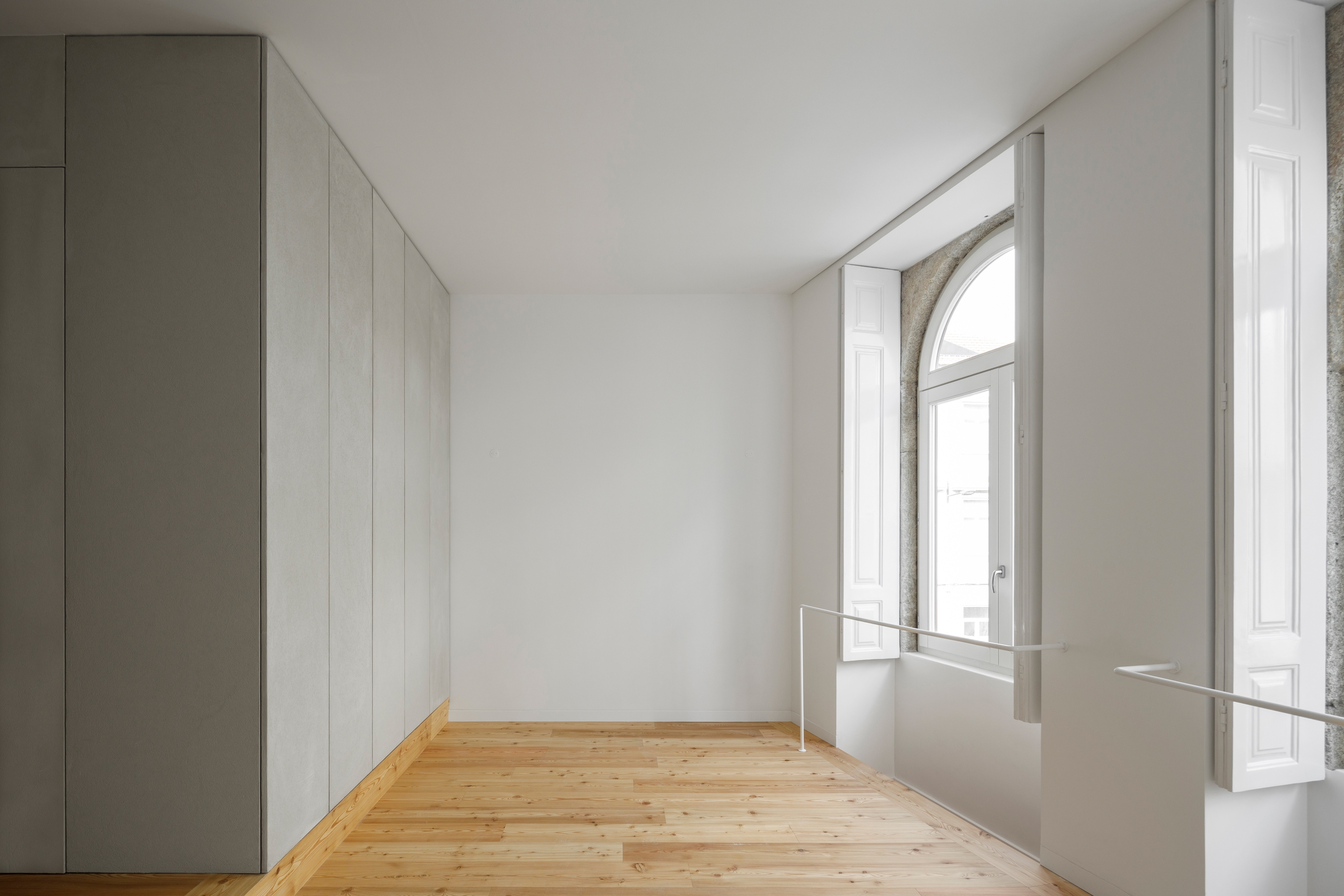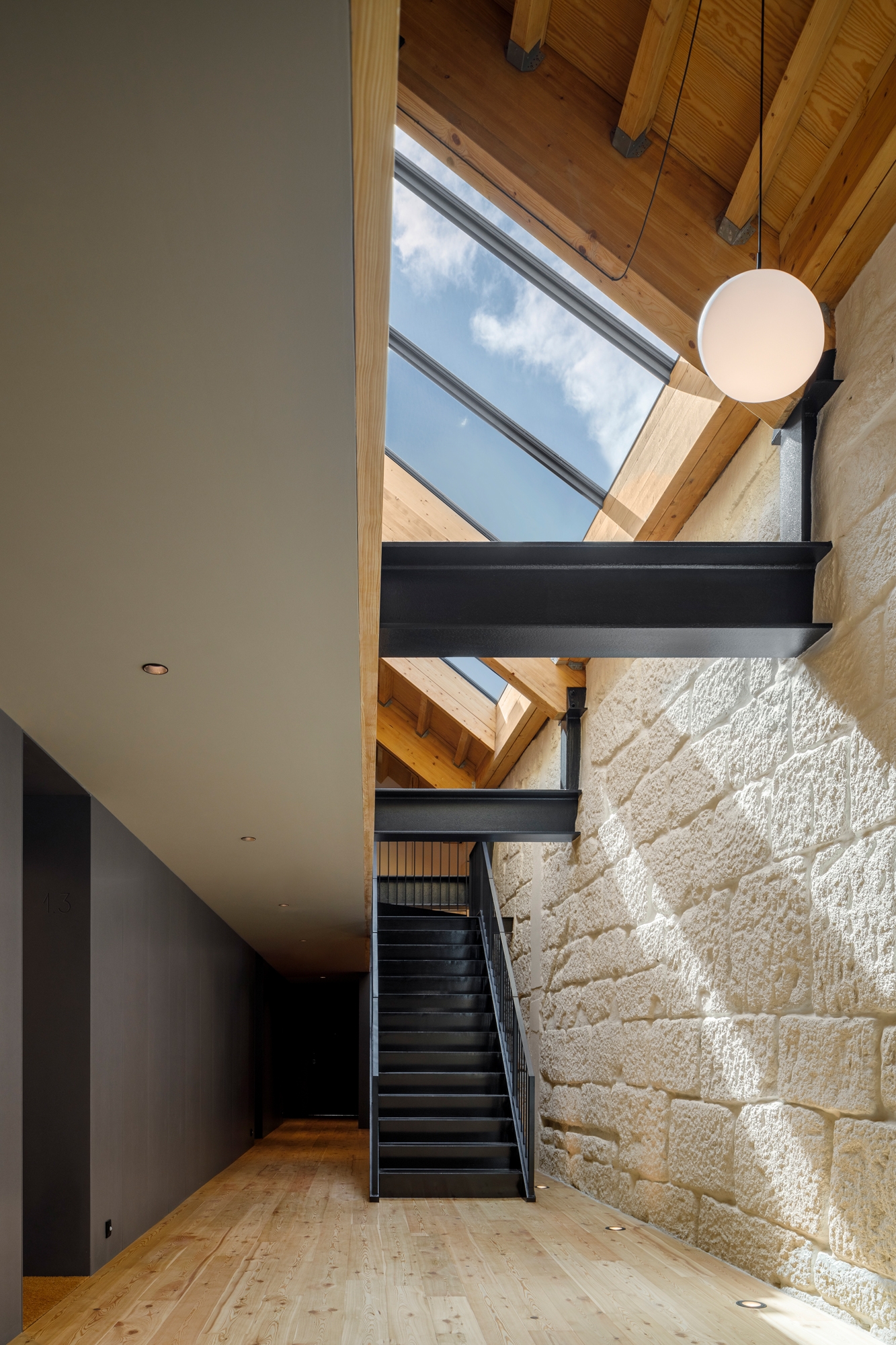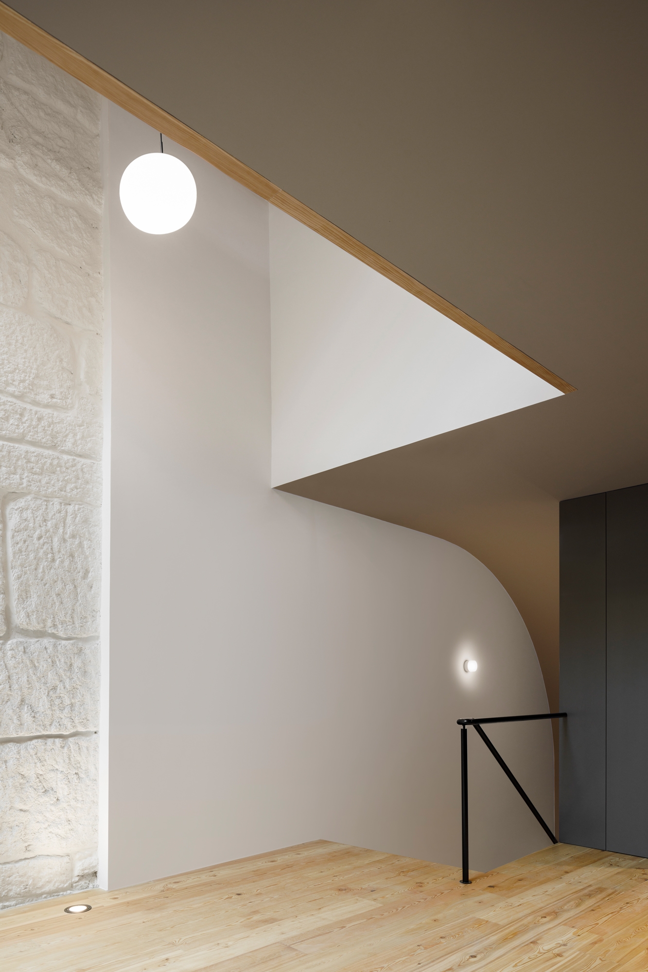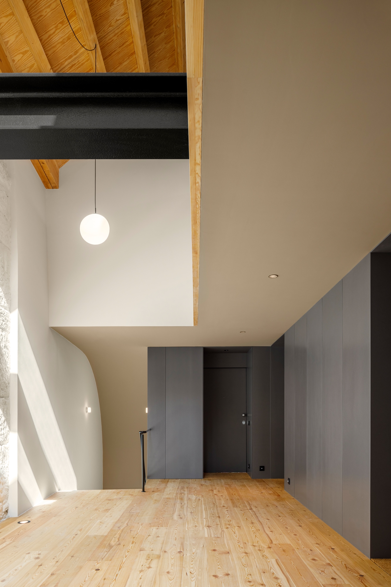 The inevitable programmatic transformation took into account the historical and architectural legacy of the original building that had resisted: the main and East façades were completely rehabilitated without any change, while the South façade, already very transformed at the time, gained prominence in the set, with a new color scheme and with the introduction of a round glass window that gives geometric balance to the whole set and reestablishes the communication with the surroundings. Inside, the essence of the old stone warehouse is maintained: after the uphill journey, with a similar morphology to the original, we are welcomed by a wide and extensive common area, full of natural light, which reveals the striking height of the internal space, completely imperceptible from the street.