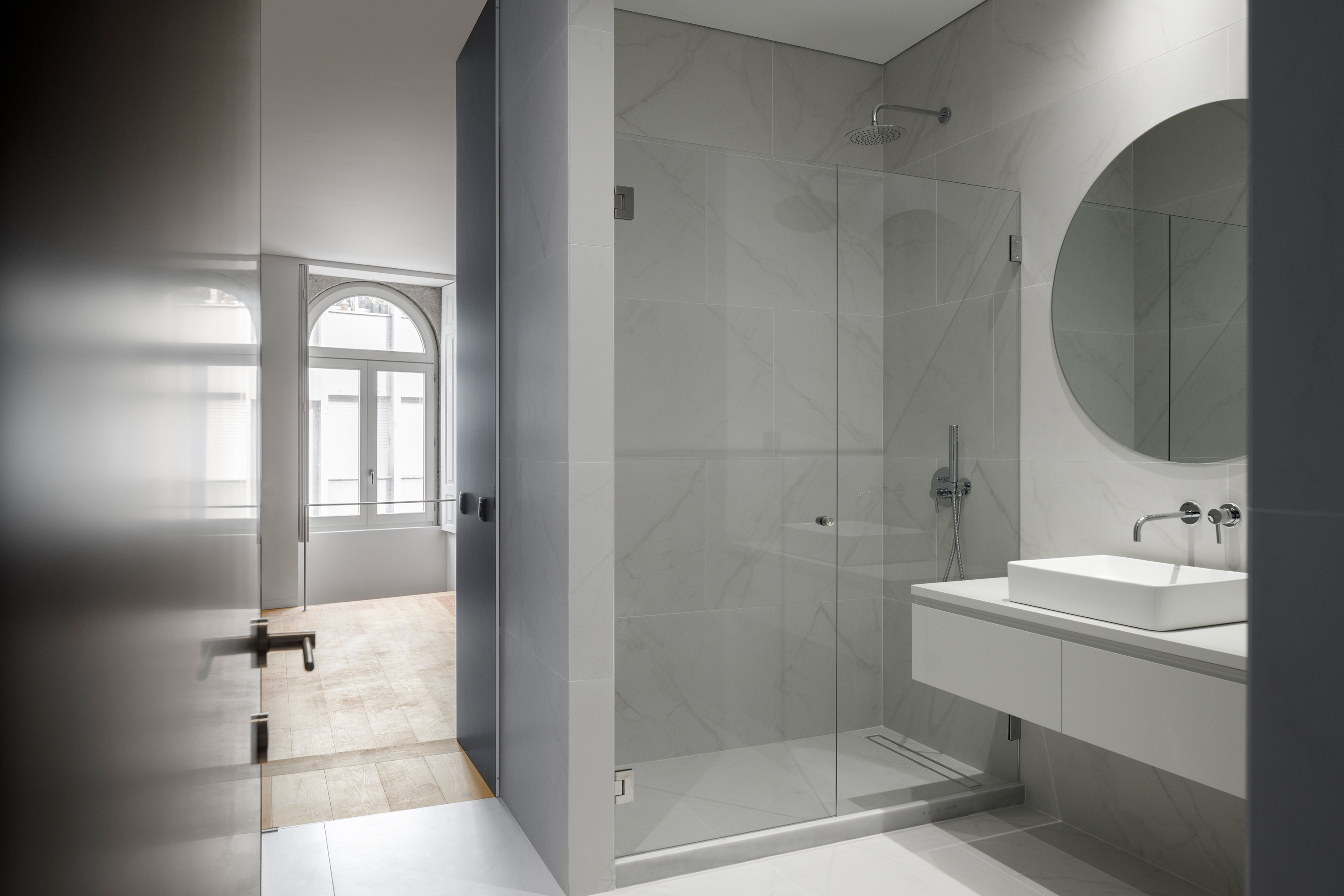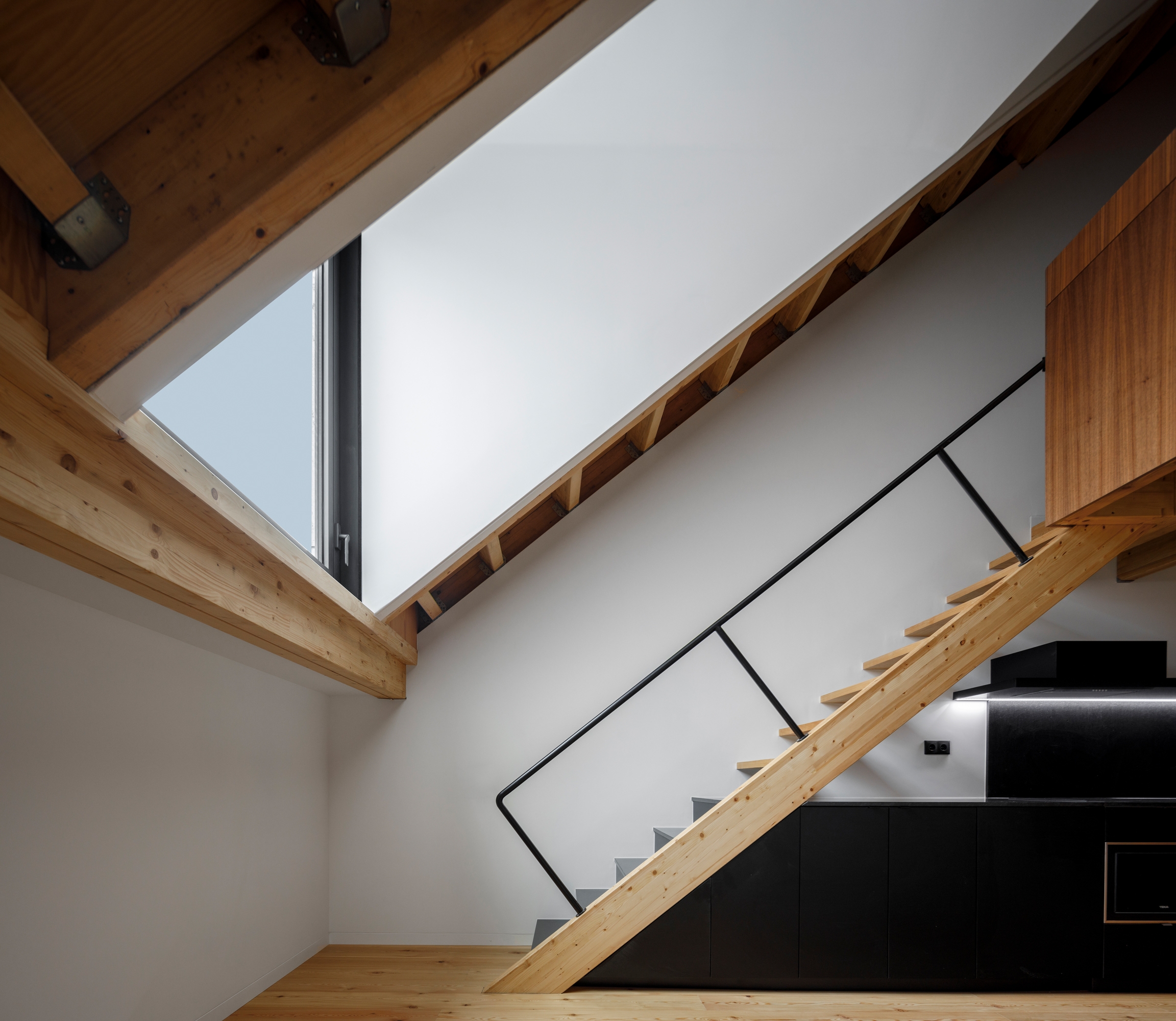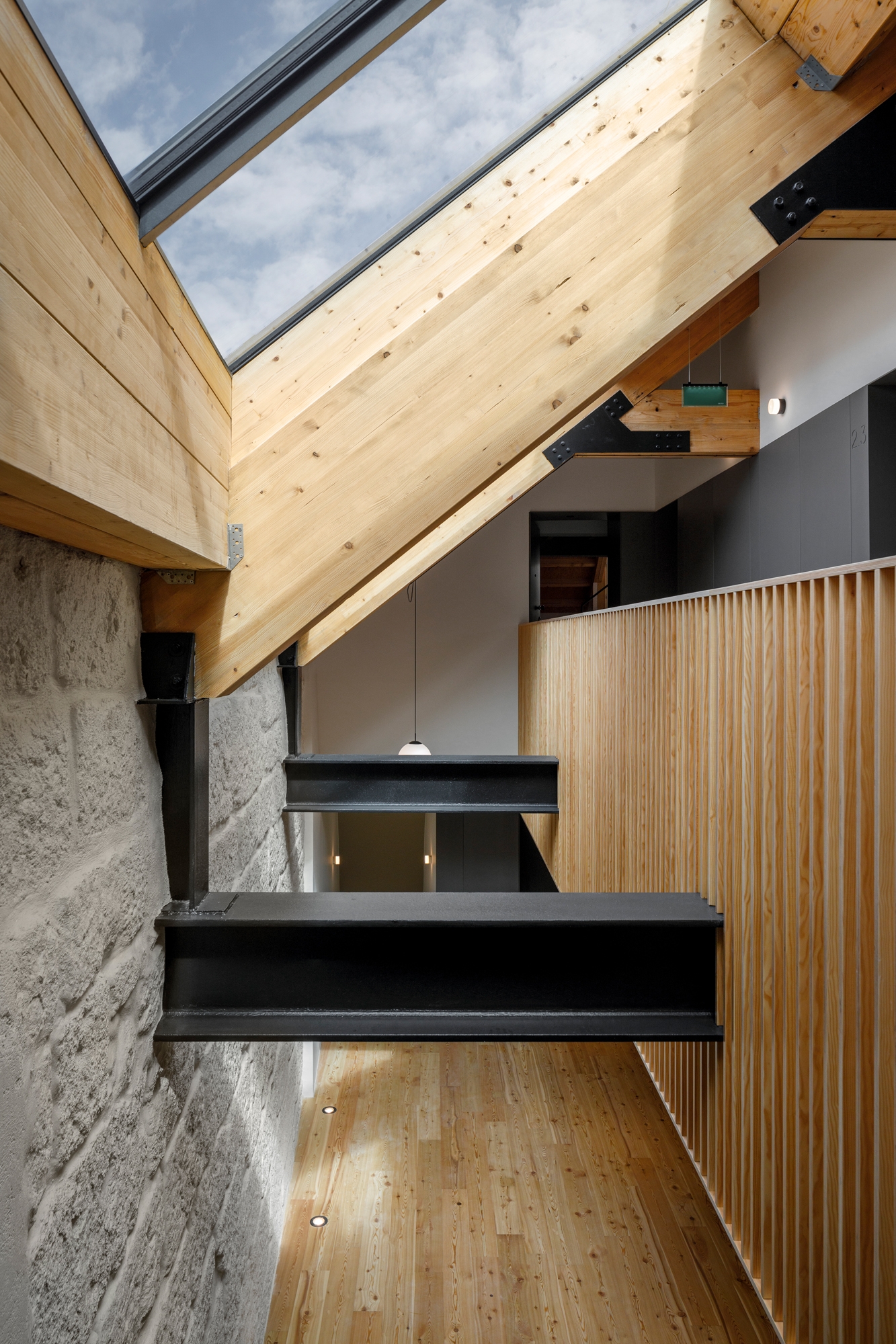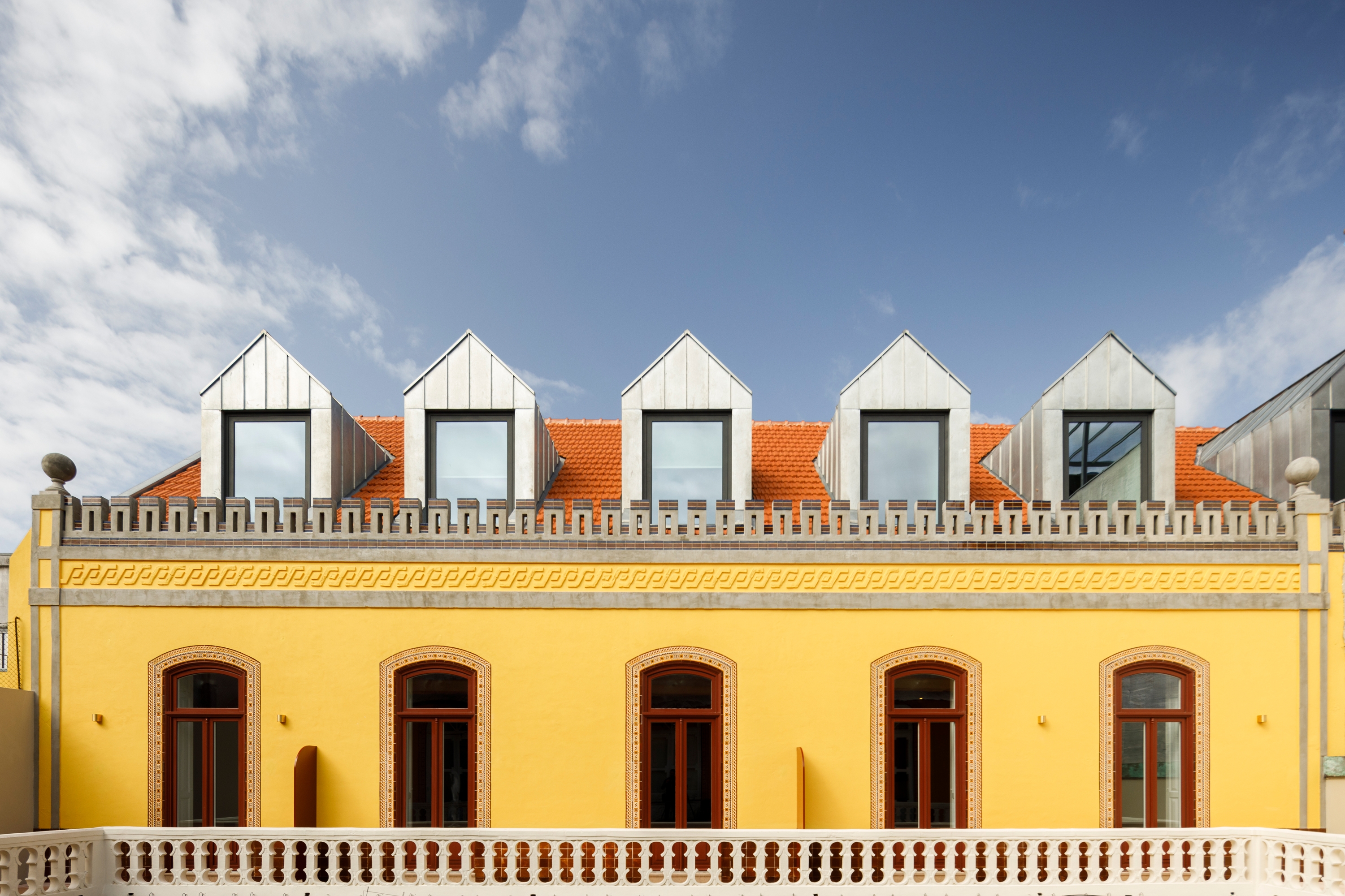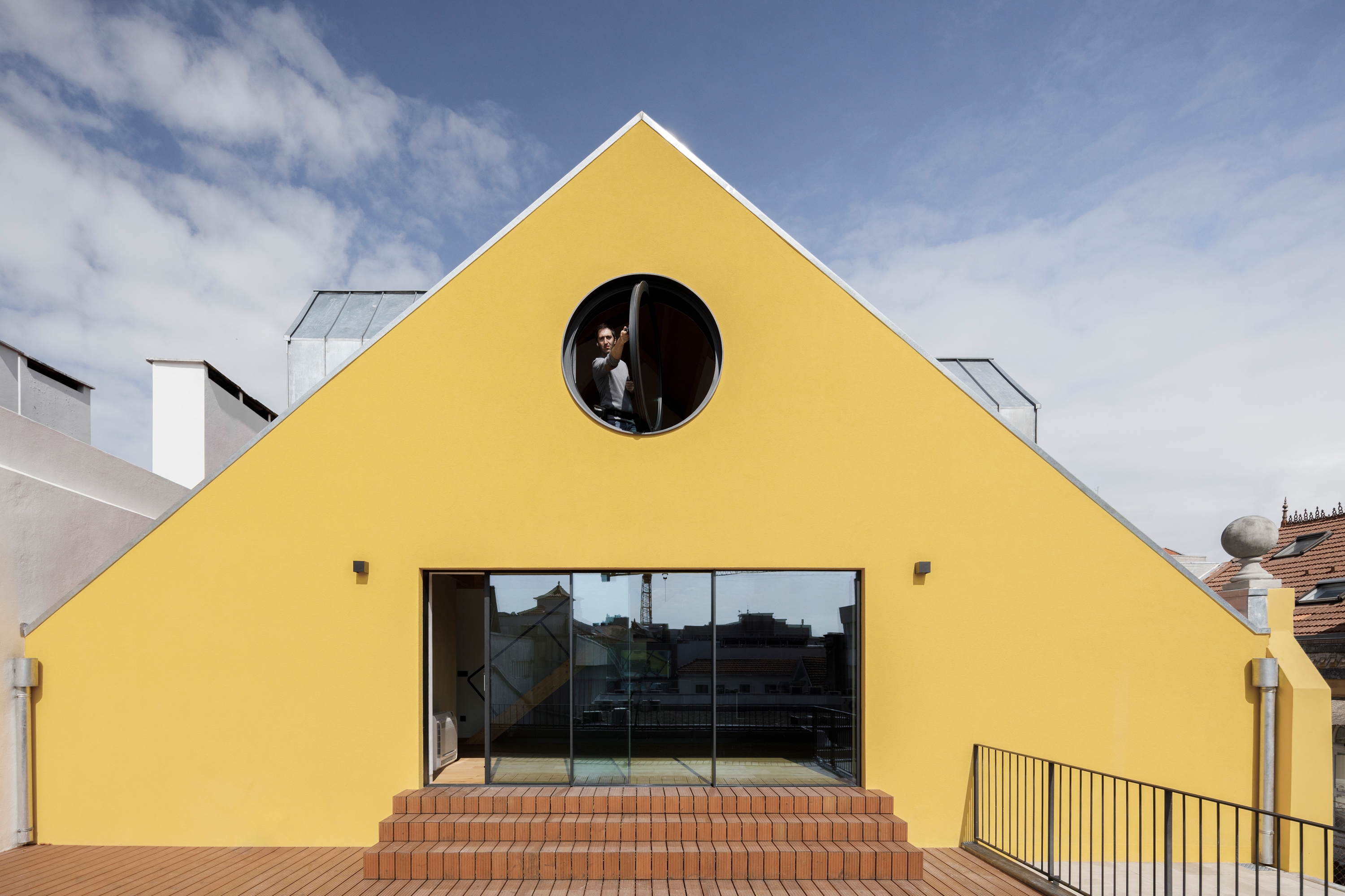 The inevitable programmatic transformation took into account the historical and architectural legacy of the original building that had resisted: the main and East façades were completely rehabilitated without any change, while the South façade, already very transformed at the time, gained prominence in the set, with a new color scheme and with the introduction of a round glass window that gives geometric balance to the whole set and reestablishes the communication with the surroundings. Inside, the essence of the old stone warehouse is maintained: after the uphill journey, with a similar morphology to the original, we are welcomed by a wide and extensive common area, full of natural light, which reveals the striking height of the internal space, completely imperceptible from the street.