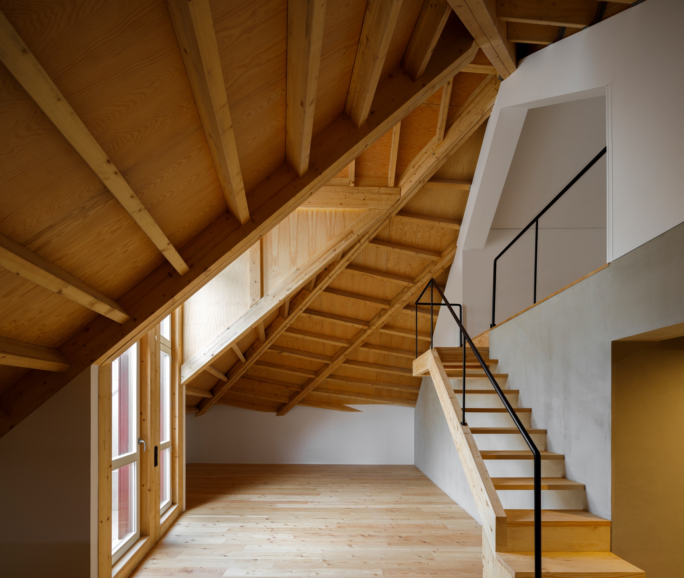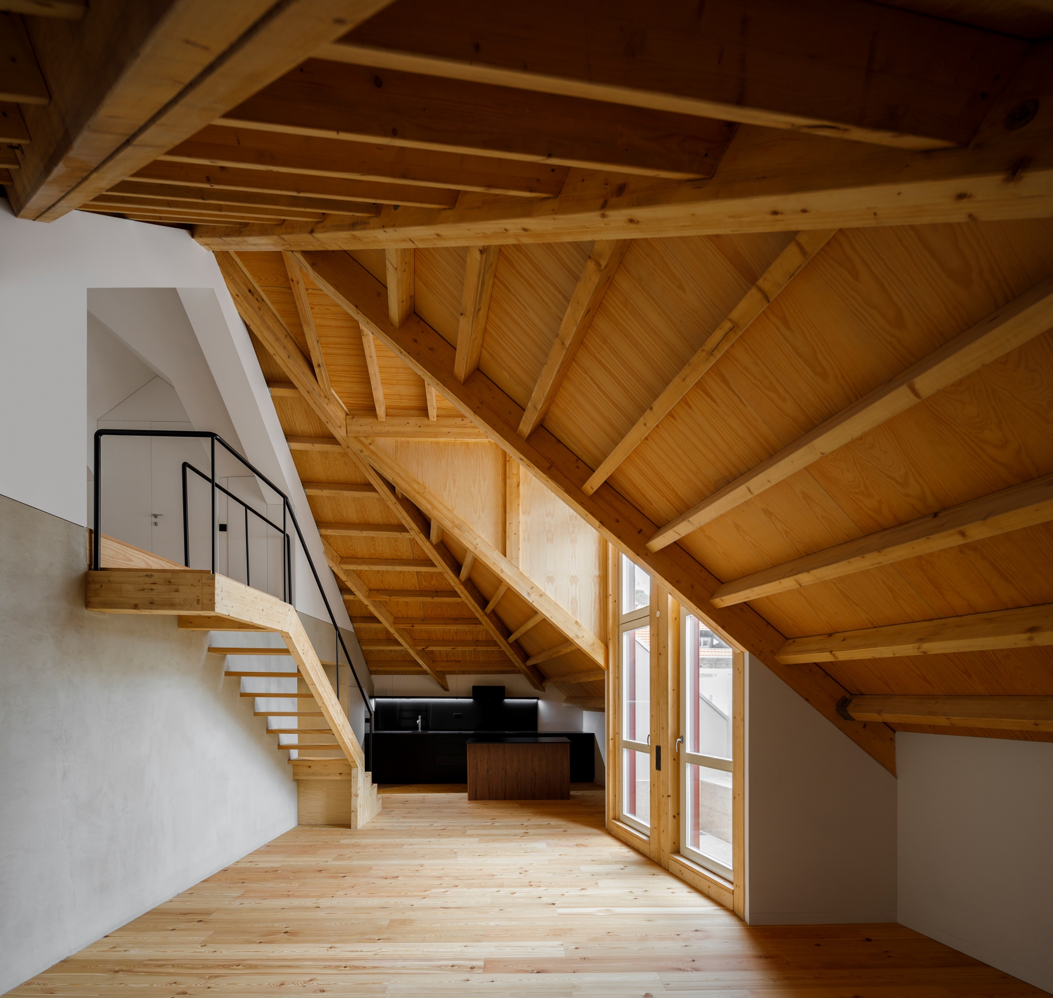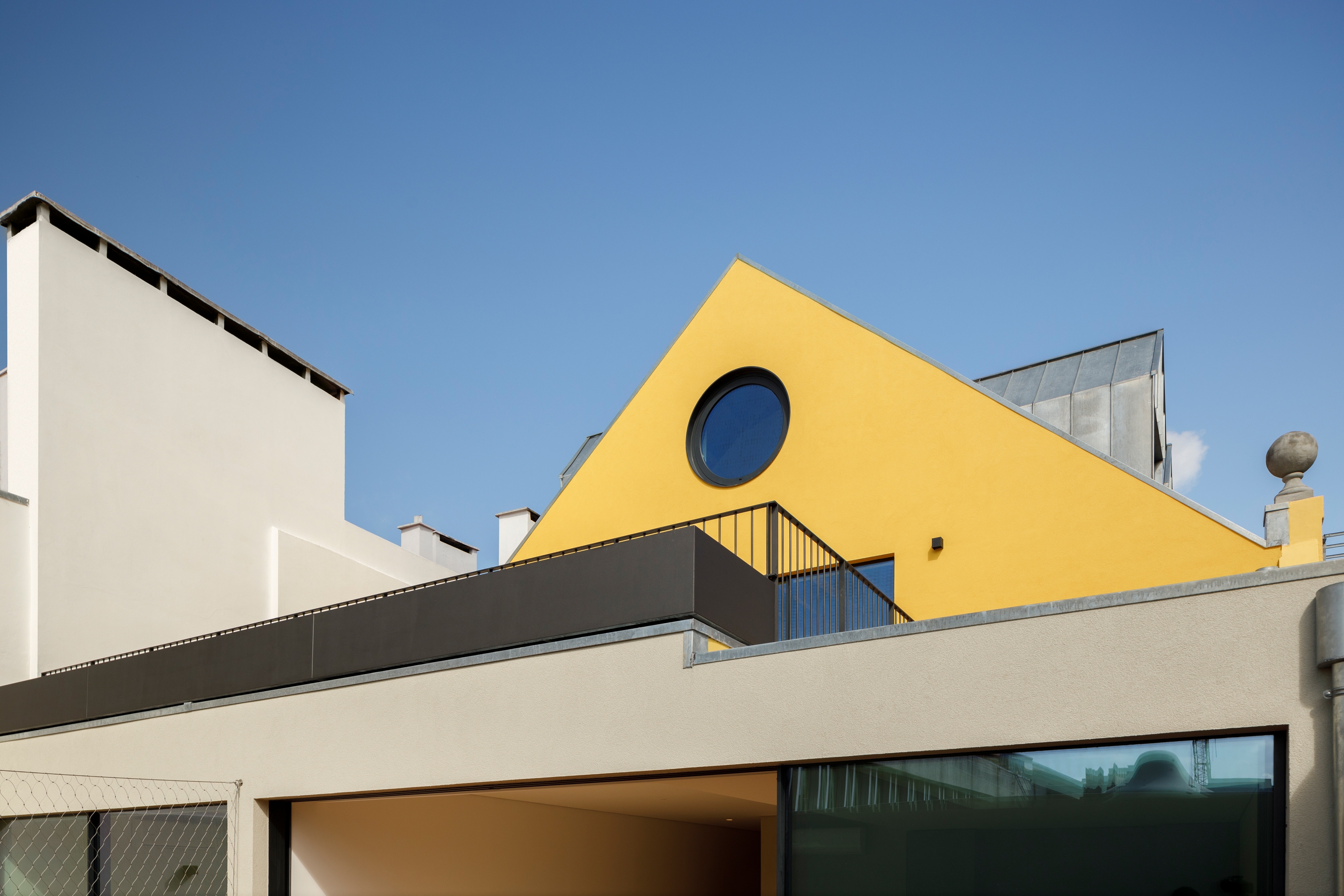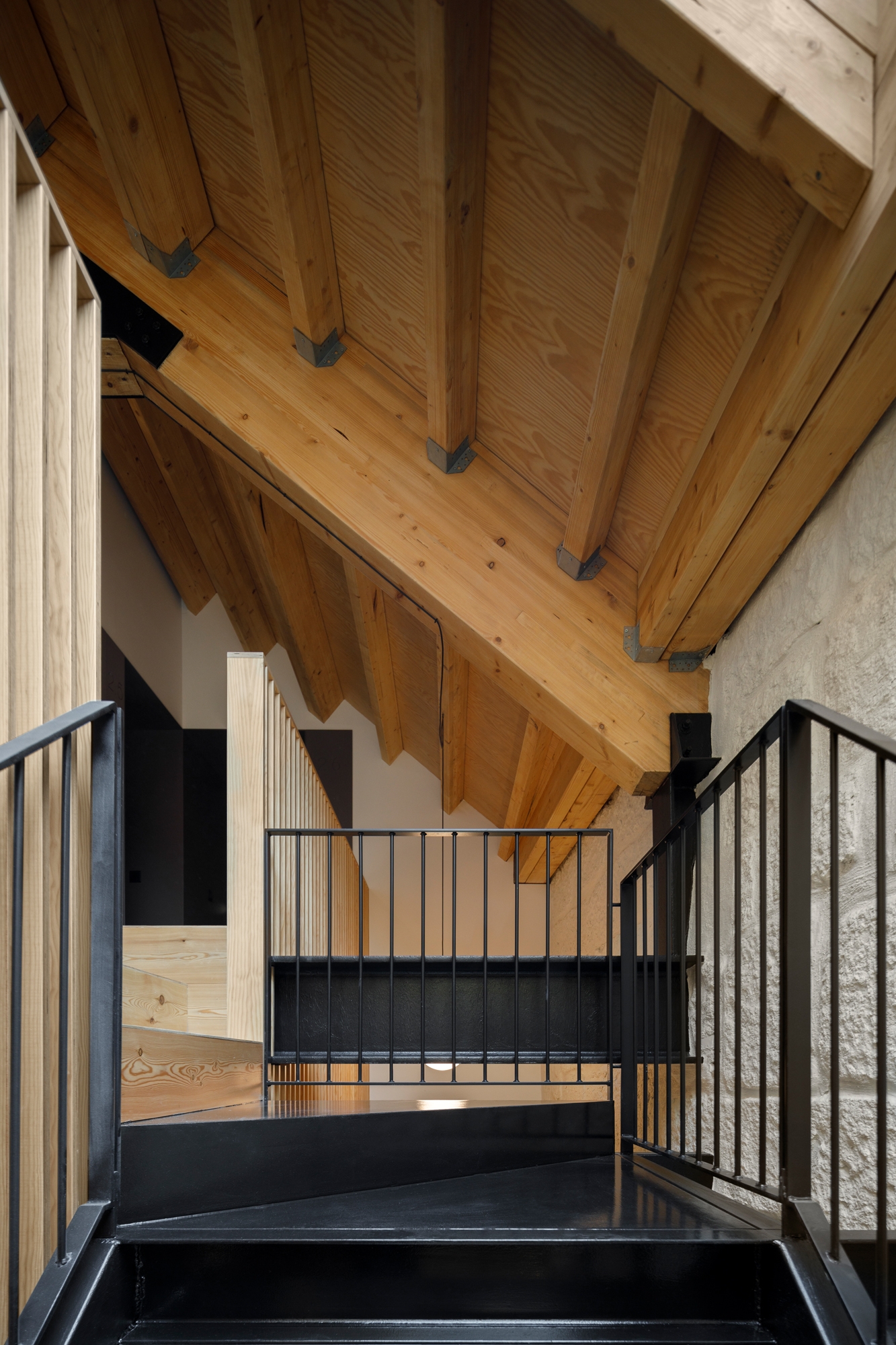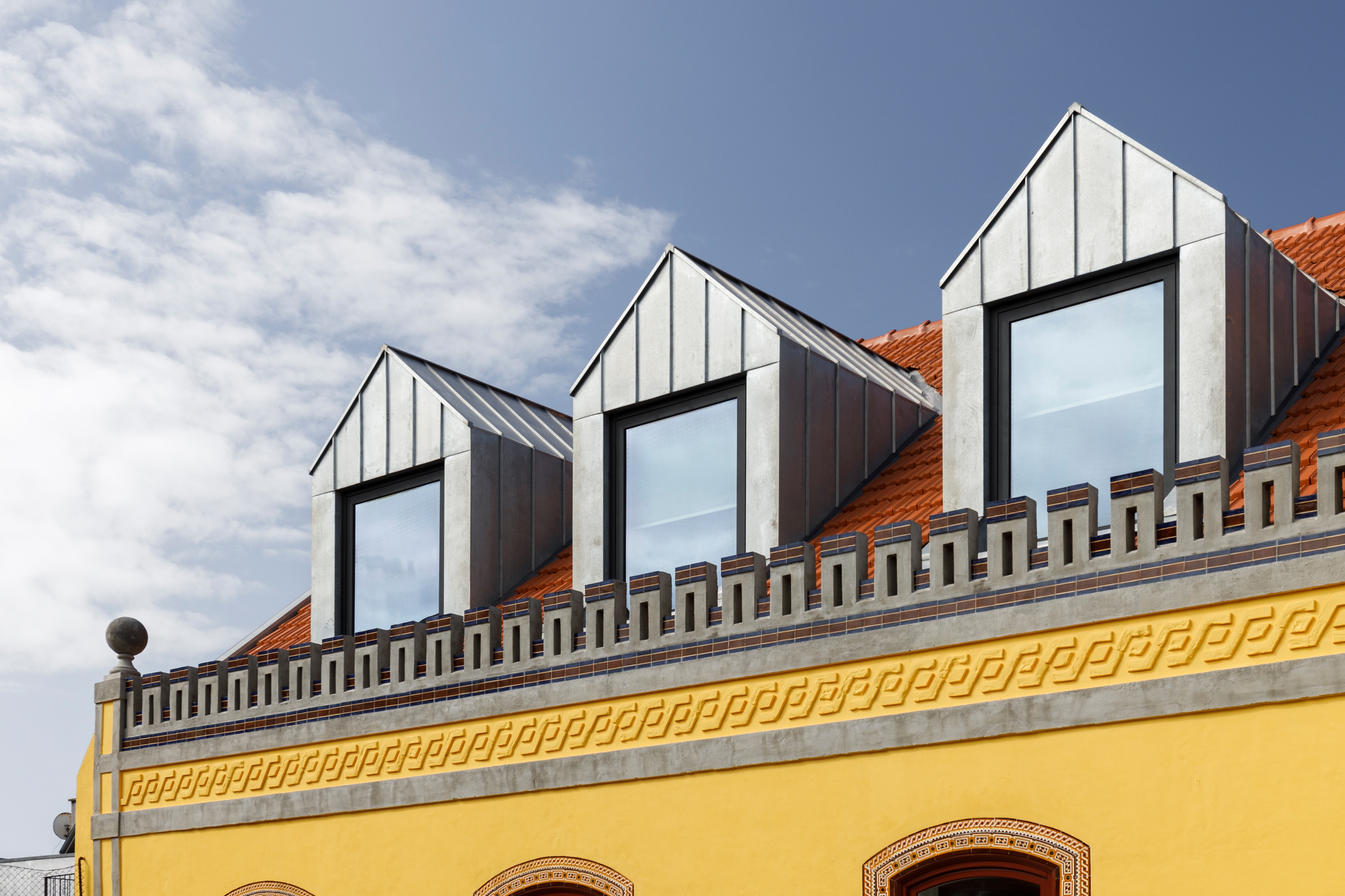 The inevitable programmatic transformation took into account the historical and architectural legacy of the original building that had resisted: the main and East façades were completely rehabilitated without any change, while the South façade, already very transformed at the time, gained prominence in the set, with a new color scheme and with the introduction of a round glass window that gives geometric balance to the whole set and reestablishes the communication with the surroundings. Inside, the essence of the old stone warehouse is maintained: after the uphill journey, with a similar morphology to the original, we are welcomed by a wide and extensive common area, full of natural light, which reveals the striking height of the internal space, completely imperceptible from the street.