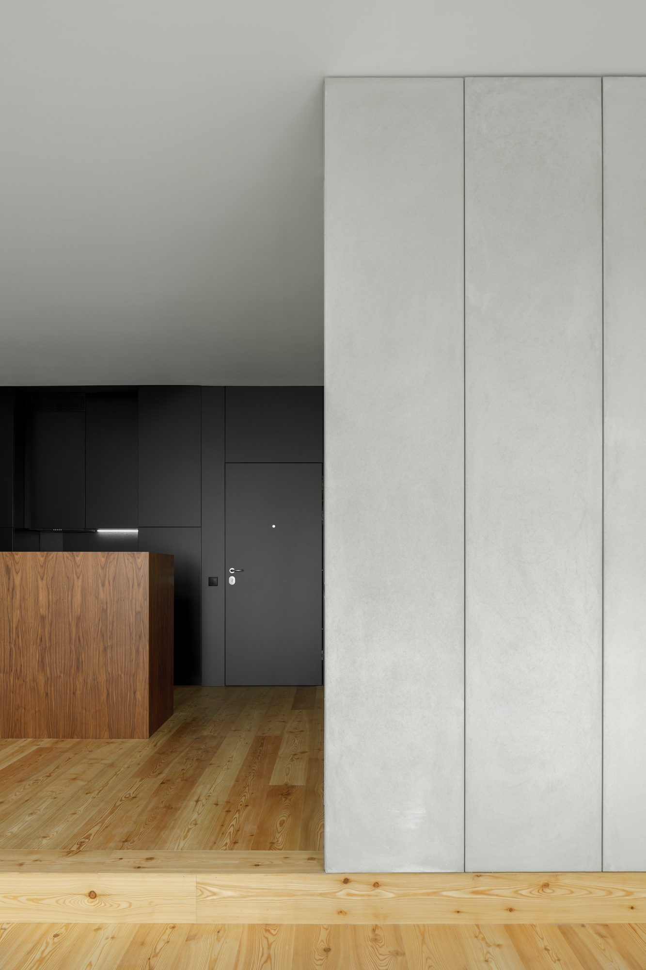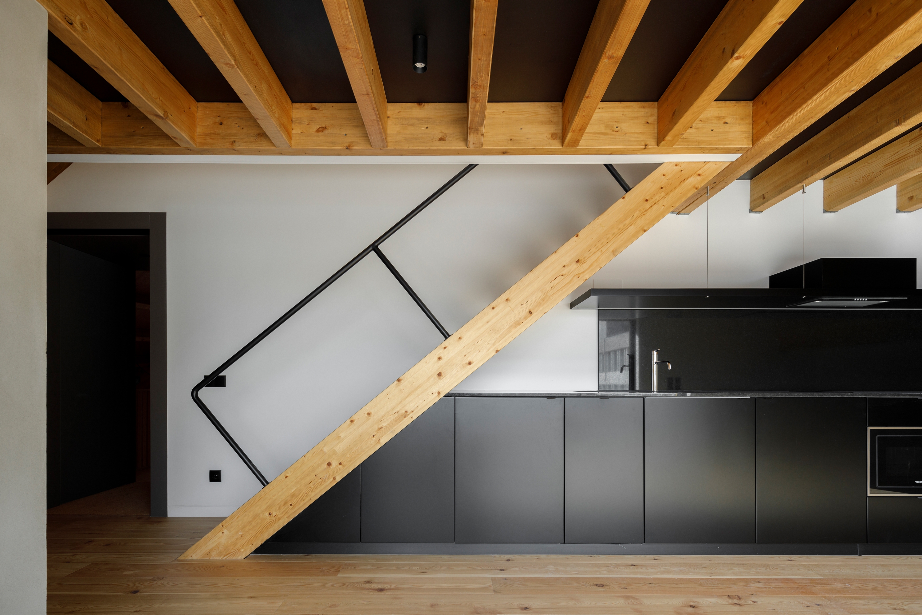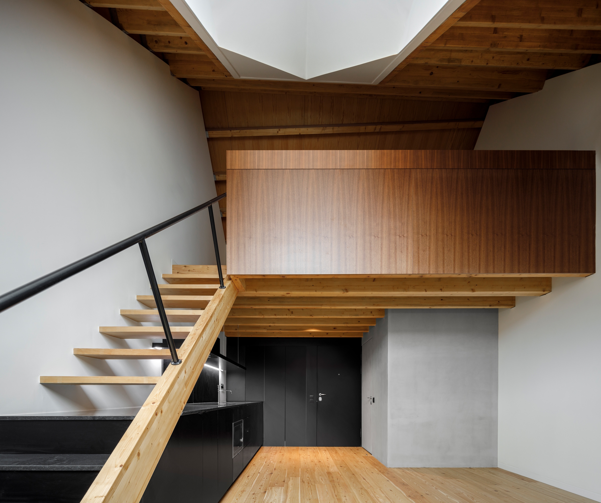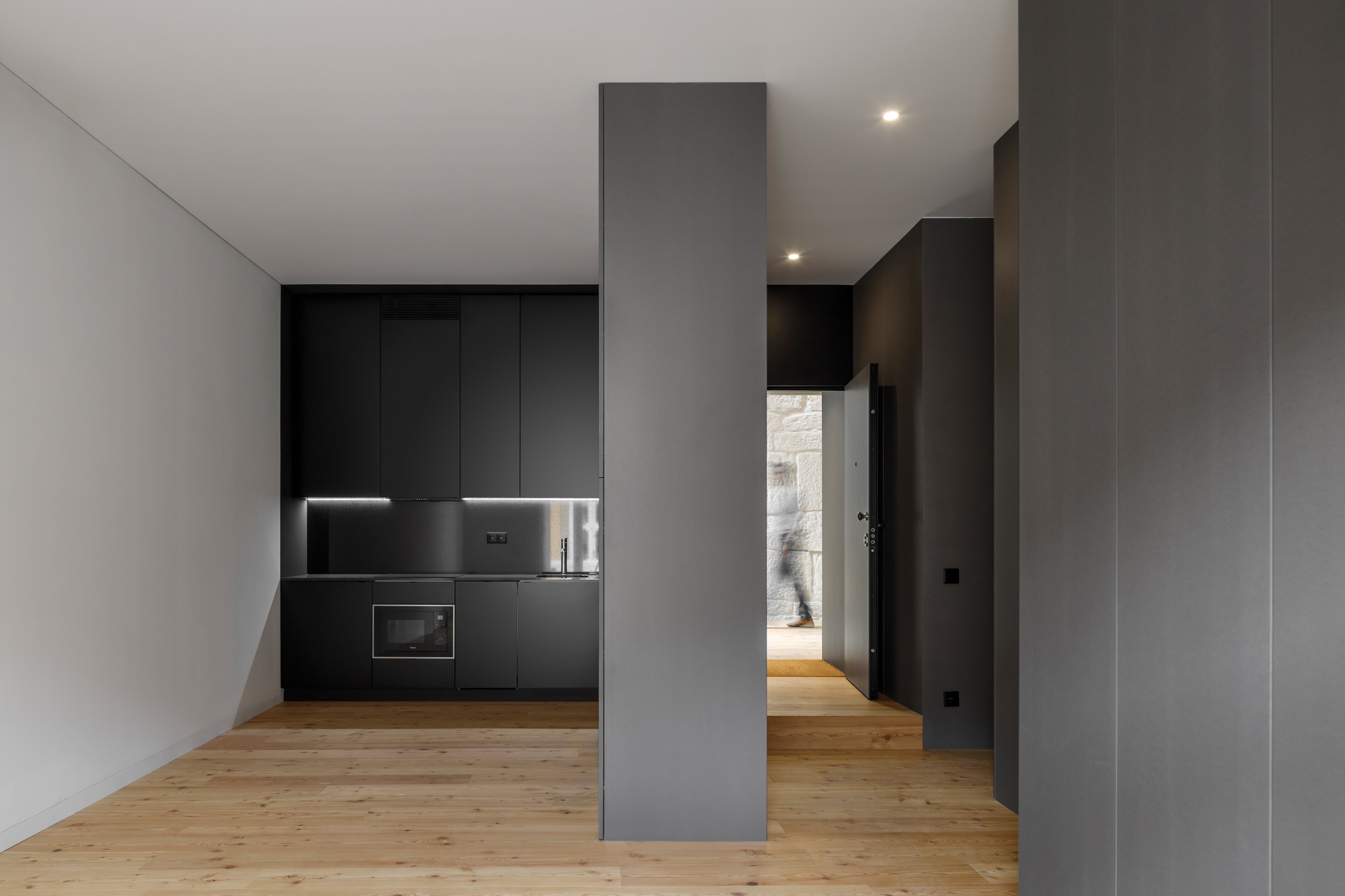Organized inside through the careful distribution of simple volumes (cabinets, kitchens, bathrooms) with a monolithic aspect, such as the stone blocks that populated the warehouse in the bustling activity of the old Ceramics Factory of Devesas, the habitable space appears as voids that result from the dialogue between these simple and solid built masses, with neutral tones, such as gray and black, over a riga wood floor that constitutes the plane where the great massive volumes rest upon.
