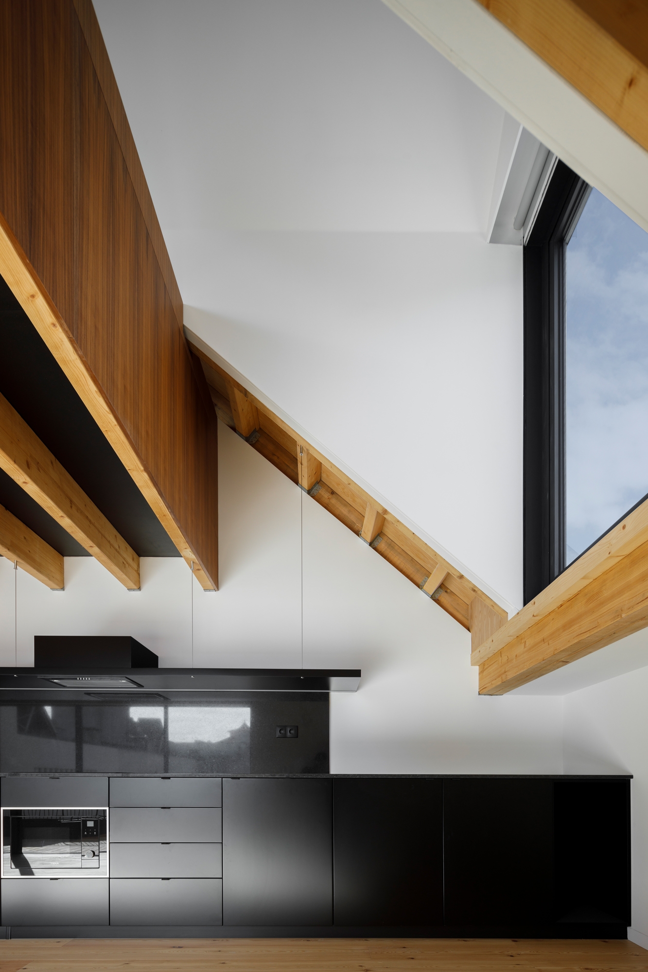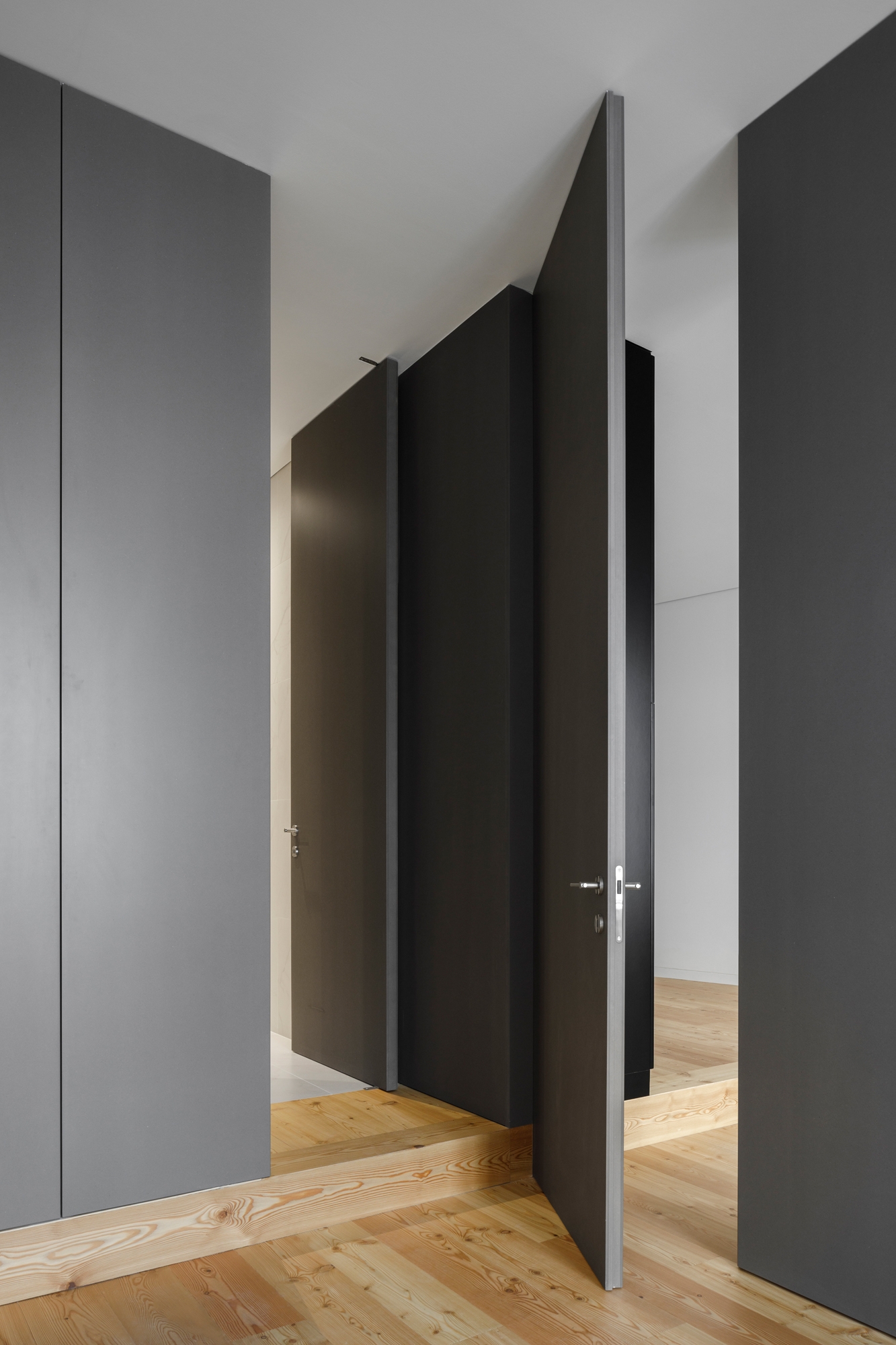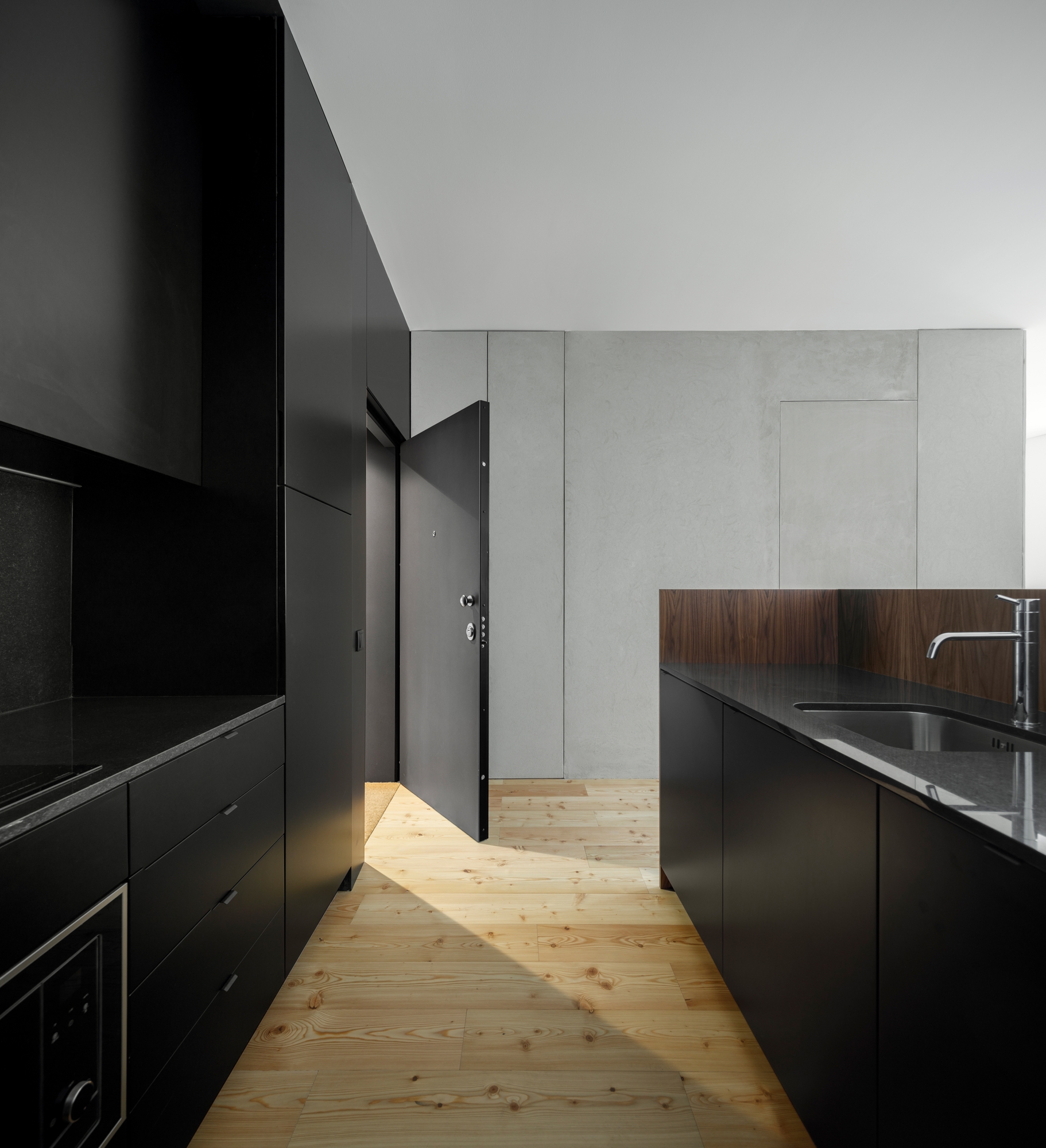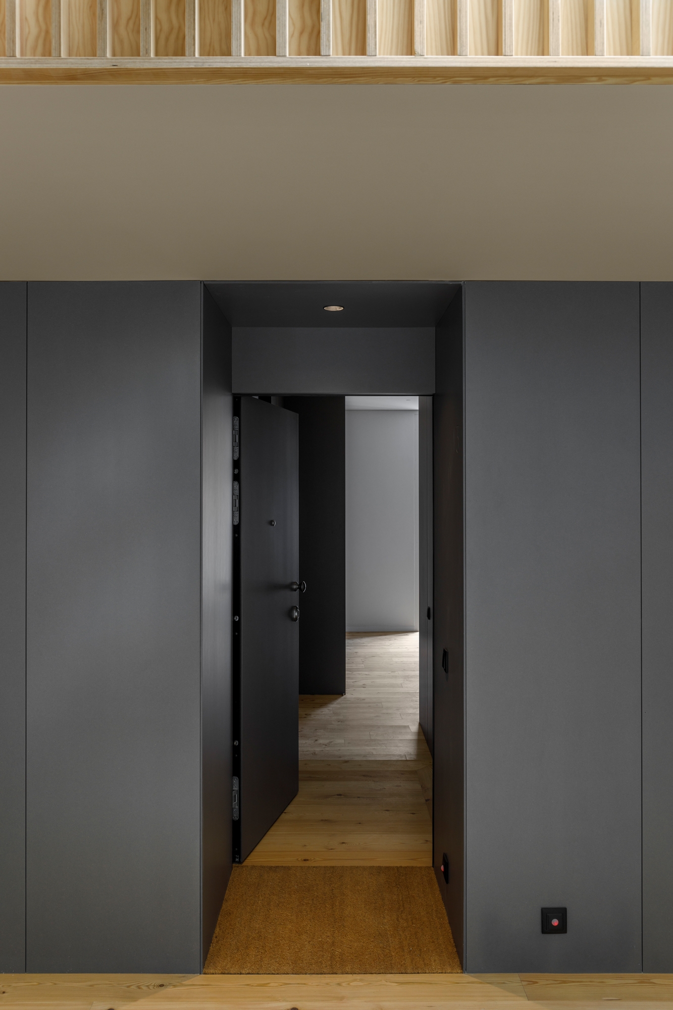Organized inside through the careful distribution of simple volumes (cabinets, kitchens, bathrooms) with a monolithic aspect, such as the stone blocks that populated the warehouse in the bustling activity of the old Ceramics Factory of Devesas, the habitable space appears as voids that result from the dialogue between these simple and solid built masses, with neutral tones, such as gray and black, over a riga wood floor that constitutes the plane where the great massive volumes rest upon.