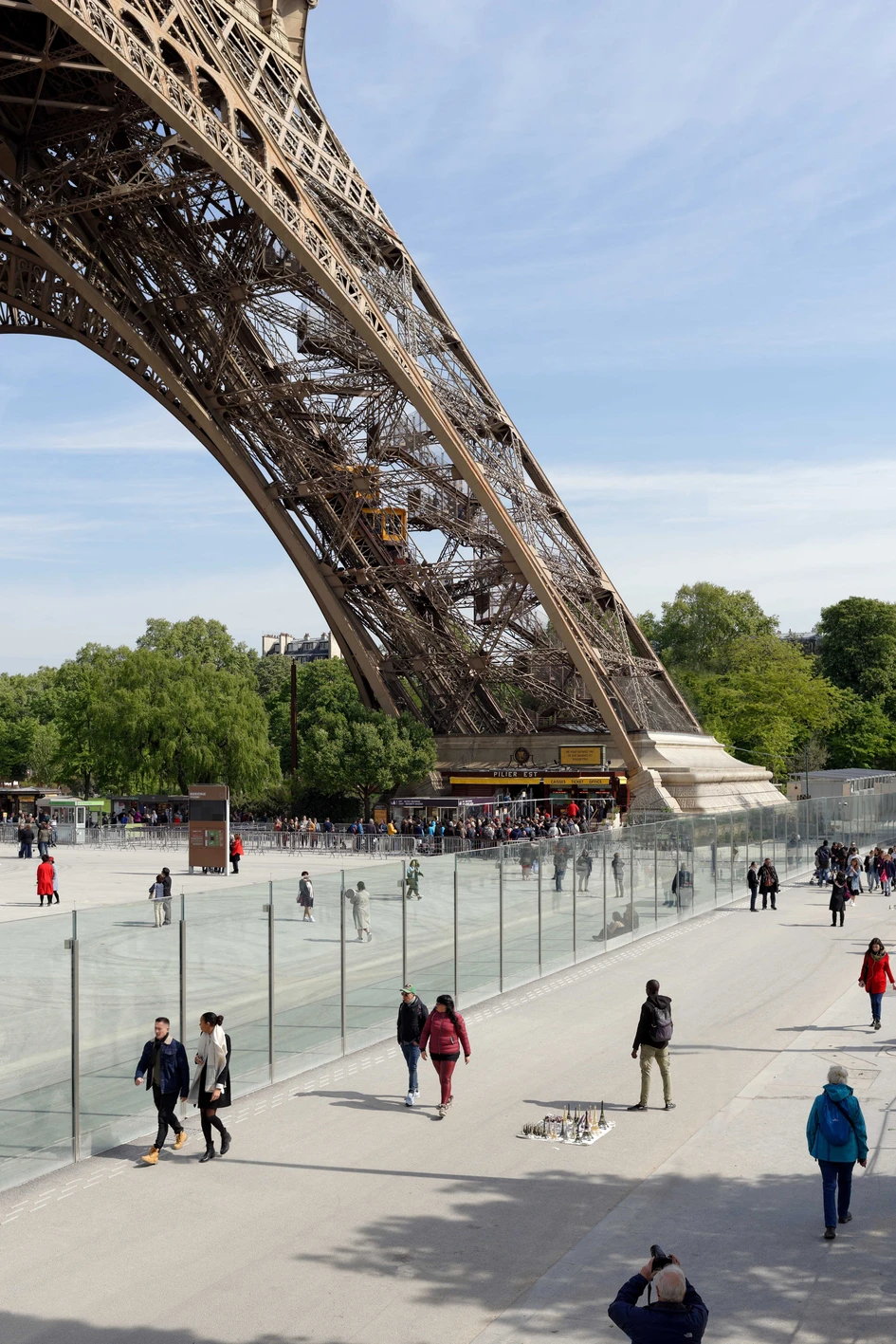 The entrances to the Eiffel Tower have been reorganized. You enter the area of the landscaped garden, which has been carefully restored and faithfully redesigned by the Swiss landscape architect Vogt, in the vicinity of the Avenue Gustave Eiffel on the narrow flanks of the park: six adjoining, equally transparent entrance gates of glass with filigree glass roofs, on which two security points control visitors, ensure that visitors move in a speedy but orderly manner.