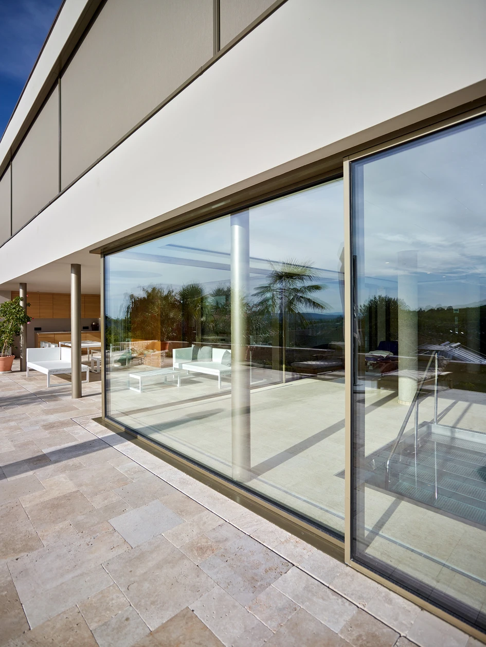 Stable stainless steel carriages ensure that the sliding window simply slides to the side, even with such size ratios. To make operation even easier, cero is electrically powered in the idyllic family home. It enables easy access to the terrace and is even barrier-free. Another highlight: the corner-free opening. This technical finesse enables the room to be opened to the surroundings without limits. On warm summer days, the swimming pool quickly becomes an outdoor pool.