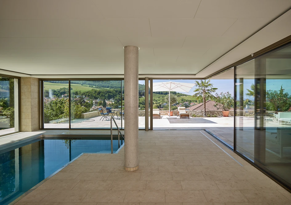 Floor-to-ceiling sliding windows were installed over the entire front of the garden at 16 meters, making the surrounding landscape visible from every angle of the swimming pool. In order to not disturb the view of the mountains, the architect Dipl.-Ing. Thomas Martin opted for an exclusive sliding window with slim profiles: cero from Solarlux. It impresses with its filigree frame with a view width of just 34 mm. 15 square meter panes with a height of up to six meters are possible.