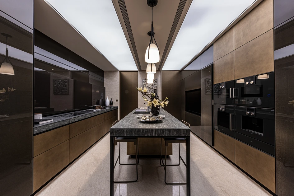 The main flow of connecting public and private sections play the role of the hallway and social hall, where movable furniture is occupied. Diamond beige marble floor acts in cooperation with Italian water-dyed chicken wing veneer, Italian hand-spliced mosaic ceramic tile on the wall, and the bronze plating bar with pearl white jade.