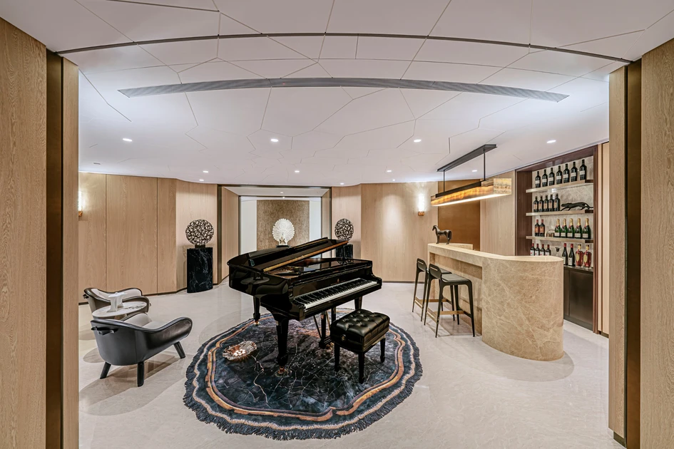 The dining room emerges a cylindrical shell that provides a completely confined space closed by four arc-shaped electrically operated gates decorated by white silver fox stone. The teahouse and library appear when the gates keep open on the same axis. The Italian hand-made crystal chandelier on the table corresponds with antique silver foil on the ceiling.