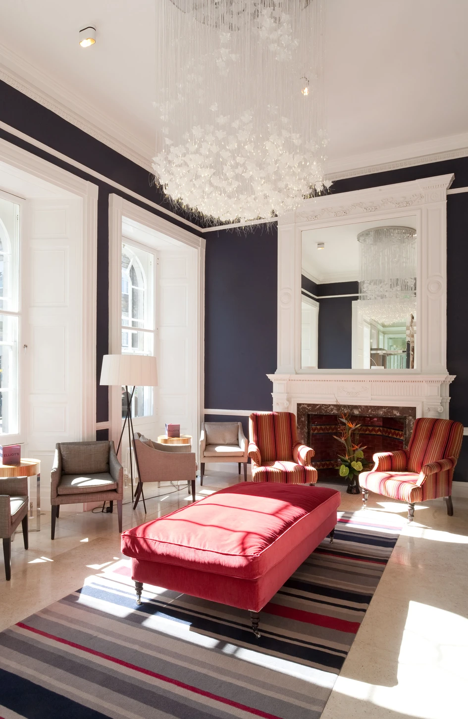The large historic Georgian rooms facing south onto Waterloo Place, provide the ideal setting for Elliot’s Lounge Bar and Brasserie. The design of Elliot’s Brasserie plays on the room’s classic Georgian symmetry with a fireplace at either end and six grandly arched windows looking out over the street beyond. To create an ambience of calm sophistication and classic, elegant design, the spaces have been opened up to reflect the original plan using strong colours within the Georgian rooms to accentuate their height and scale as well as emphasising the historic detailing within.