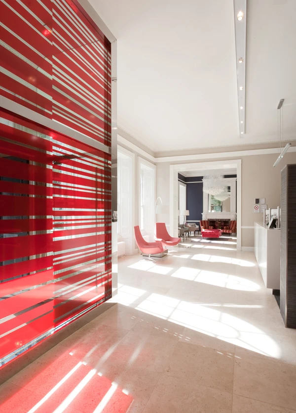 Against the fabulous backdrop of two grand Georgian mantelpieces, over which hang ornate full height mirrors, the Sharon Marston chandelier, which emits light through its long fibre optic strands, is framed through an original historic opening into Elliot’s Lounge Bar, dramatically linking this space to the reception and creating the key focal point on entry to the building. The furniture in the lounge was carefully chosen to reflect the quality of workmanship expected in such a prestigious building, with hand crafted Lansdowne Chairs and Howard style benches from David Seyfried in London, mixed with contemporary chairs and tables from hb group and Tangram Furnishers.