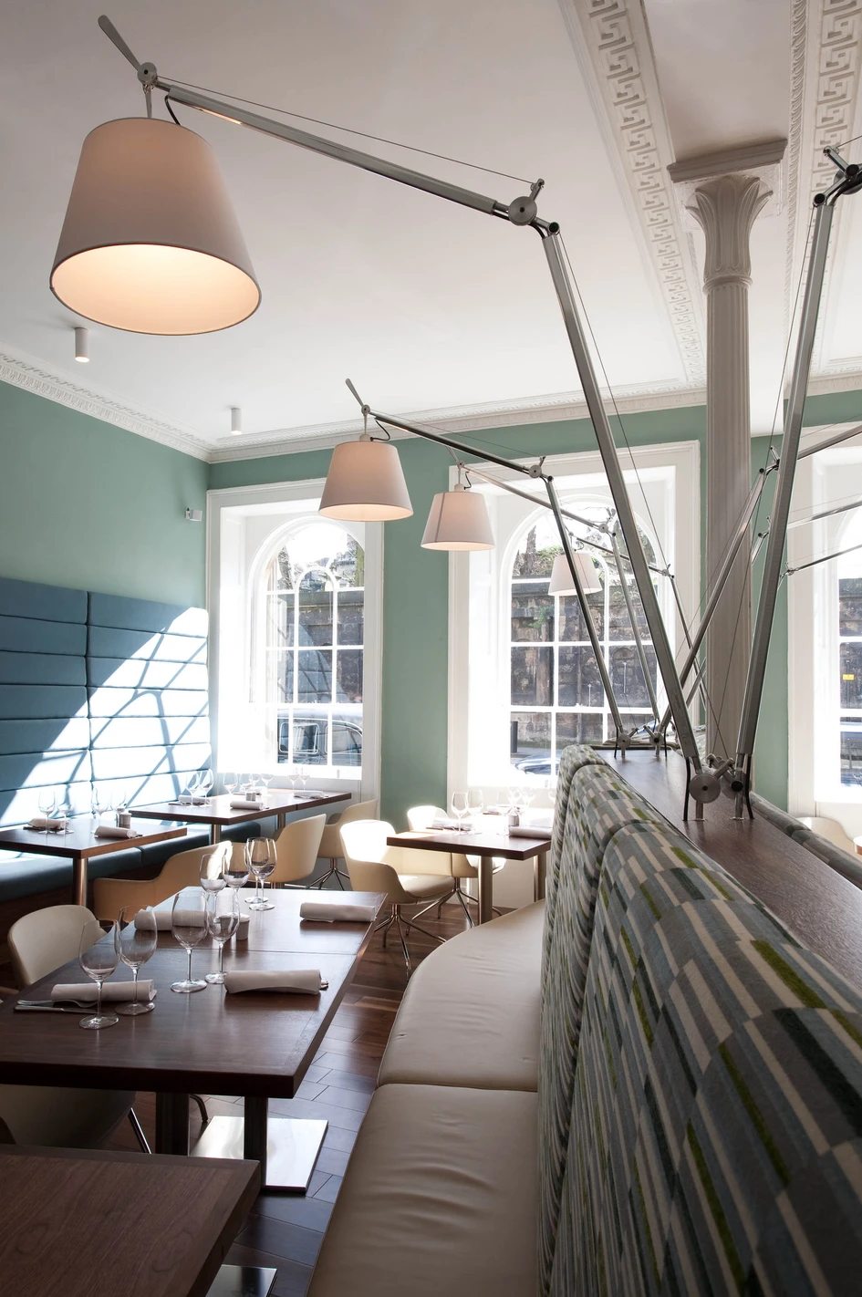 Textured finishes were selected, such as Glimmer mosaic tiles to walls and riven slate to floors to add depth. These were combined with patterned fabrics from Harlequin and Zoffany to furniture and curtains, which soften the front of house areas, adding a contemporary feel to the rooms and creating a rich and layered aesthetic. In addition, dramatic bespoke light fittings highlight focal points throughout the front of house areas, including the pendant fittings in the brasserie from Mike Stoane Lighting and the rows of modern Artemide Tolomeo cantilevered lamps to illuminate the brasserie tables in central areas.