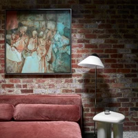 Studio concept: The studio of Elwood Residence acts as a teenagers retreat equipped with kitchenette, bathroom and desk space. The black painted walls and ceiling, exposed recycled brick feature wall and green carpet create a space that feels dark, moody and cosy. The Black walls cocoon one within the space and are a striking backdrop for the more vibrant furniture and art selections. The dusty red corduroy sofa bed and the vintage Togo armchair were selected to amplify the cool factor that already exists in this bold space by embracing pops of rich colour against the existing dark backdrop. The palette in the space is unified by the vintage artwork above the sofa which was painted by Donald Grant in 1972.