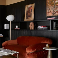 Sitting room concept: The ornate art deco sitting room of Elwood Residence sets a dramatic scene for guests upon arrival into the home. Taking inspiration from the decadent style that characterised the art deco era, the room feature a rich materials palette, luxe textures and warm colours that contrast against the dark wood panelling. An interesting combination of materials from marble, smoked glass, brass, chrome and tactile textiles combine to create a space that feels elegant, intimate and inviting. Timeless iconic Italian furniture pieces from the seventies including the Sesann sofa and Alky armchairs were selected for their curvaceous forms and enduring design. The sofa was upholstered in a luxurious warm red velvet which adds a sense of drama to the space. The room is layered with books, objects and artwork which ground the rich materiality and allows the room to feel cosy with a strong sense of eclecticism. We chose to embrace the inherent moodiness of the room by painting the plaster walls and ceiling in a golden hue, which envelops the space and enhances the sense of warmth and comfort that the room exudes.