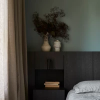 Master bedroom concept: The art deco master bedroom of Elwood Residence was transformed into a calming retreat. A soothing dusty blue hue was selected for the walls and informed the palette for the bedding. The blue palette was selected to complement the existing dark walnut built in bedhead and original timber floors. A selection of ceramics and objects of varying shapes and heights were sourced for the bed head shelf. Finally, artworks with complementary colour palettes and calming subject matters were selected to complete this simple yet refined space.