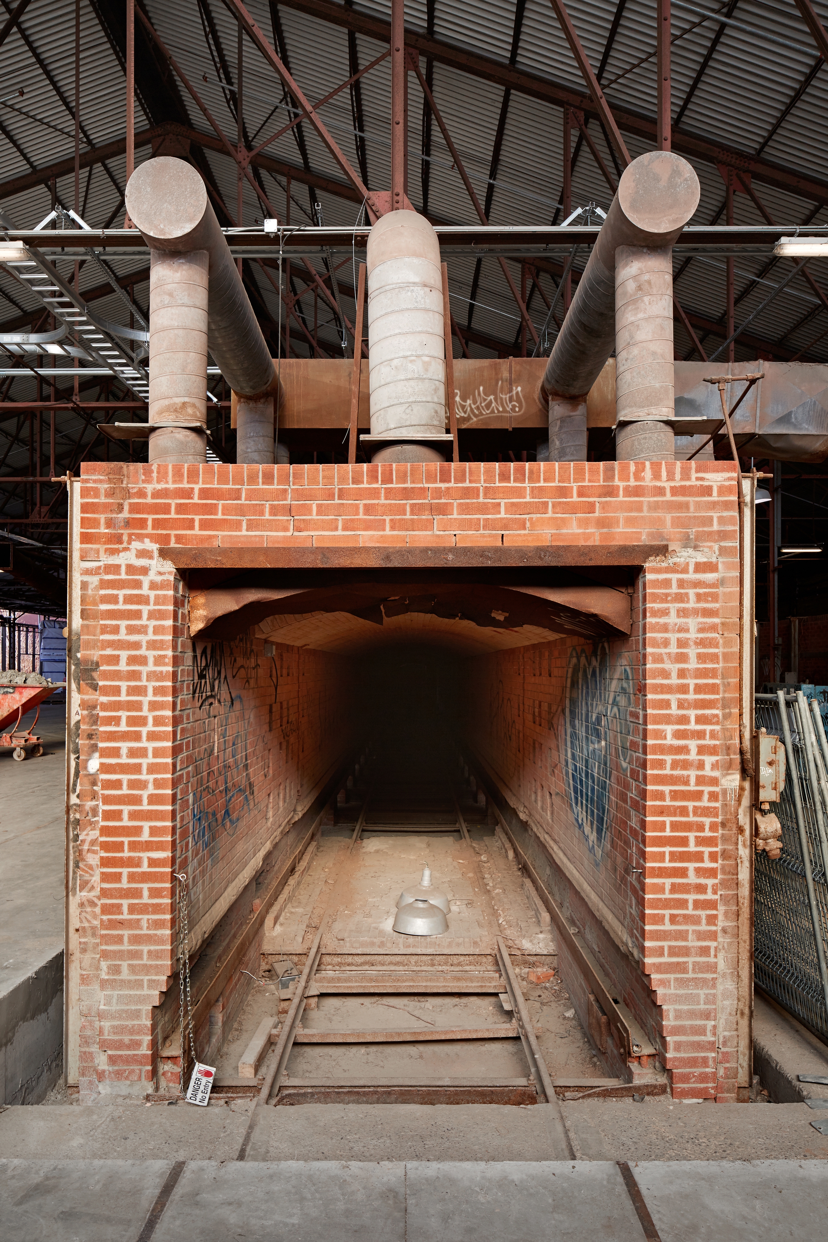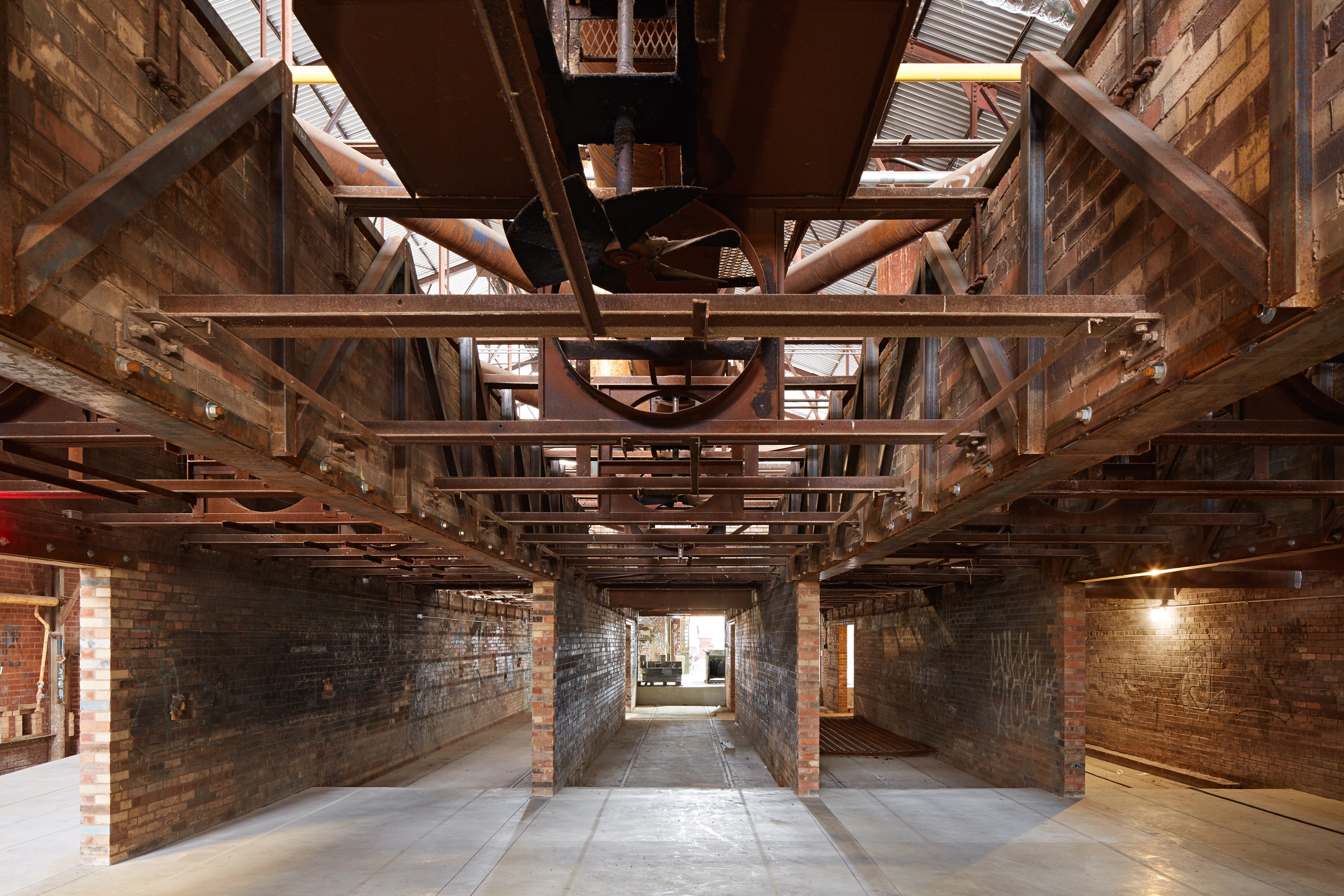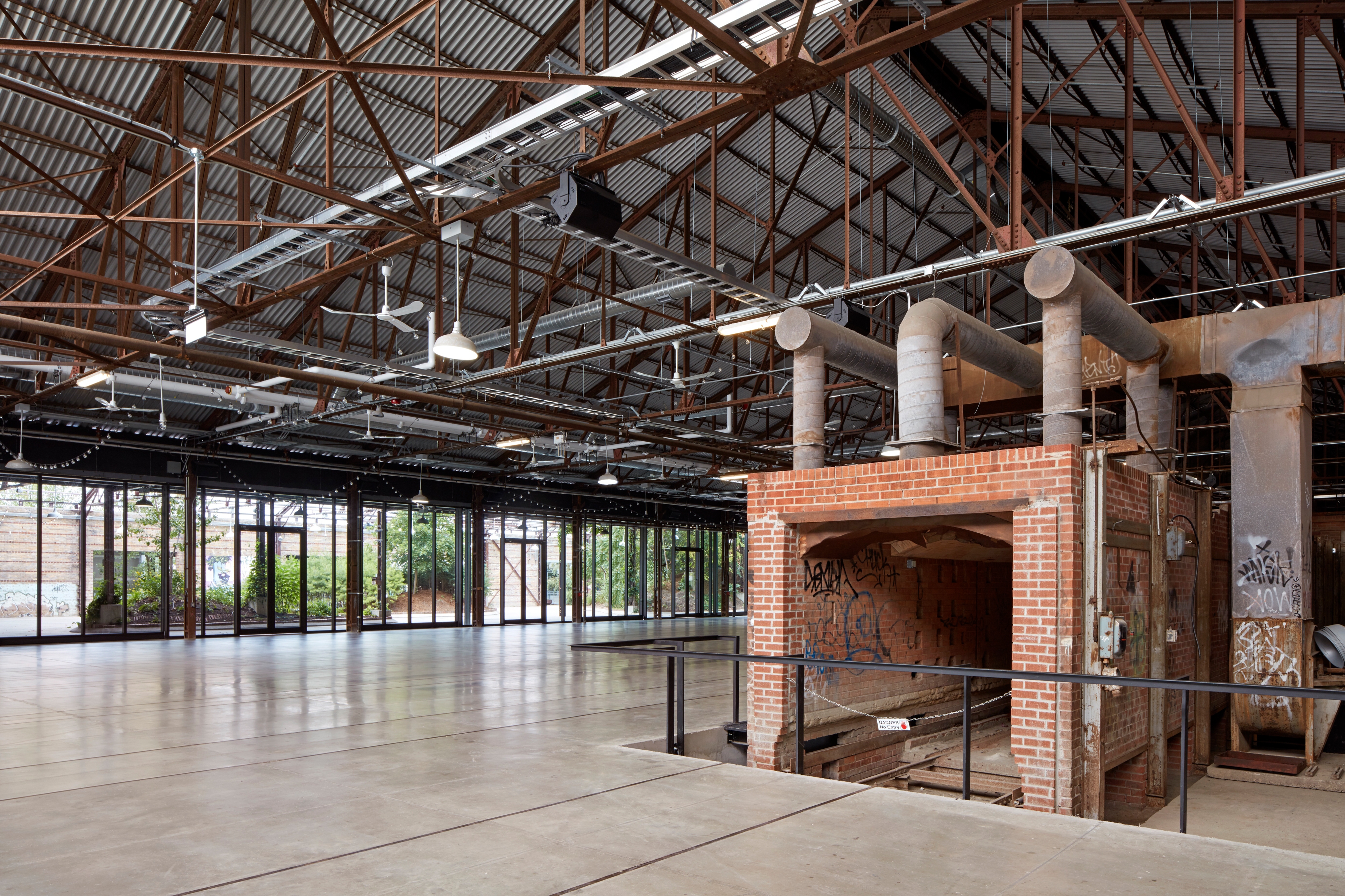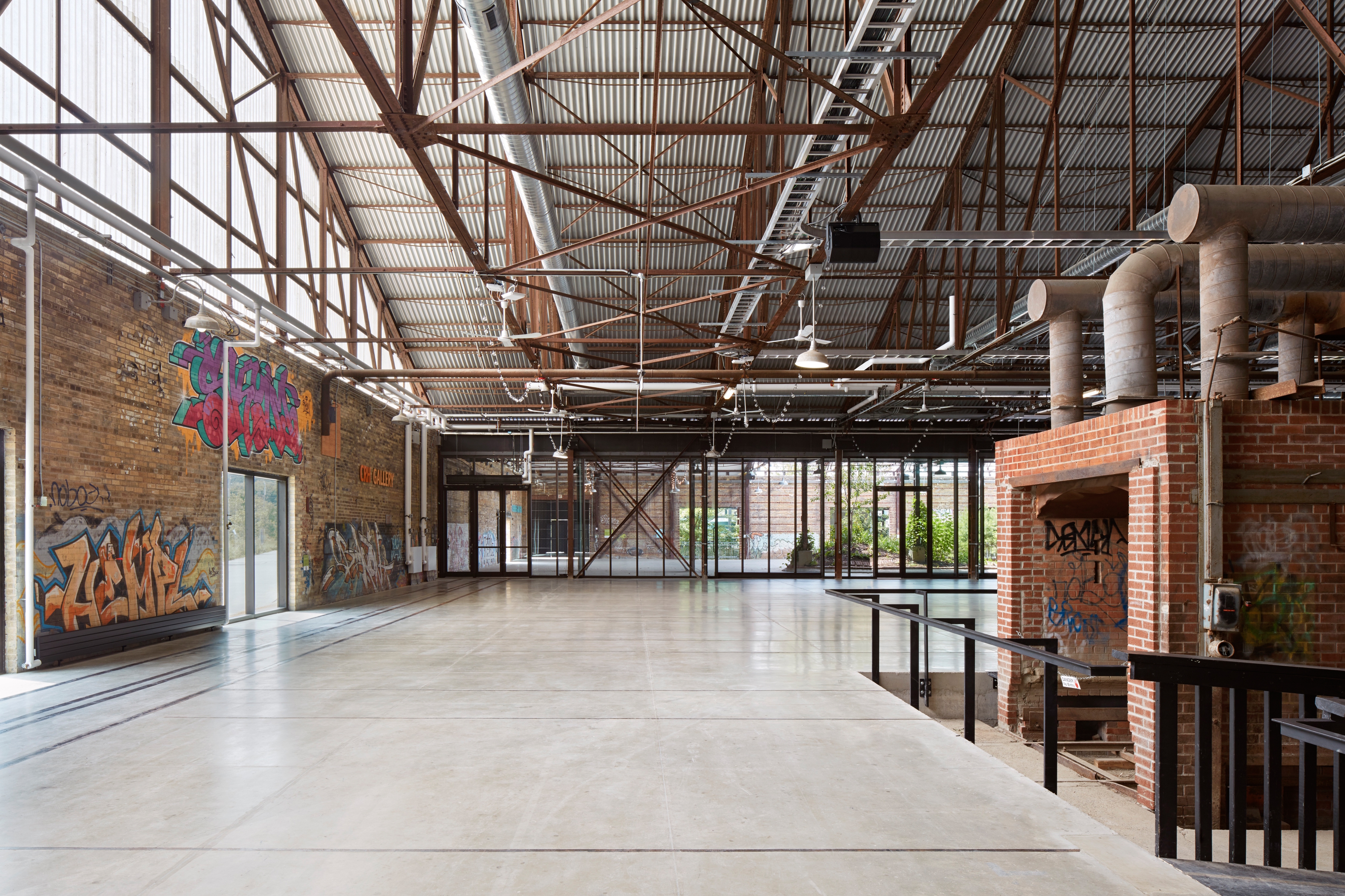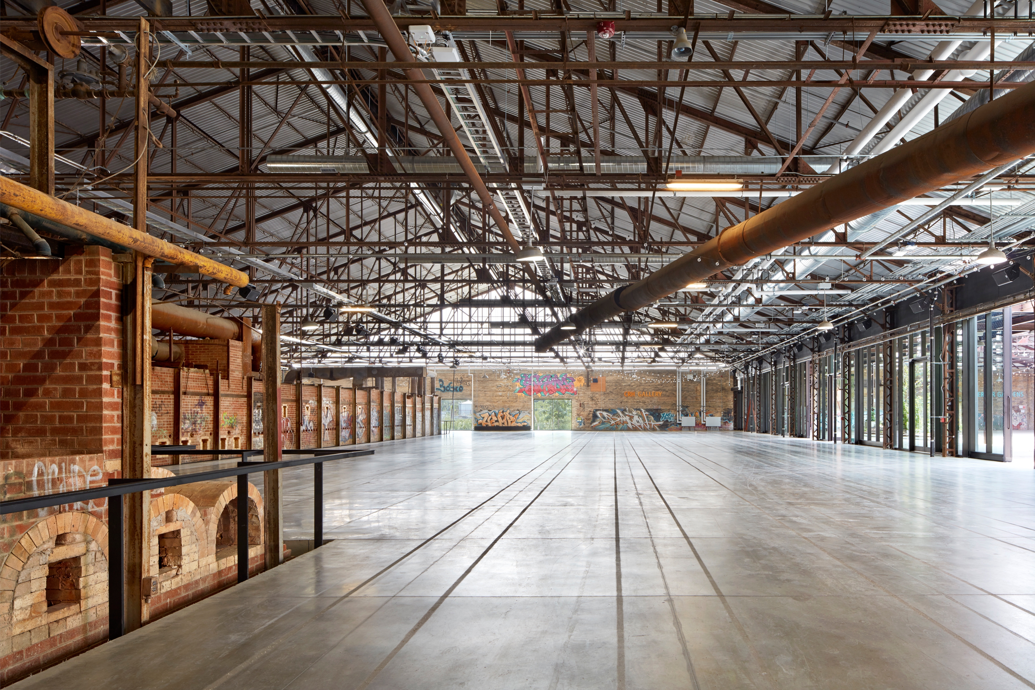 The team applied a didactic and commemorative approach to the heritage elements of Building 16 to create a museological tour of the site, including preserving the brick firing and drying ovens and re-presenting them as industrial artifacts. Although the concrete floor needed to be raised two feet in most sections to accommodate the flood proofing design, new steel inlays and sandblasted lines trace the cart tracks below while sections of tinted concrete represent the impression and footprint of the historic kilns, helping visitors to understand the history of the site.