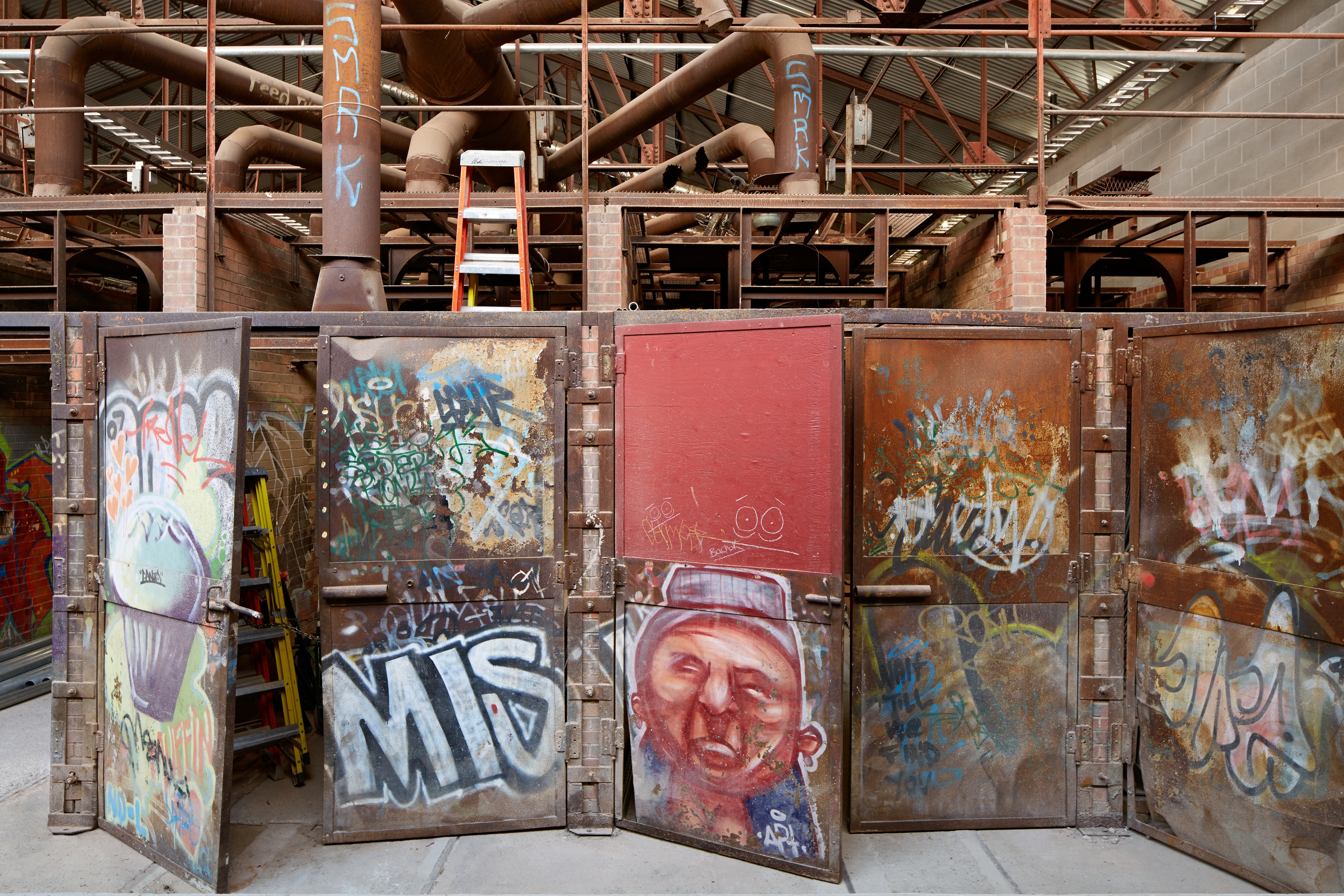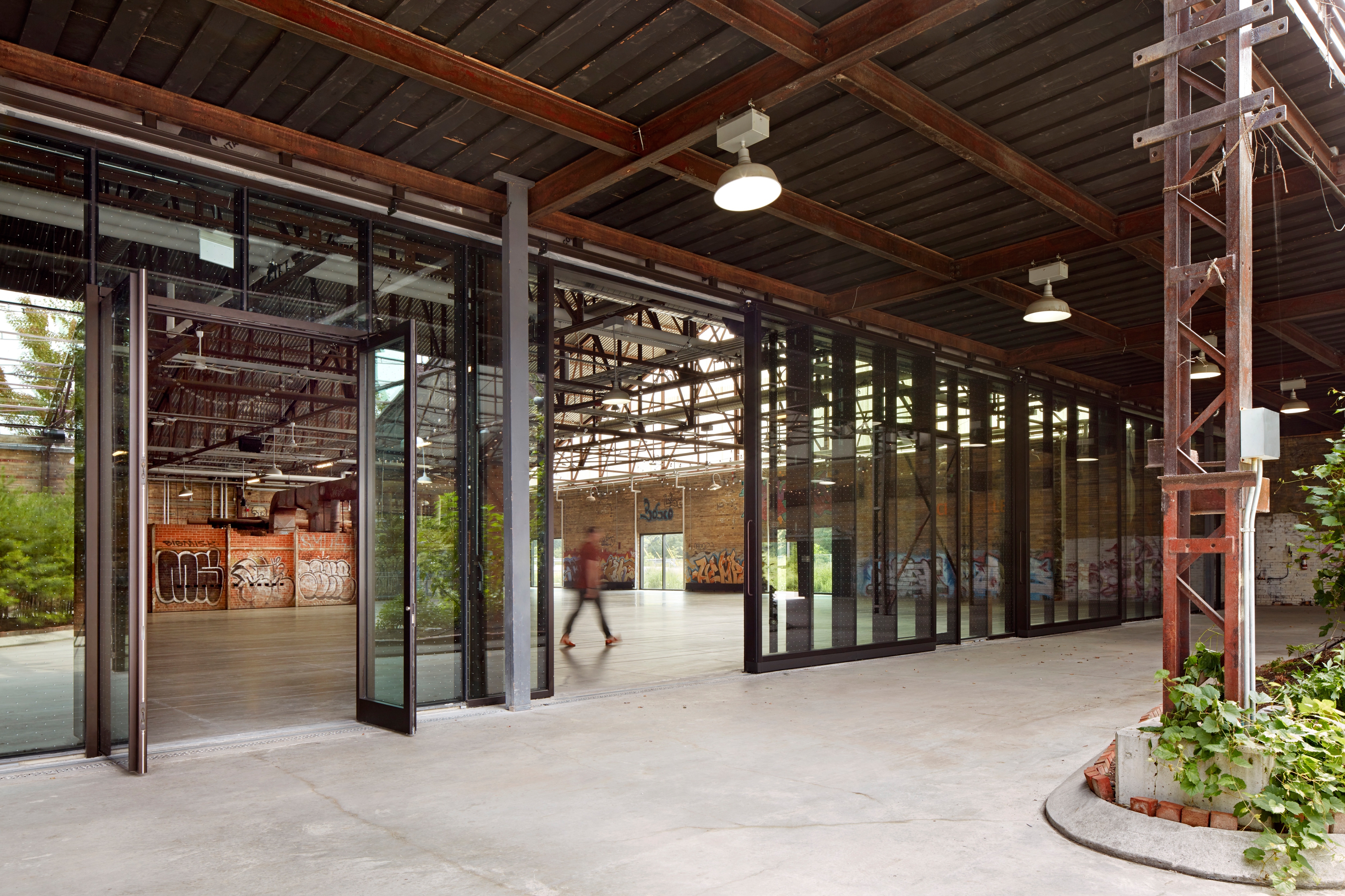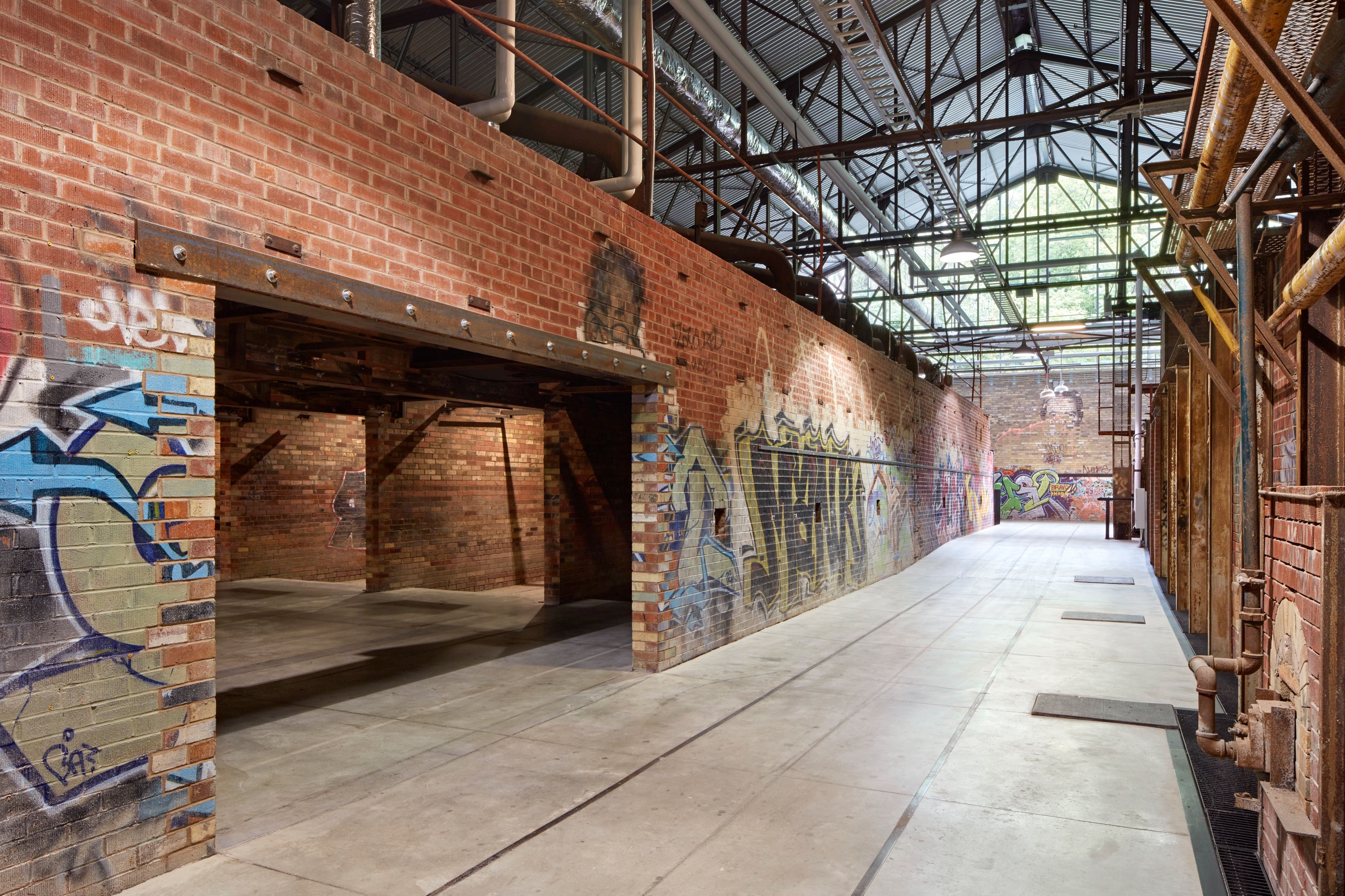 In one middle section, a grate surface gives visitors a glimpse of the original floor underneath. The team also addressed the factory’s abandonment by preserving its graffiti, serving as evidence of the evolution of urban street art over several decades, and its acceptance as a recognized form of contemporary art. Only one small area of the historic structure was significantly altered – a small section of wall was meticulously cut to establish an intimate exhibition space, the Kiln Gallery.
