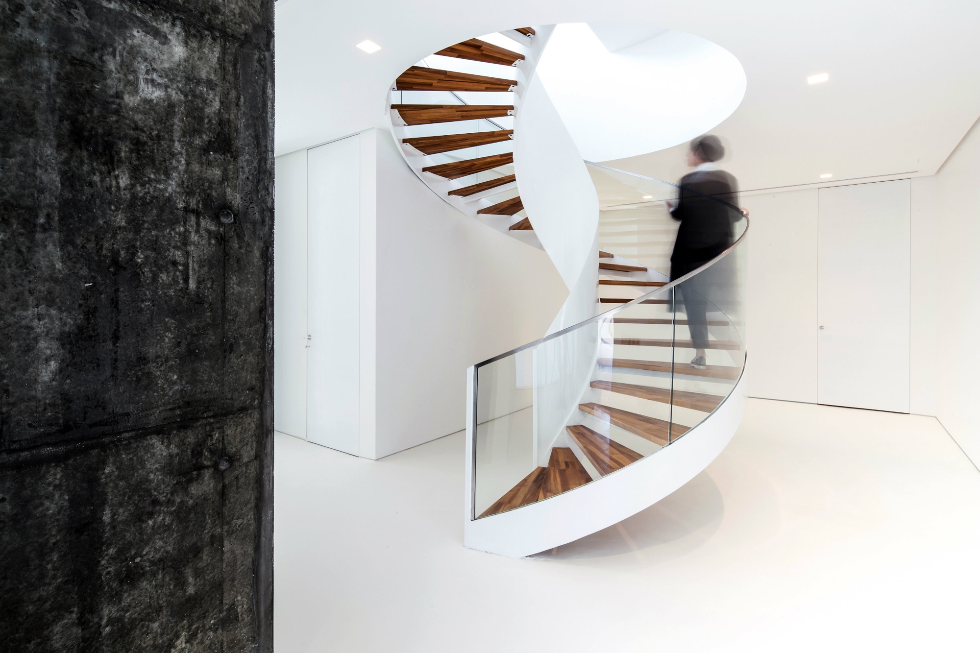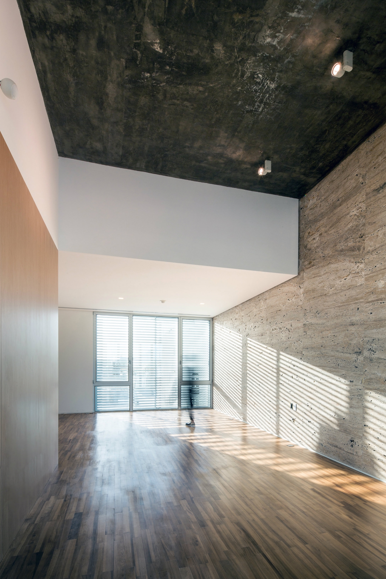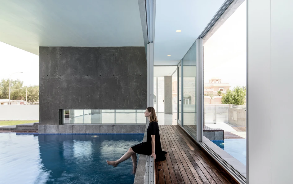 The first floor houses the private living quarters and is lit by panoramic windows on both sides. Aluminum louvers and deep recessed balconies offer effective sun-protection and mitigate the heat gain due to the large window openings. An austere palette of white plaster, exposed concrete and white epoxy flooring gives the social spaces a sense of ethereal openness reminiscent of an art gallery. The first floor on the other hand features solid teak wood and rough-cut travertine cladding giving the living spaces a warmer texture.