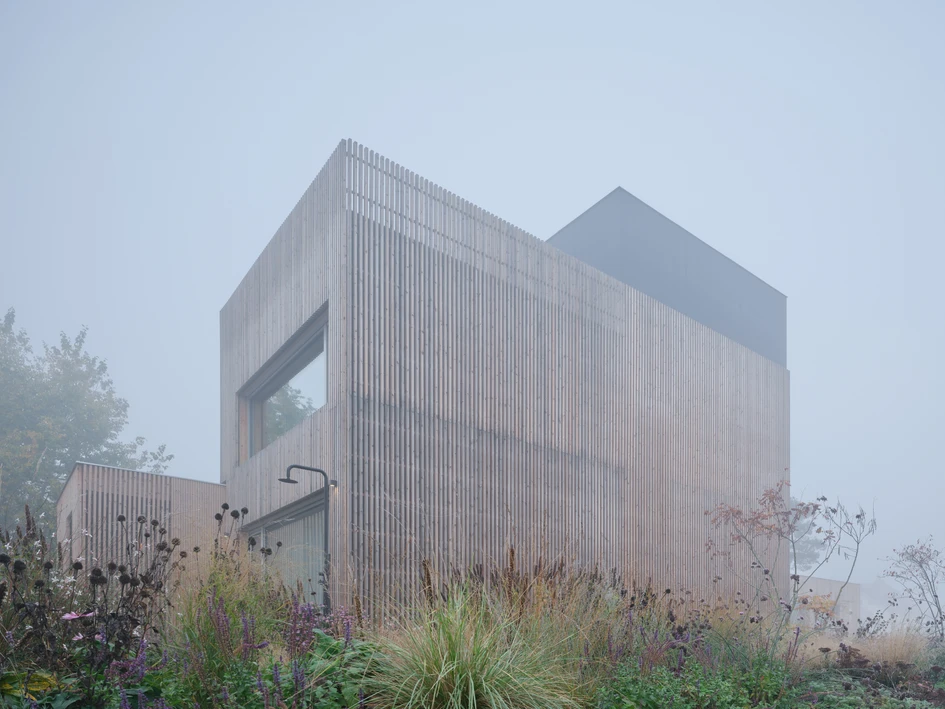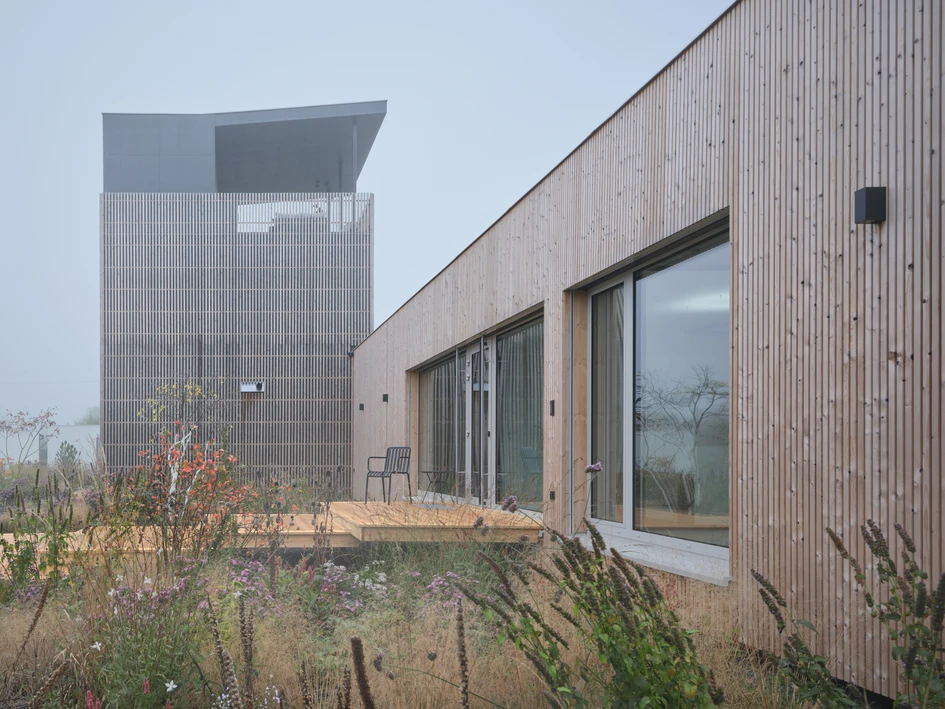 The wooden facades and green roofs integrate the buildings seamlessly into the landscape and surrounding structures. Greenery—ranging from trees and shrubs to perennial flowerbeds and green roofs—has a positive impact on mental well-being and helps regulate the microclimate. Energy self-sufficiency is achieved through photovoltaic panels with battery storage and an air-to-air heat pump system. Rainwater is collected in underground storage tanks and used to irrigate the extensive greenery throughout the site.