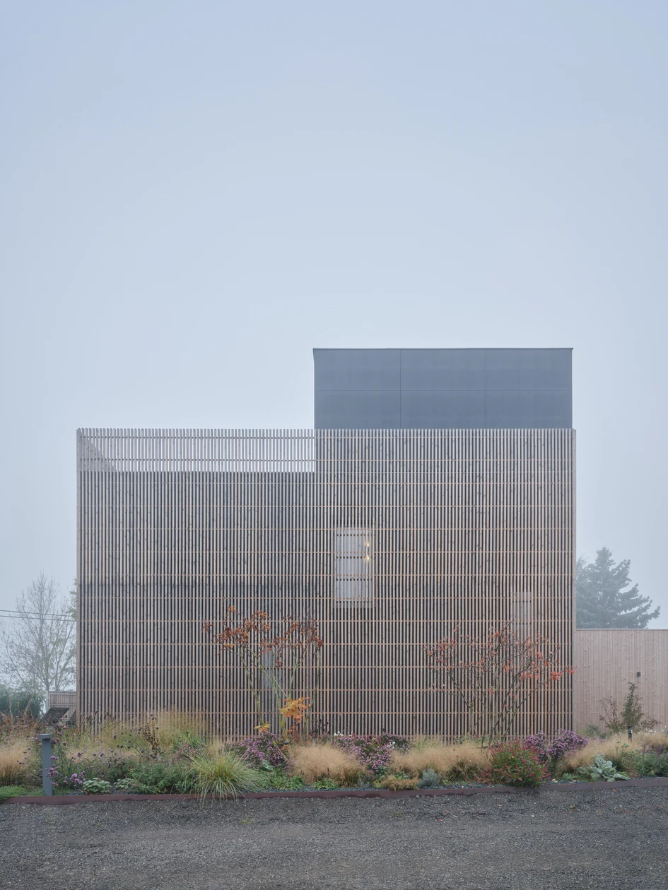 The adjacent residential building utilized the existing foundations of a former outbuilding, requiring customized architectural and structural solutions. The two-story building features a ground floor with a living area, kitchen, dining room, and two bedrooms on the first floor, connected by a solid wooden staircase leading to a library and a rooftop terrace. Facing the production area, the house is compact with windows concealed behind a slatted facade, while the ground floor opens generously to the courtyard with a pond and sauna module. Views from the upstairs bedrooms and the rooftop terrace extend into the picturesque landscape.