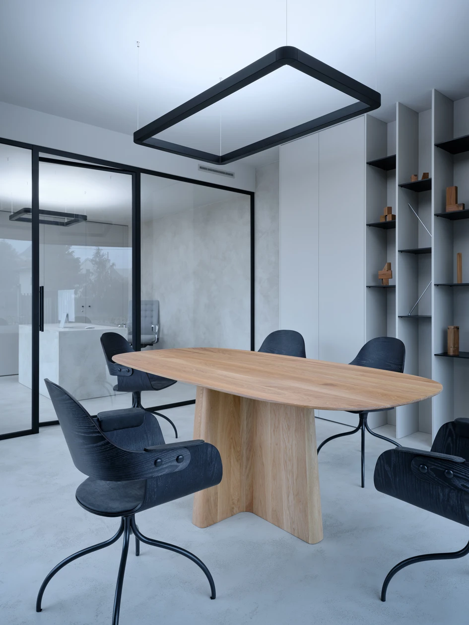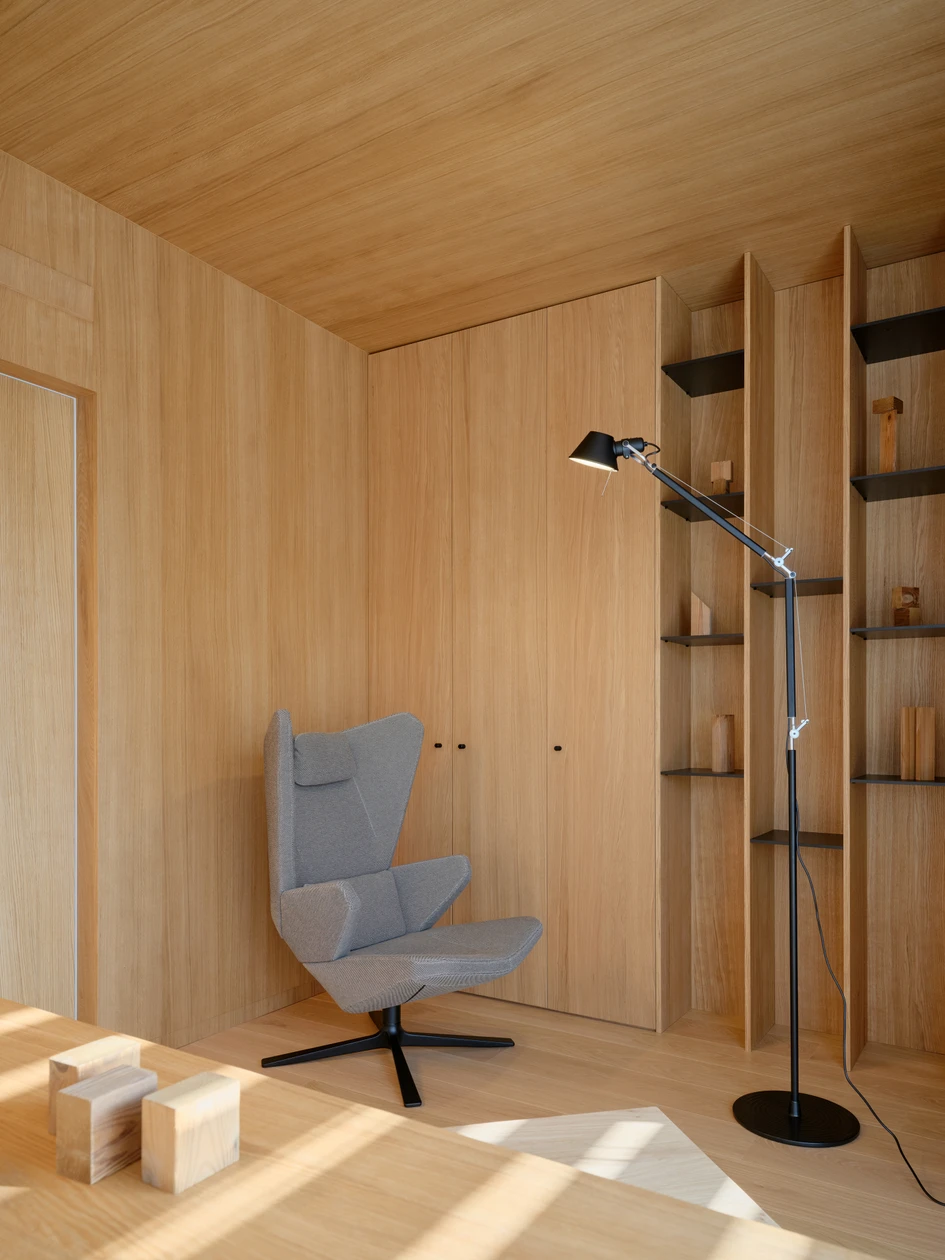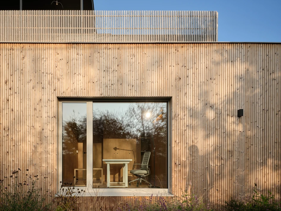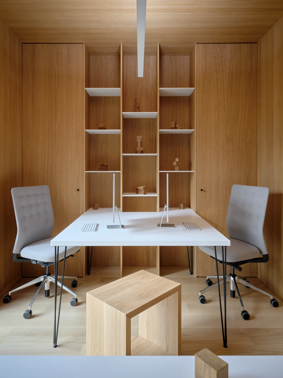 The interiors of the family home and offices emphasize the warmth and softness of wood. In communal office spaces, wooden elements paired with monochrome screed floors form an elegant composition. Large-scale glazing connects the interiors with outdoor greenery while also allowing passive solar heating. During summer, the interior is protected by screening shades and external blinds. Glass partitions and pivot doors enhance the sense of airiness and spaciousness.