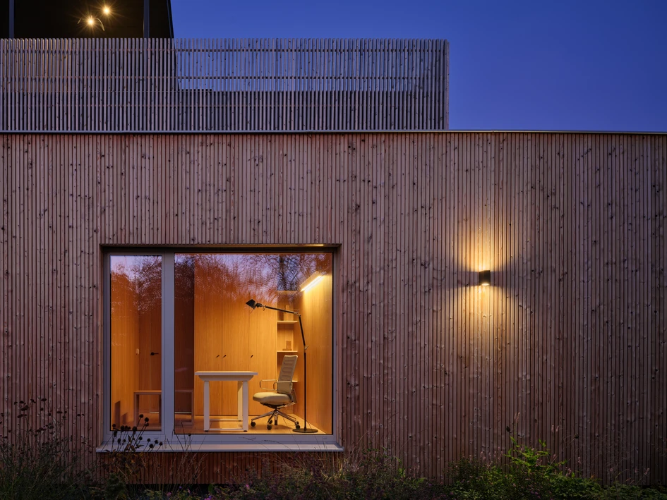 The long, dominant horizontal office building screens the production area and shields the ground floor of the family home from noise along the service road. The residential structure is designed vertically, creating a dynamic contrast between the interconnected buildings and adding an intriguing spatial break to the site. With wooden facades and green roofs, the minimalist ensemble reflects the company’s philosophy of simplicity, efficiency, and sustainability.