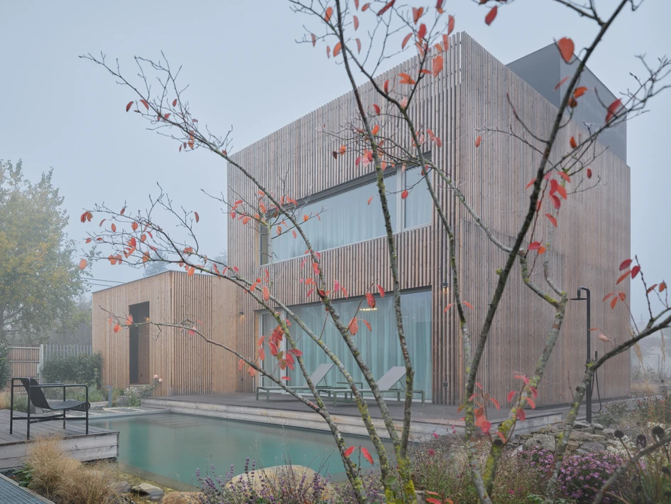 The sauna, equipped to a high standard, and the outdoor pond offer spaces for relaxation throughout the year, with the module also serving as a venue for garden parties.