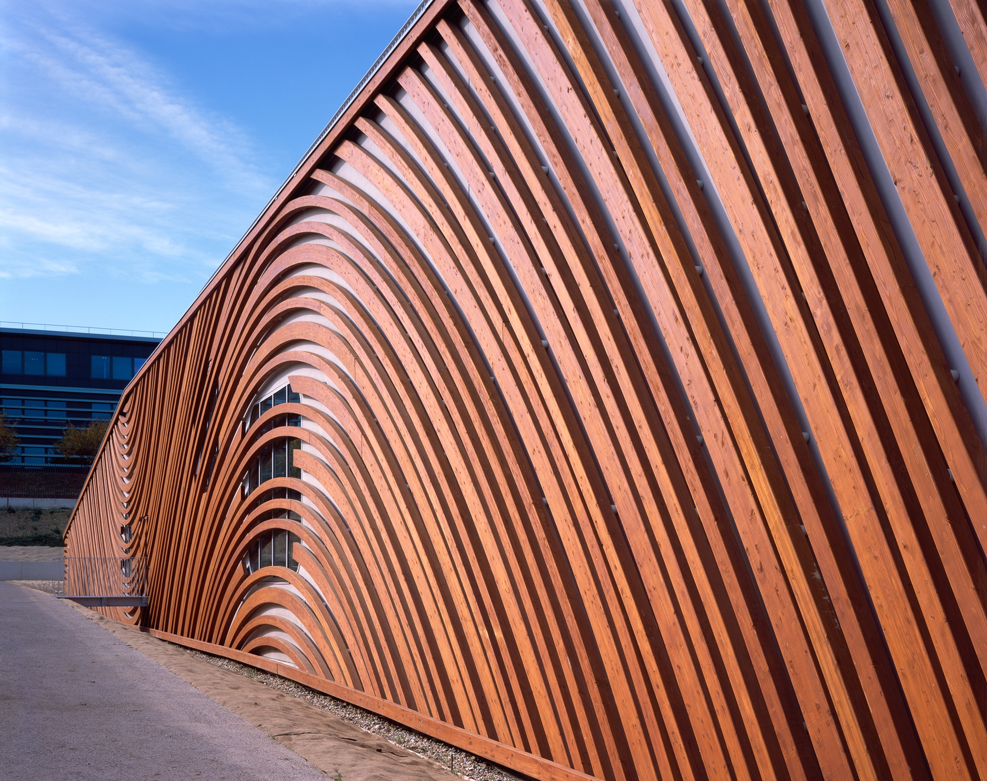 We designed the building’s envelope to attenuate the linear effect of the massing and to introduce a variation in the visual perception according to the viewing angle. All the external walls are faced with undulating golden wooden slats that recall the circular movements on the surface of water and make reference to the circulation of energy and flows: the Feng Shui.