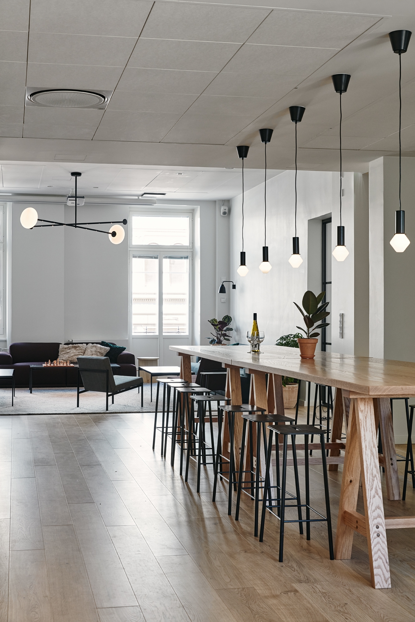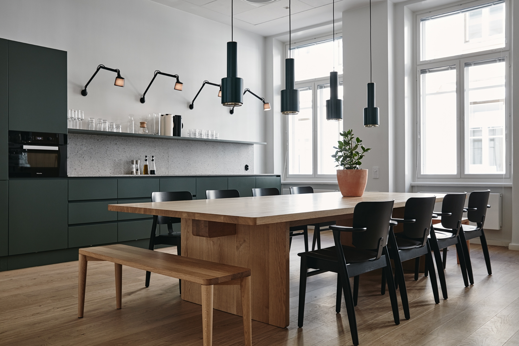 For Fjord Helsinki, it was important that most materials and pieces of furniture were of Finnish origin – without being too explicit about it. Meeting rooms are furnished with Artek Rival chairs and living rooms’ large carpets are from Woodnotes, whereas Knoll’s Womb chairs were designed by Finnish designer Eero Saarinen. Living rooms’ large lamps are called PJ01, and they were designed by Joanna Laajisto and designer Pasi Kärkkäinen. The green kitchens blend in with the natural materials, and they were furnished with Ilmari Tapiovaara’s Domus chairs as well as oak tables and benches from Nikari.