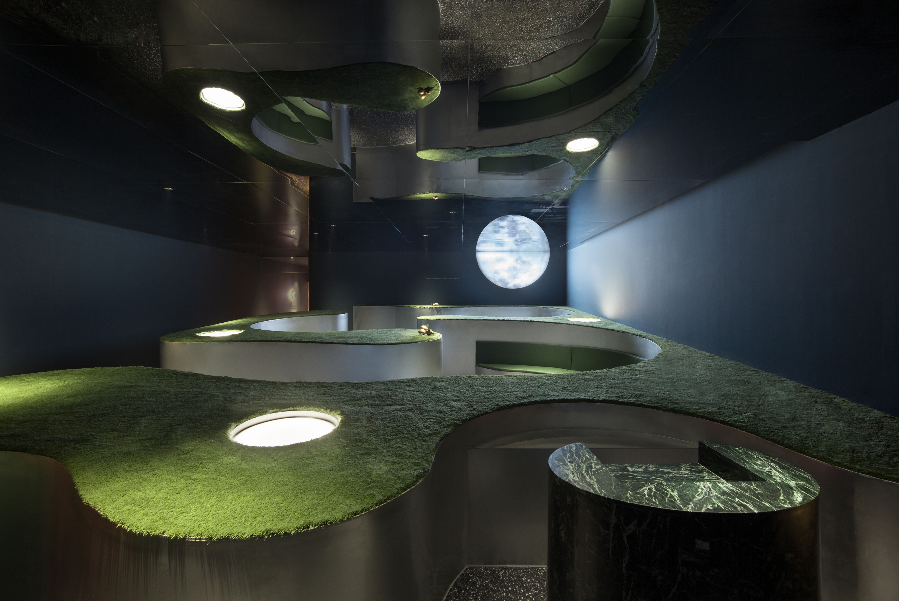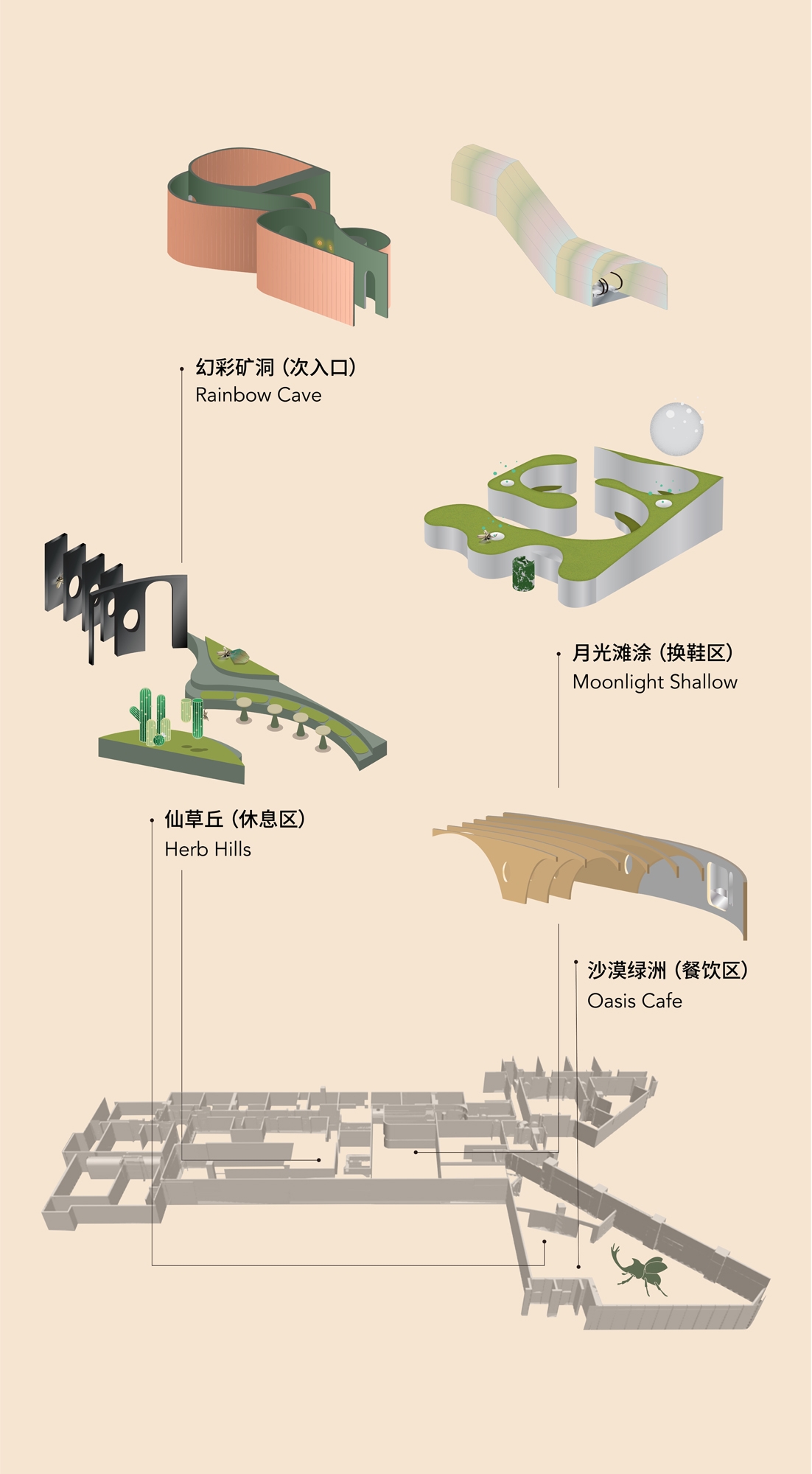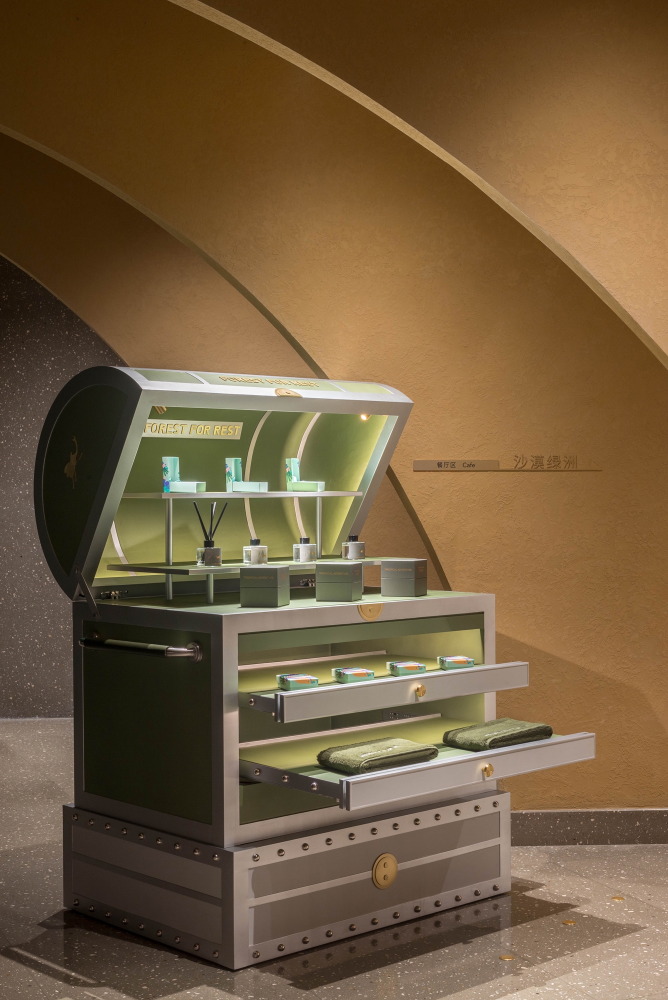 The project is situated at a popular pedestrian shopping street in Chongqing. Set on the third floor of a shopping mall, the space can be directly reached via elevators. The entrance area features several curved walls, providing customers with multiple paths to enter the inside areas. It refers to the desert in the beginning of the journey to explore the forest wonderland. The layered curve shapes echo the city's unique mountainous terrain, so as to resonate with both the local customers and those from other cities. The showcase for displaying and selling related products is placed beside the curved walls, looking like a treasure box that brings a surprise to travelers in a desert oasis.