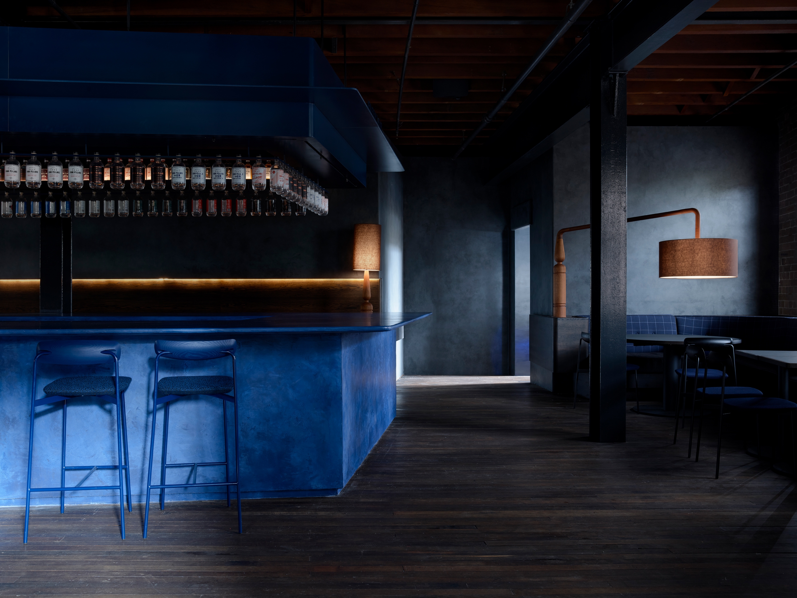 The pinnacle of the Four Pillars Sydney experience, Eileen’s Bar, is accessed via a separate door on the corner of Fitzroy and Crown Street. The giveaway is the four dots projected on the doorstep plus a single copper brick and copper-etched door handles displaying the logo. A Pandomo-finished bright blue staircase leads to the bar’s centrepiece: a V-shaped bar with blunted corners spanning 11m in length within the centre of the 112-person venue (including the Gin Lab). Its vivid ‘juniper berry blue’ tone (a mix of dried juniper berries and Four Pillars navy) exudes a slight sheen under a crown of illuminated gin bottles – an aesthetic alternative to vernacular speed rails. The bar module itself was designed in collaboration with the Oslo-based bar design agency Behind Bars. Its bespoke stainless-steel units forged in Italy integrate seamlessly within its generous surface width.