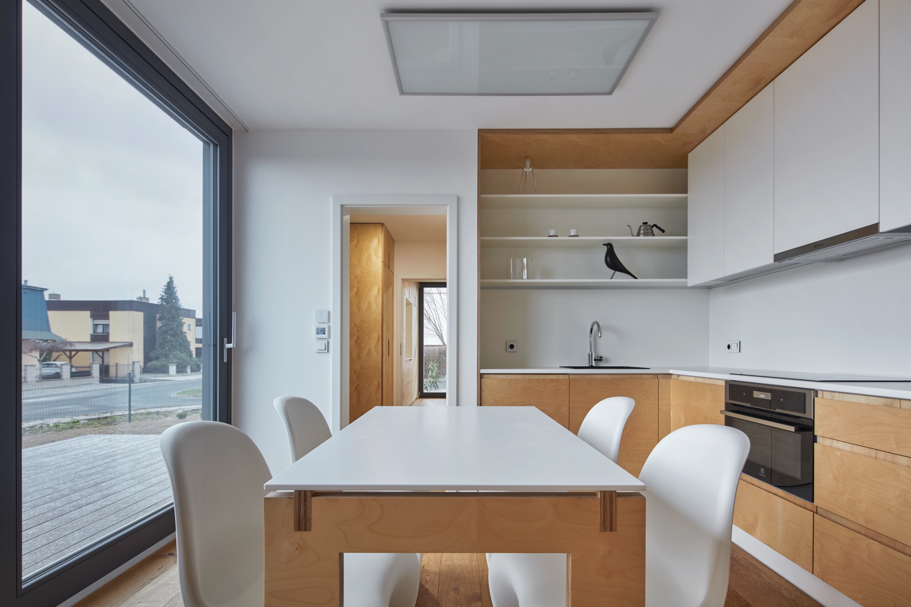 The “Sixty-one” is 95% wooden. Its bearing structure is from glued wood and has exact joints made according to a Swiss patent. Exact milling of the joint into the shape of a trapezoid are made very simply and their strength is immense. The insulation consists of wood fibre insulation panels that have a beneficial faze shift of day – night. The facade is diffusionally open, made of northern larch. The house is heated by radiant panels, ventilated through local recuperation, and windows are wooden with a triple glass panel. The house sits on five ground foundation strips. The interior is white and wooden and reflects the main construction materials of the house. Furniture is made of birch plywood with hidden hardware, the flooring and staircase from solid oak.
