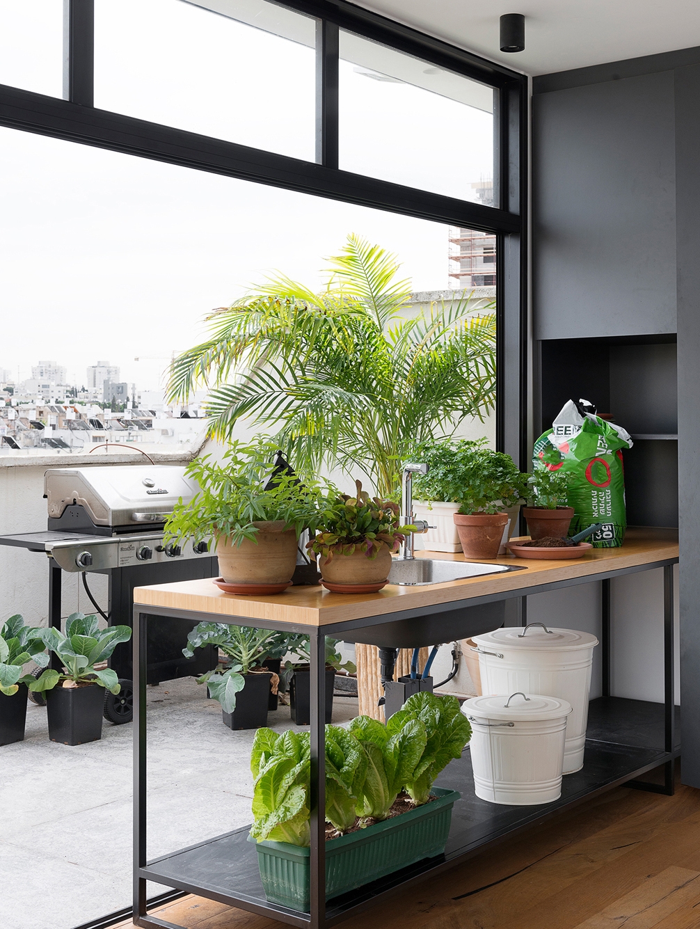 Spiral stairs made of black-painted steel lead up to the rooftop floor. This floor was planned mainly for hosting and work – a living space and open kitchen, beside a bedroom and washroom. Floor-to-ceiling glass vitrines were installed around the living space. The moving vitrines were planned so that one could open them completely and utilize the kitchen for outdoor hosting and gardening. The balcony was paved with “brutalist” cement tiles, and is mainly used as a green terrace for growing vegetables, organic herbs and ornamental plants.