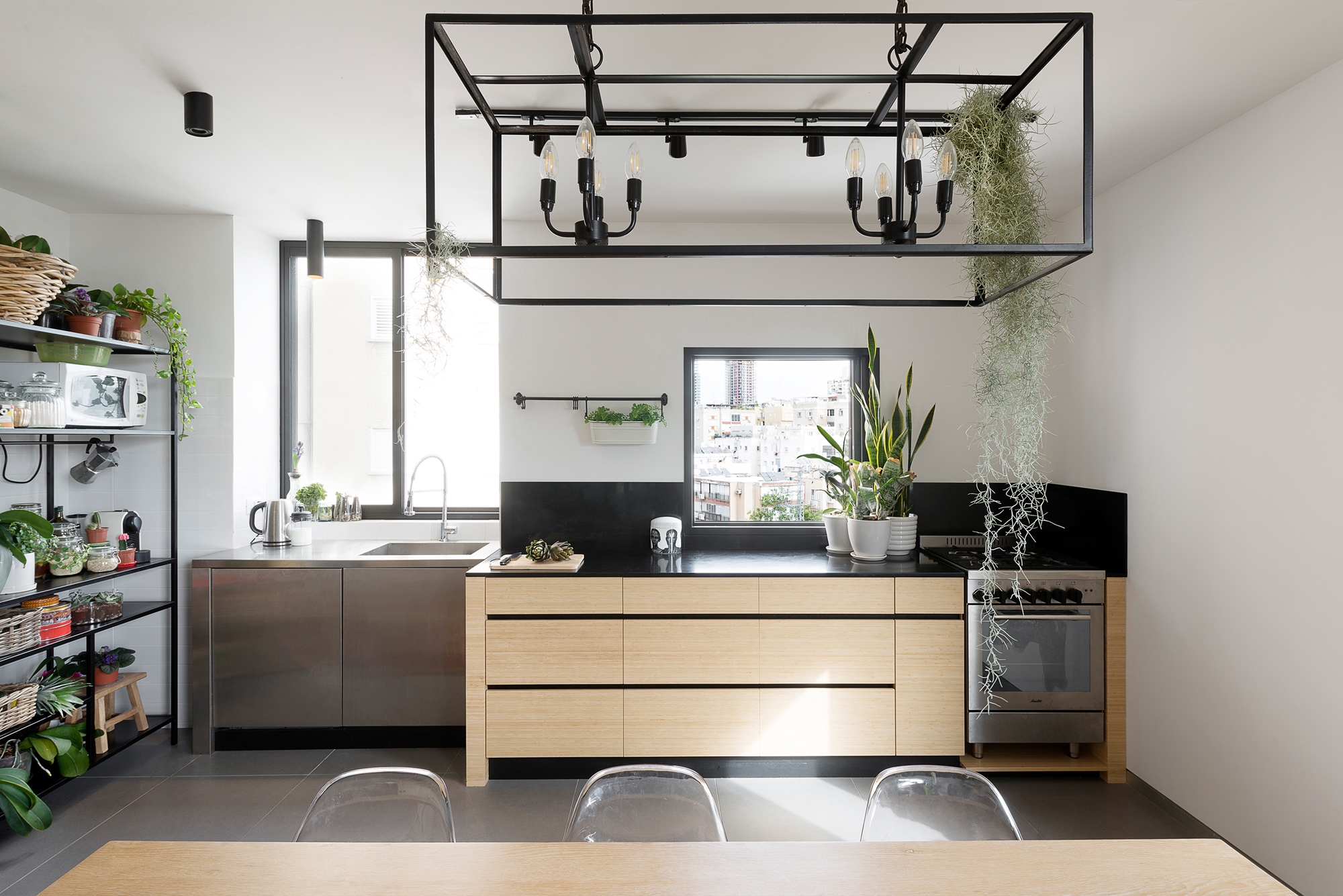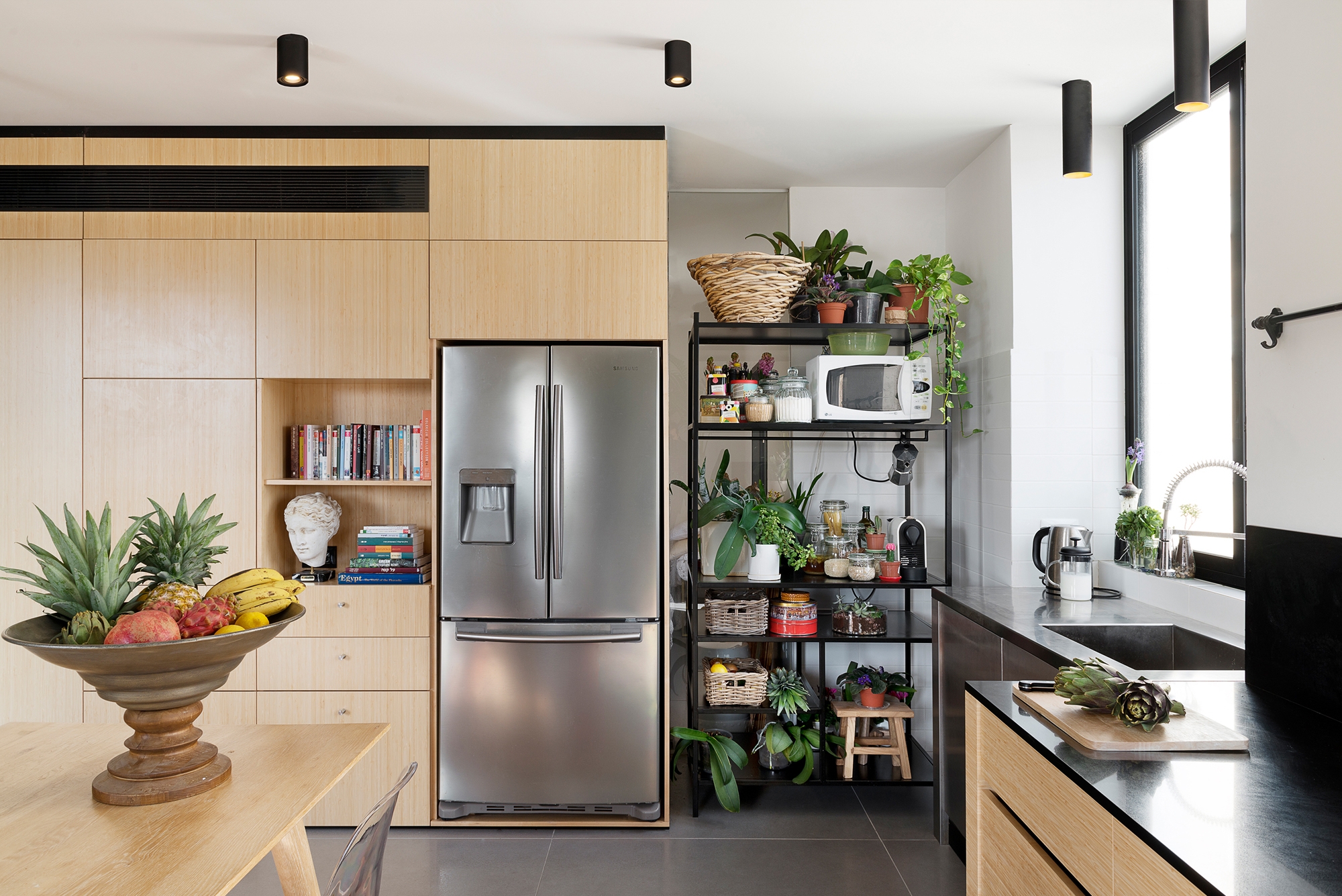 The kitchen was planned as different units set side by side, each of which has its own defined purpose, while between them a dining table is placed. A black marble surface sits on a custom-made wooden unit with legs, which contains cupboards, drawers and an oven. A custom-ordered stainless steel component is used as a “wet unit”, in which a sink and a hidden dishwasher are contained. Beside it we find an open storage unit for “freestyle” storage. The fridge nests inside the main closet.