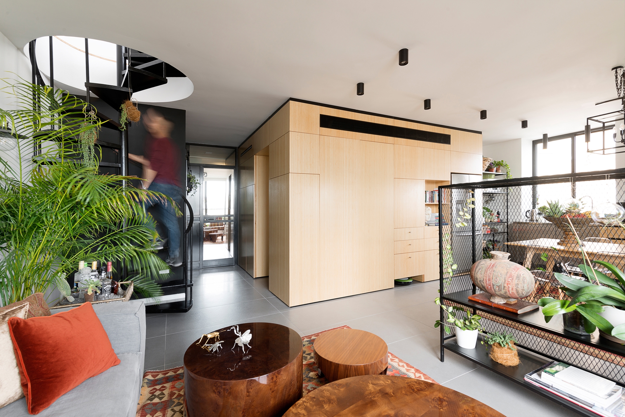 Before the renovation, the apartment had two bedrooms, a living room and a separate kitchen; the rooftop floor had a 10 m2 attic. The design concept for downstairs led to the creation of one unrestricted and functional space – by perceiving the structure’s enveloping walls as an outer shell for a domestic hub. Custom-made carpentry and welding units structure the inner space, as each function has a unit that “contains” it. In addition, 40 m2 of lightweight construction (steel frame and aluminium roof) were added to the rooftop floor.