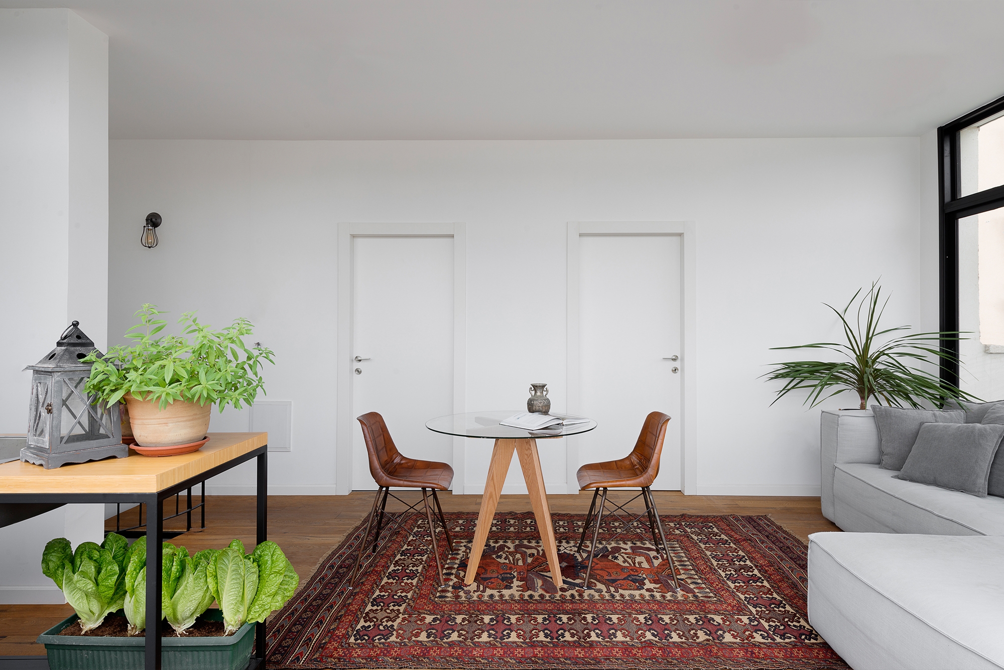 From the balcony, a crowded and densely populated urban view of Tel Aviv can be seen. This “White City” view contrasts the inner greenhouse effect. During the planning process, an emphasis was placed on natural lighting, the relationship between the “outer” public spaces and the “inner” private spaces, as well as interior. Every item in the apartment was carefully selected: Leather chairs on an iron frame from the 1970s, glass tables, vintage lamps found in Athens, hand-woven carpets, Missoni textile, Andrew Martin upholstery, an earthenware pot from Tibet, an original oil painting from a private collection and more. The washrooms and bathroom serve as blue and turquoise focal points that break the wood and black theme--exposed to the main space once the door is opened.