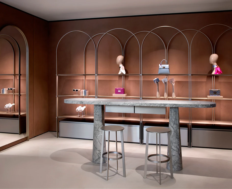 The flagship, consisting of two floors connected by a sculptural staircase, conceived as a series of essential yet distinctive rooms connected through sumptuous arched doorways.
