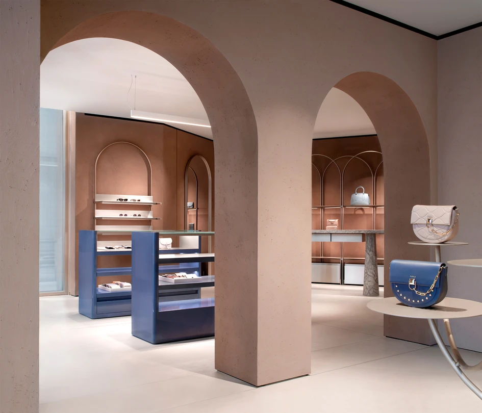 The recurring use of the arch inside the store celebrates the heritage of the brand, which was established in Bologna, famous in the world for its considerable porches. With its balanced combination of essential form and pure geometry, the arch, which also stands out in the architecture of the Furla Foundation’s palazzo, is also part of the new Furla logo.