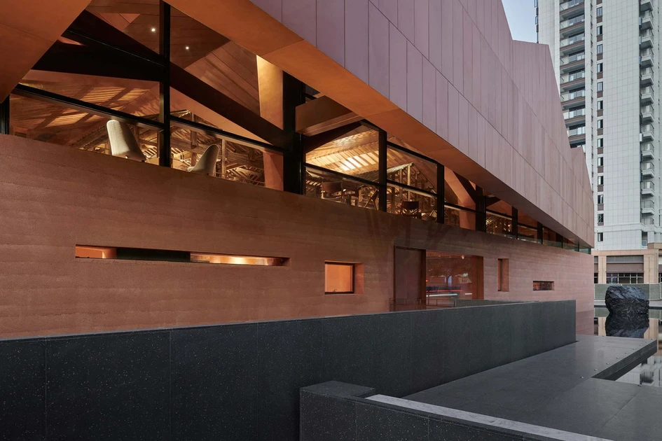 Envisioned as a house atop a rock, the teahouse is elevated above a rammed concrete base, while its sweeping copper roof echoes the roofline of the enclosed architectural relic. Its core material, rammed concrete, is a modern homage to the traditional earthen dwellings of the region, emphasizing a raw monumentality. Visitors are presented with two images of the building upon approach: the upright silhouette of the form, and its mirrored reflection duplicated in the surrounding pool of water.