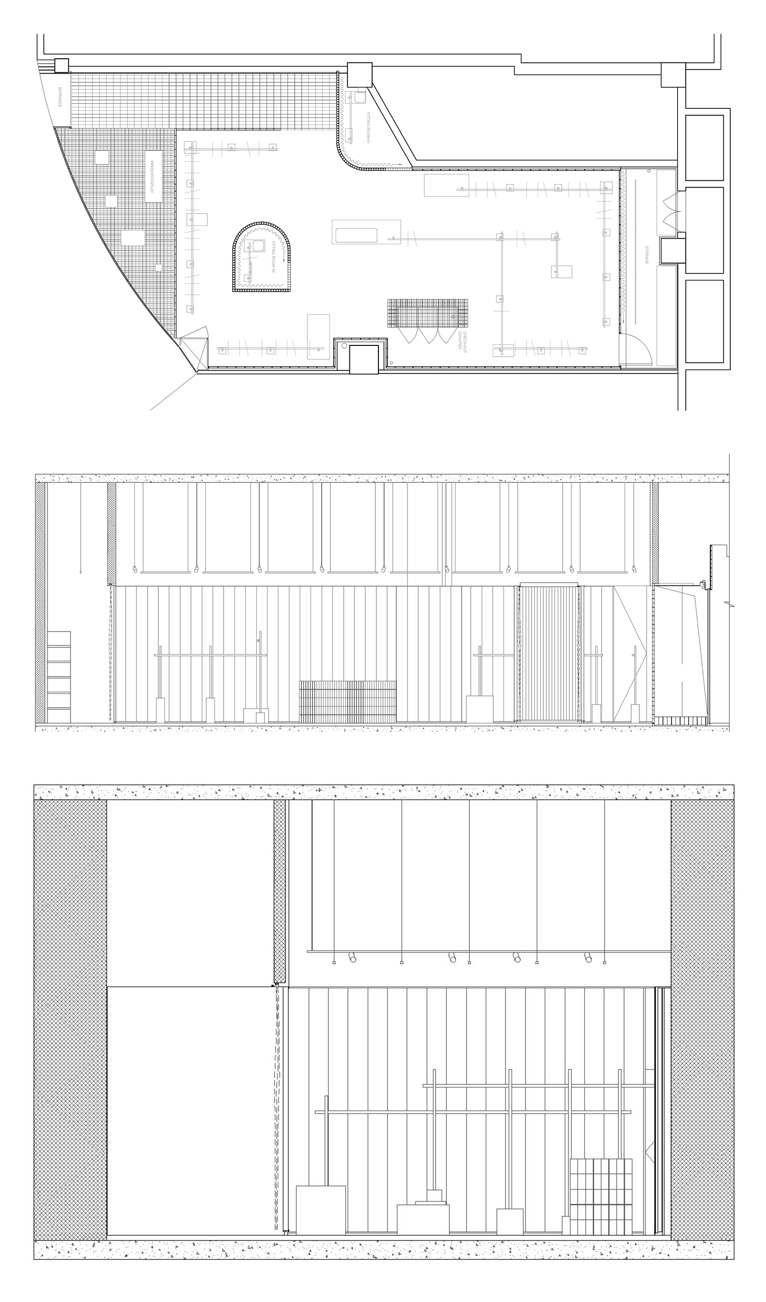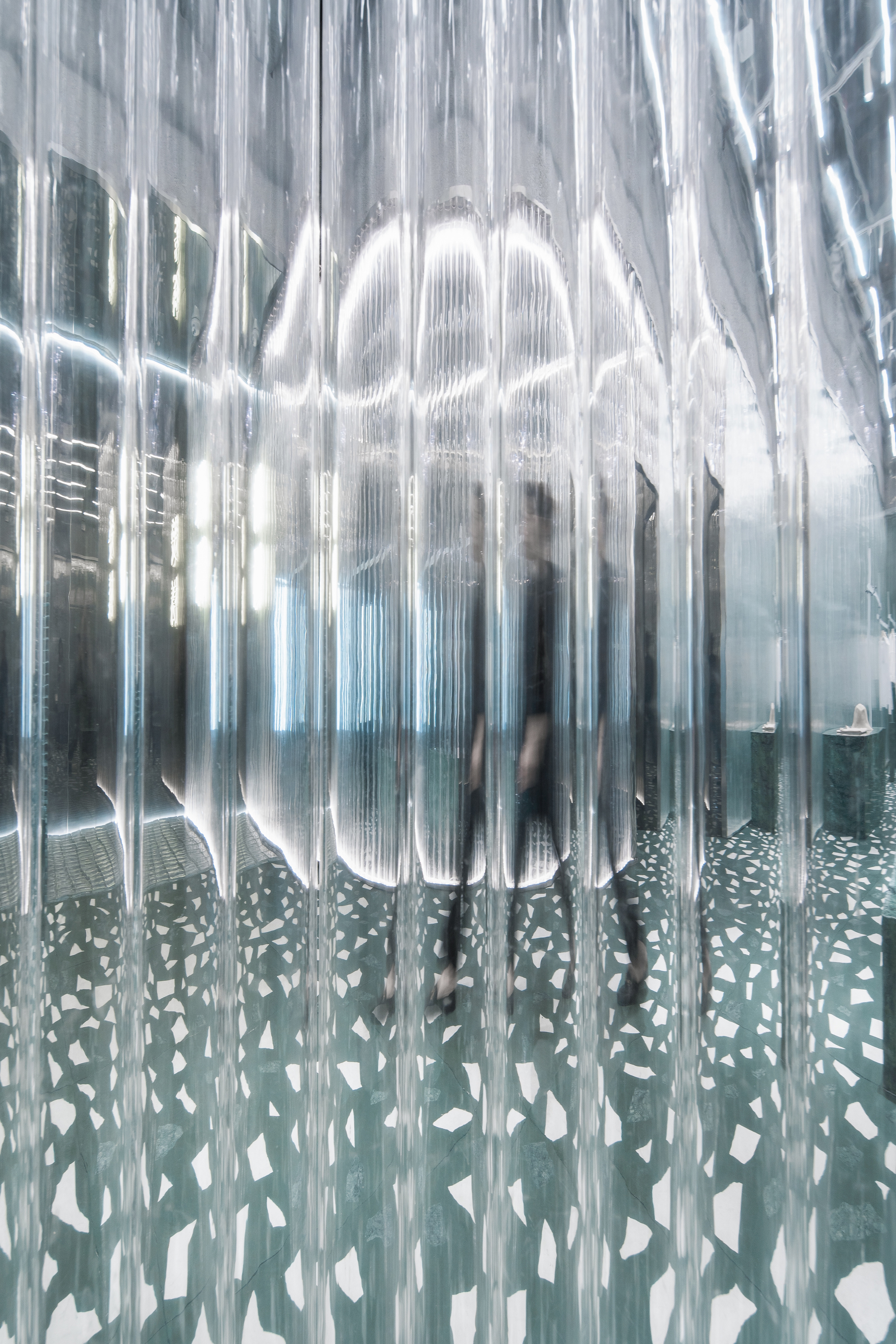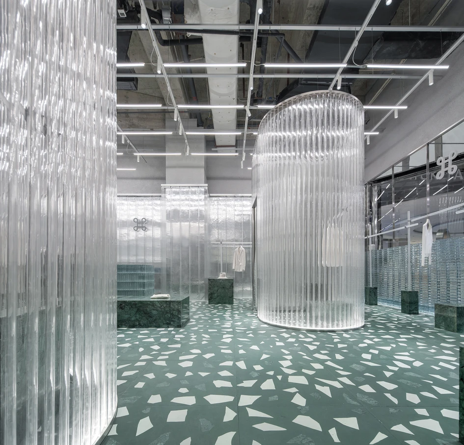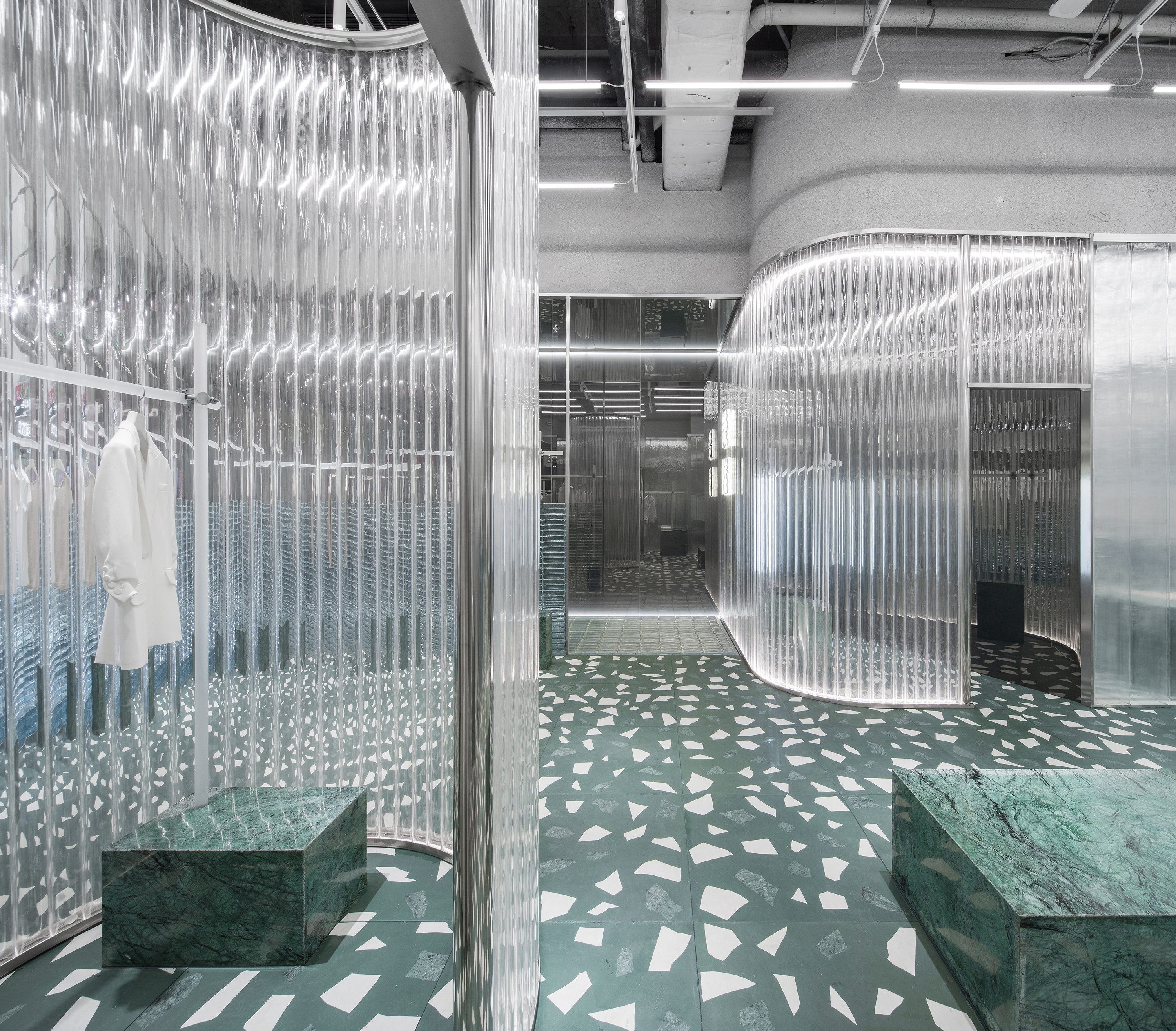 Through the corridor, passing the glass brick wall and into the store, channel glass is used along the walls, behind it lies silver mirrored material allowing hints of green to refract and reflect throughout the space. The acrylic-tube- enclosed fitting room is placed carefully in the middle of the space in the same manner of that of a small stage, inside it hangs the green velour curtain to ensure privacy as well as exuding performance like purposes; when the curtain is opened, the interior and exterior of the fitting room is faintly visible creating theatrical effect and drama.
