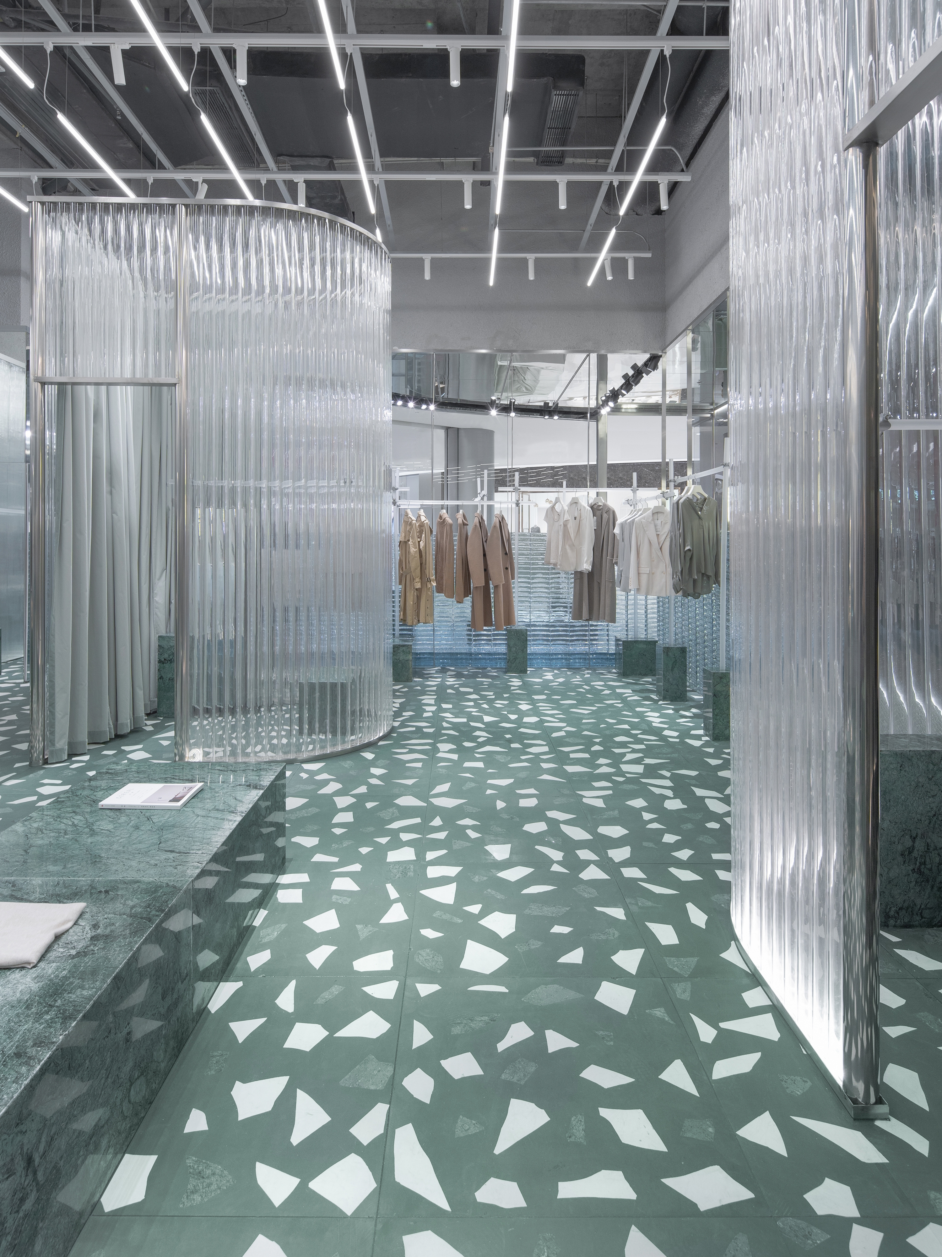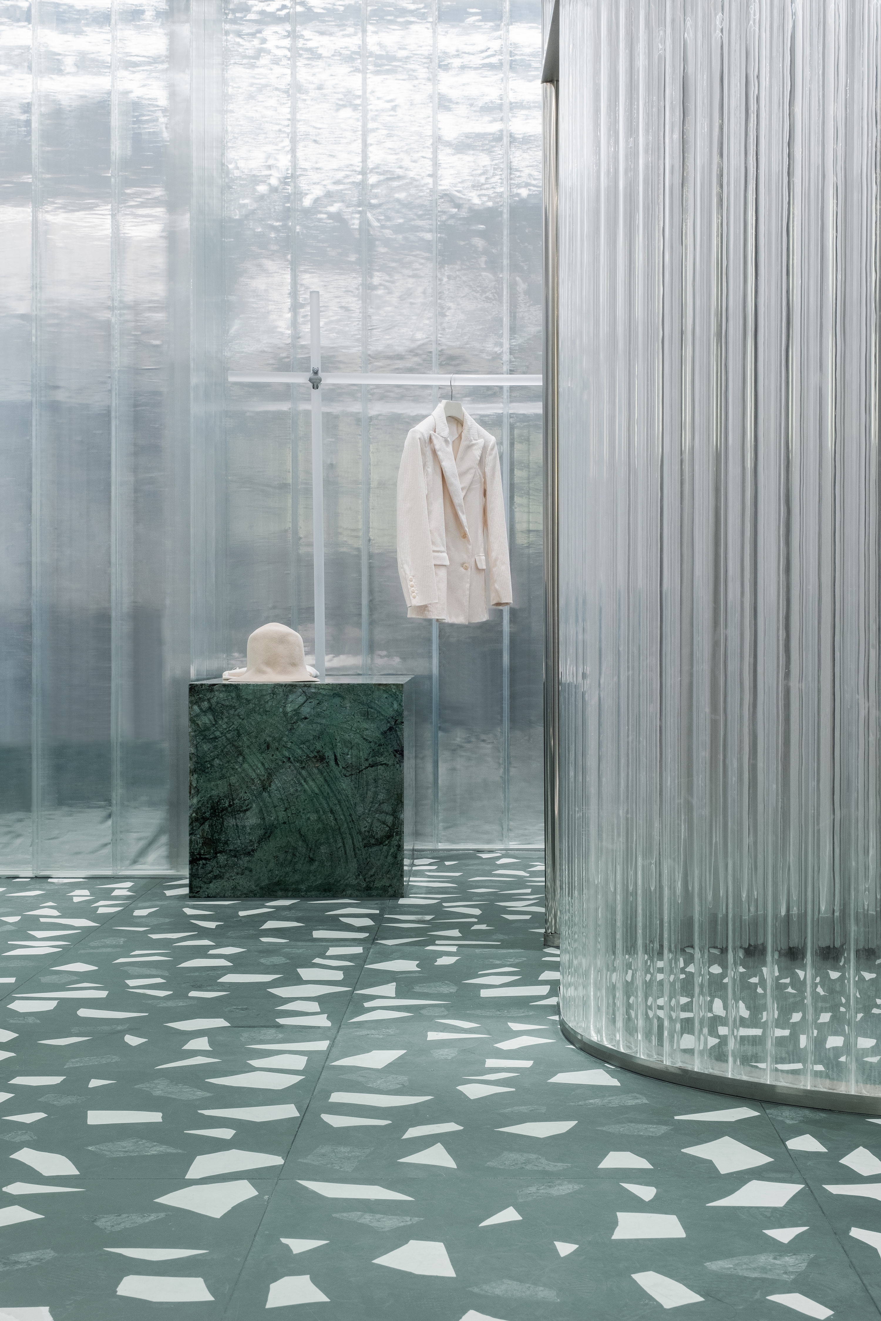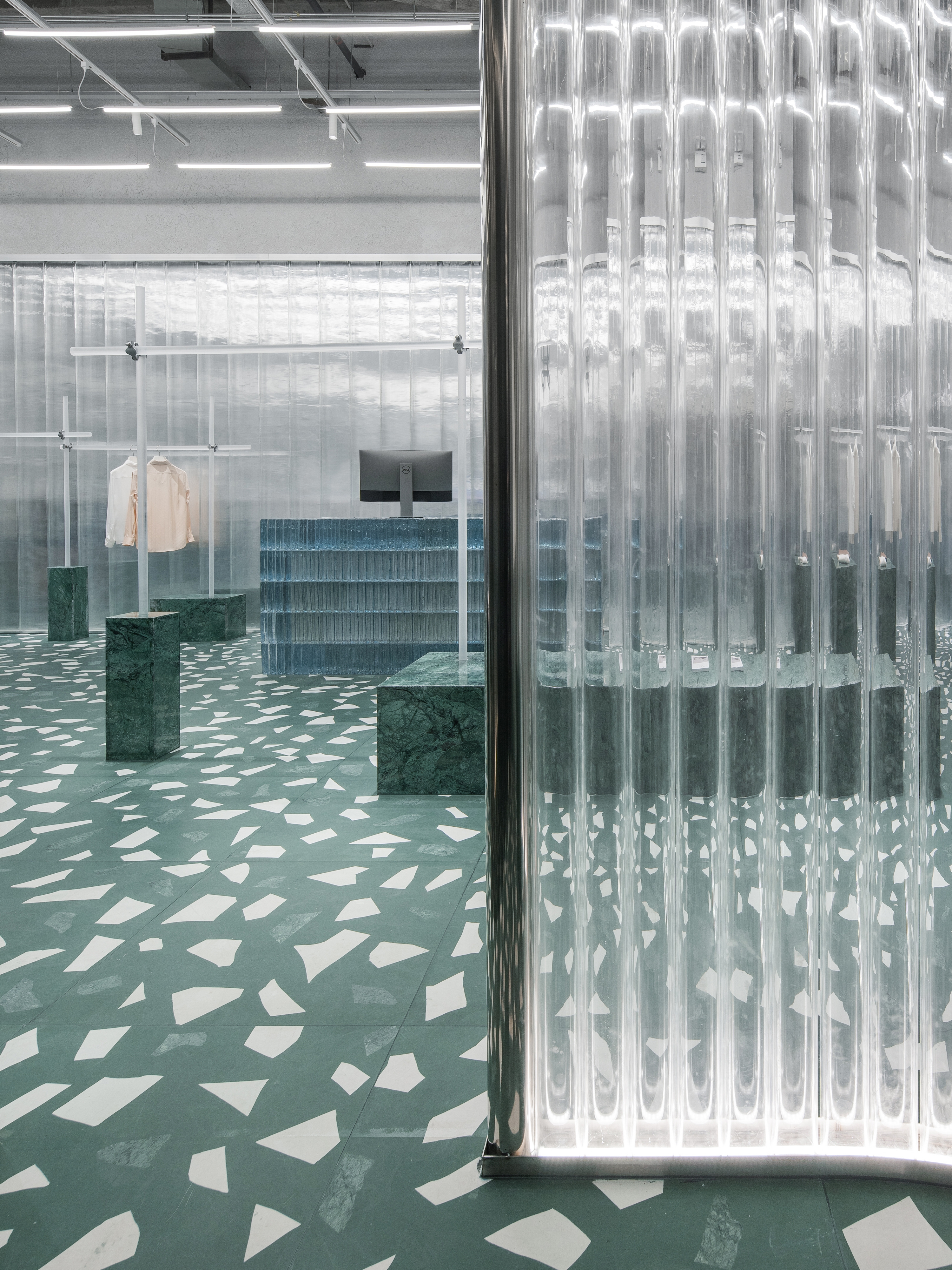 All garment hanging system is made of custom frosted acrylic rods connected with silver scaffolding metal joint that are highly adjustable and adaptable. The acrylic rods are set in a green marble base, which vary in size depending on their functionality as some are used as a display stand, bench or storage platform. The interior flooring is paved with custom greyish-green terrazzo embedded with large dark green and white marble aggregate, embodying the brand’s determination in material and craftsmanship.
